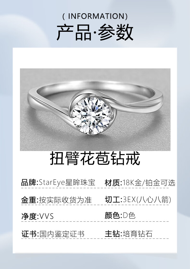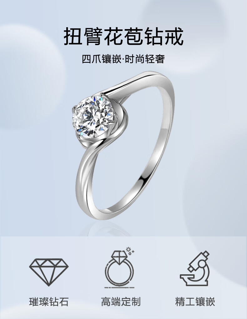 AVHE platinum diamond ring twisted arm four-prong diamond cultured diamond ring. Please order a wedding gift for Chinese Valentine's Day to express your love to your girlfriend. Platinum diamond ring + 1 carat D color cultured diamond.