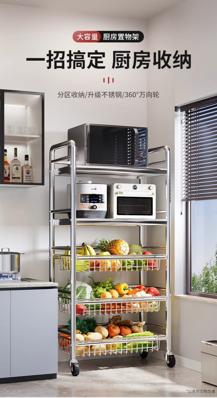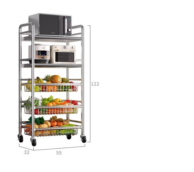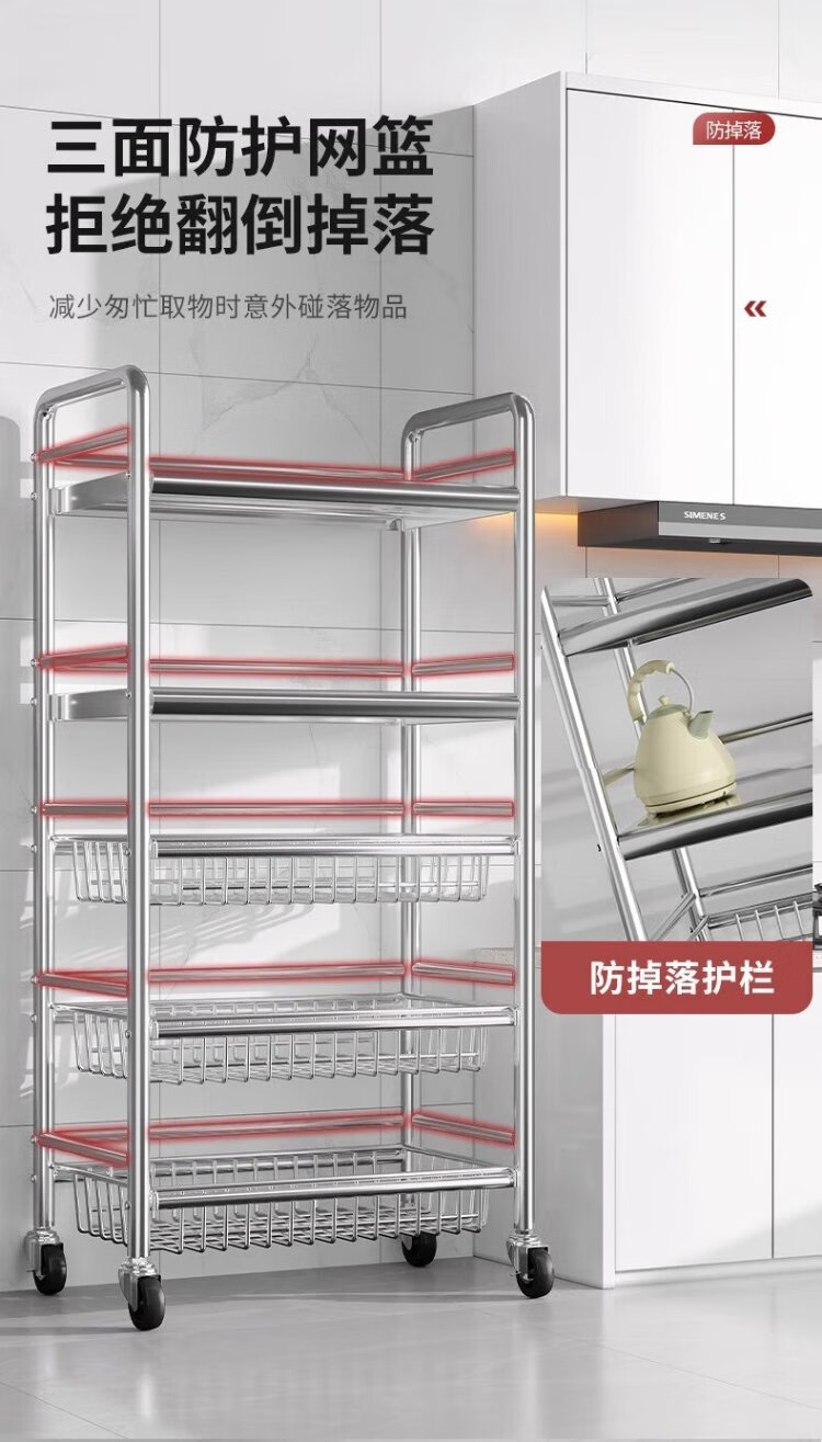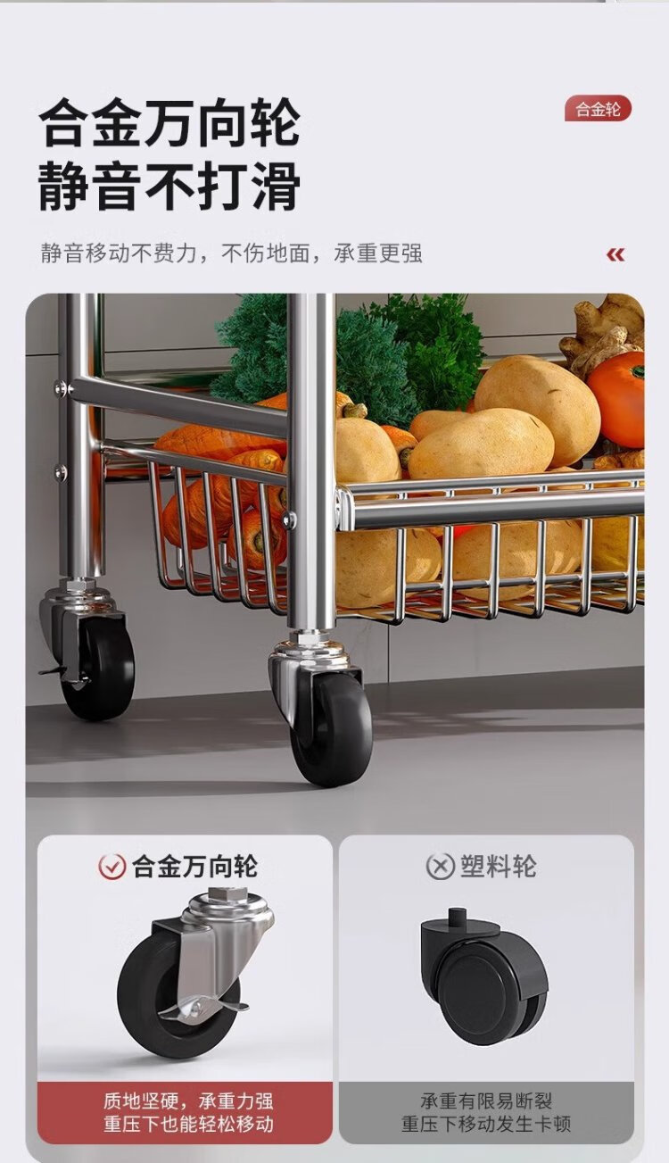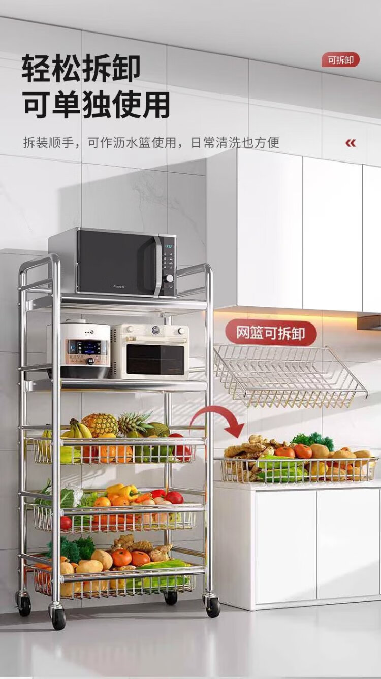 Taodehao stainless steel kitchen rack floor-standing multi-layer movable vegetable basket for fruit and vegetable storage rack trolley three layers丨three baskets without plates stainless steel