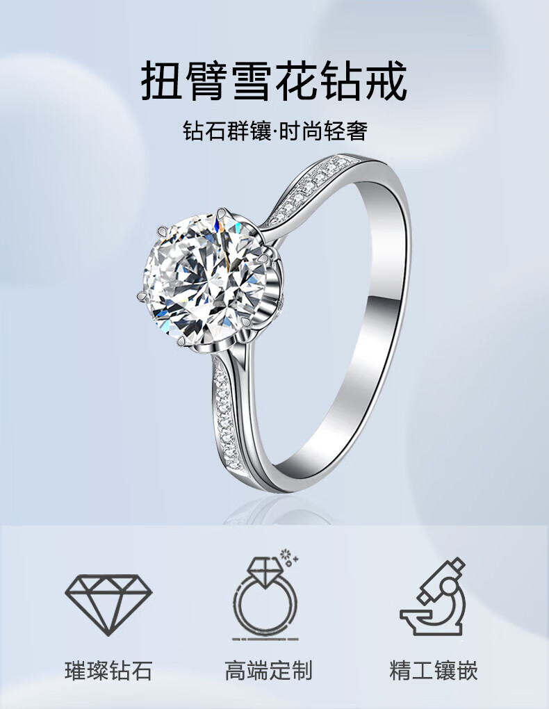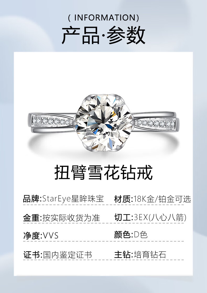 AVHE platinum double certificate cultivated diamond twisted arm snowflake diamond ring. Looking for a wedding gift for Chinese Valentine’s Day platinum for my wife. Platinum diamond ring-1 carat cultivated diamond D color/VVS.
