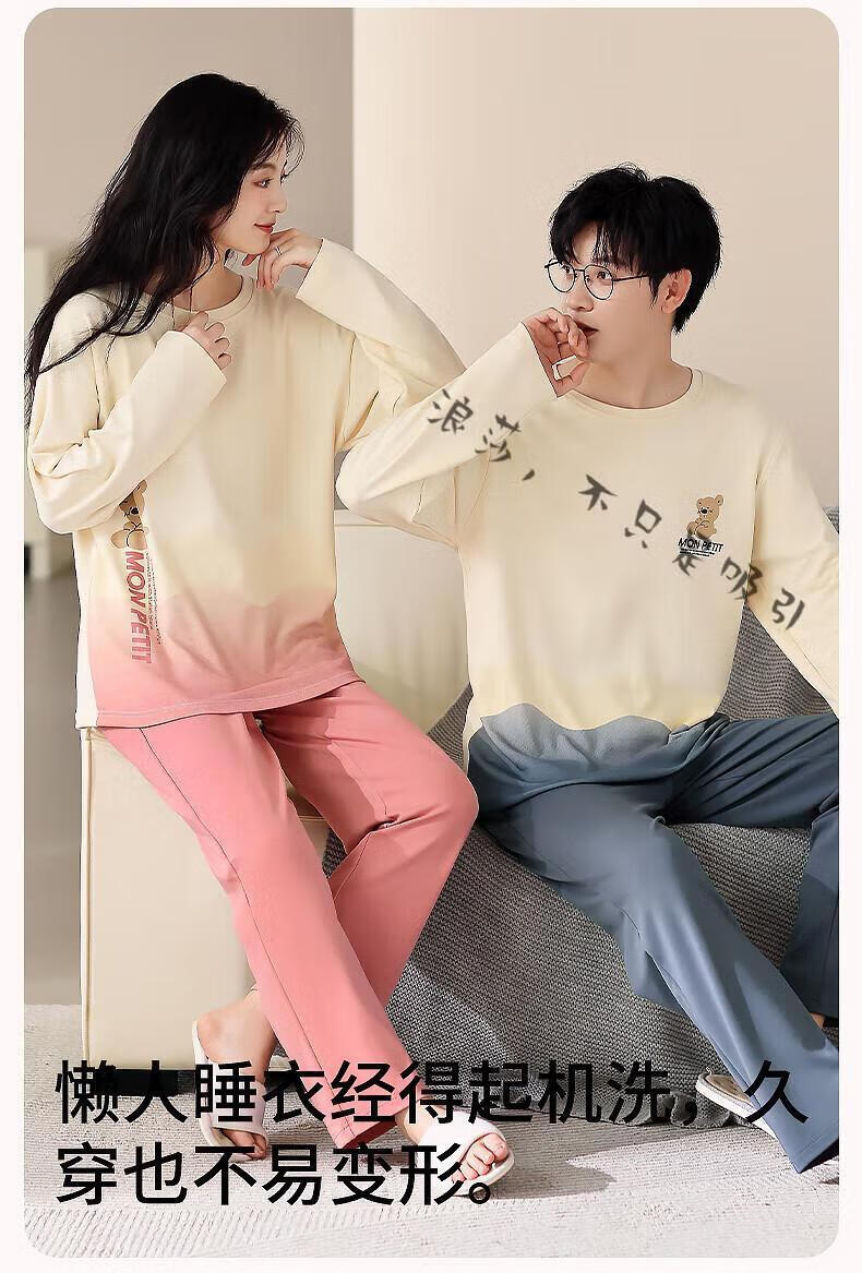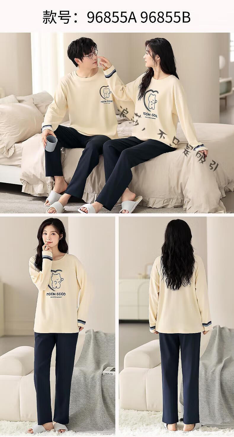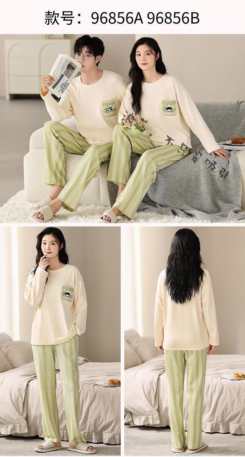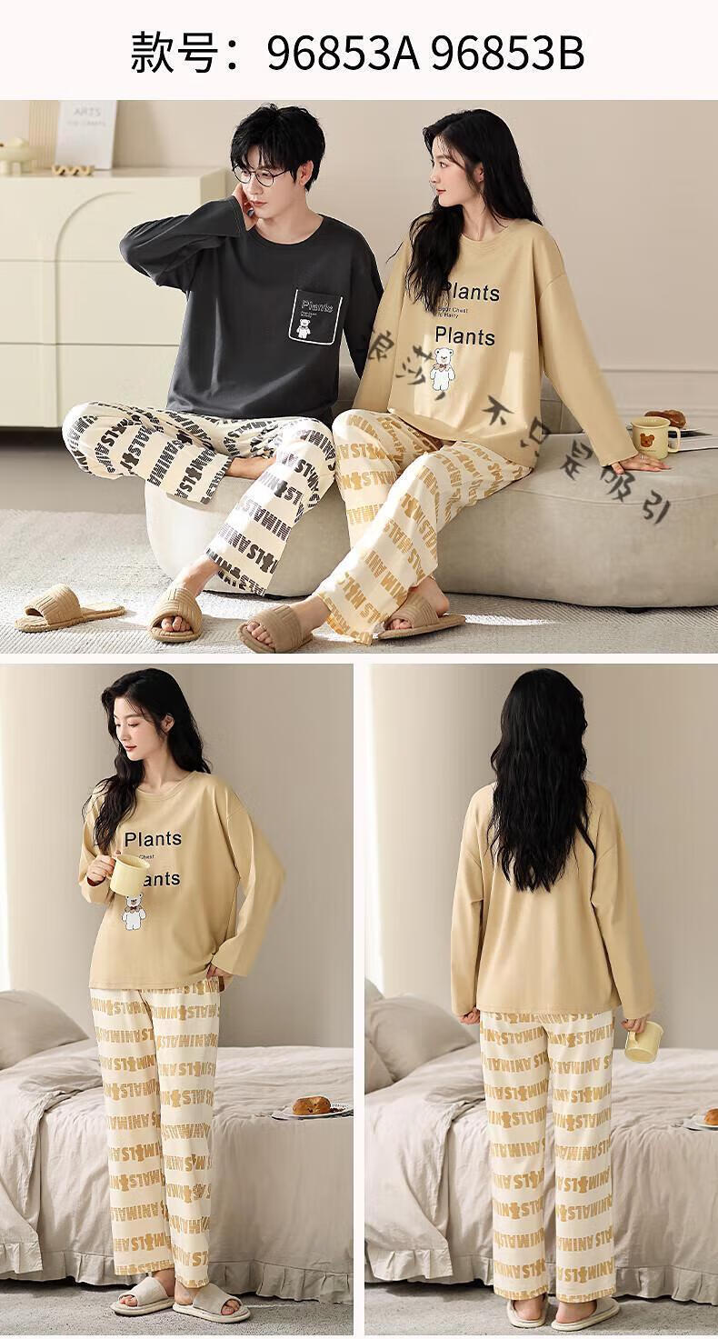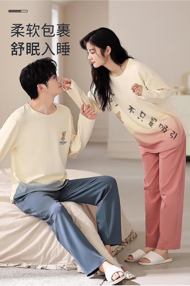 LangSha couple pajamas for one man and one woman in spring and autumn pure cotton round neck long-sleeved cartoon casual spring and autumn can be worn outside home clothes 96850 Female M + Male L