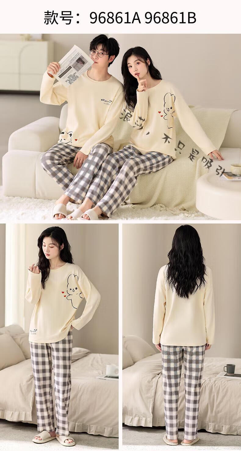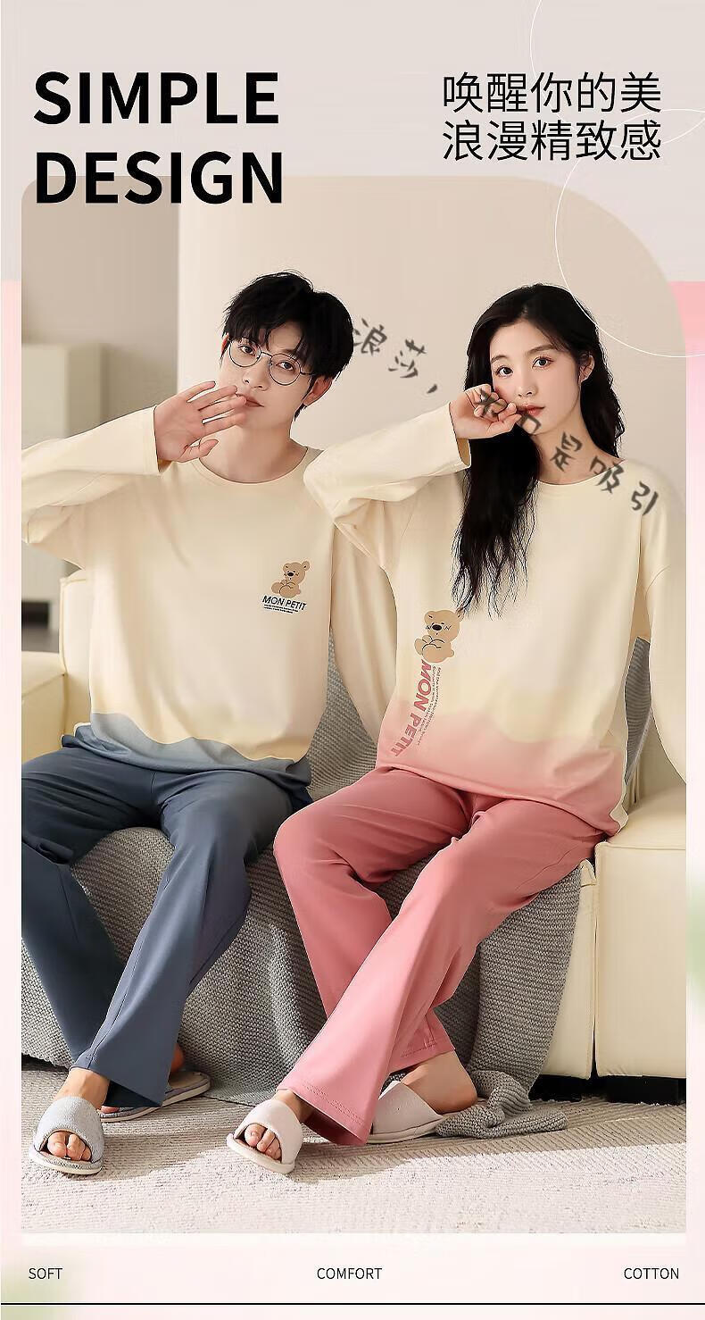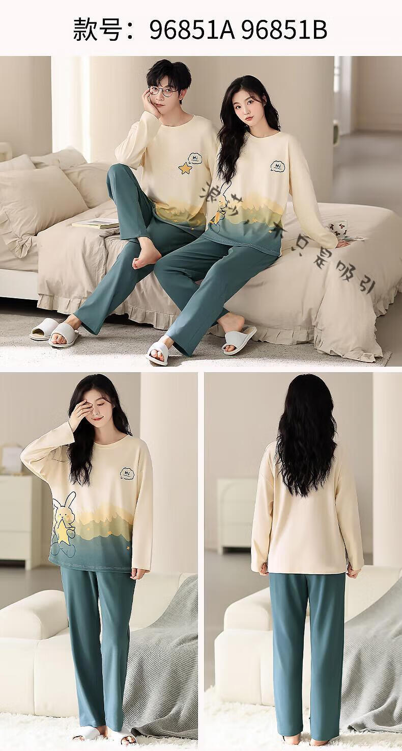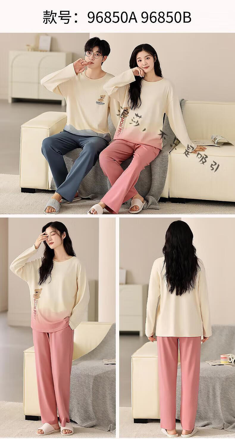 LangSha couple pajamas for one man and one woman in spring and autumn pure cotton round neck long-sleeved cartoon casual spring and autumn can be worn outside home clothes 96850 Female M + Male L
