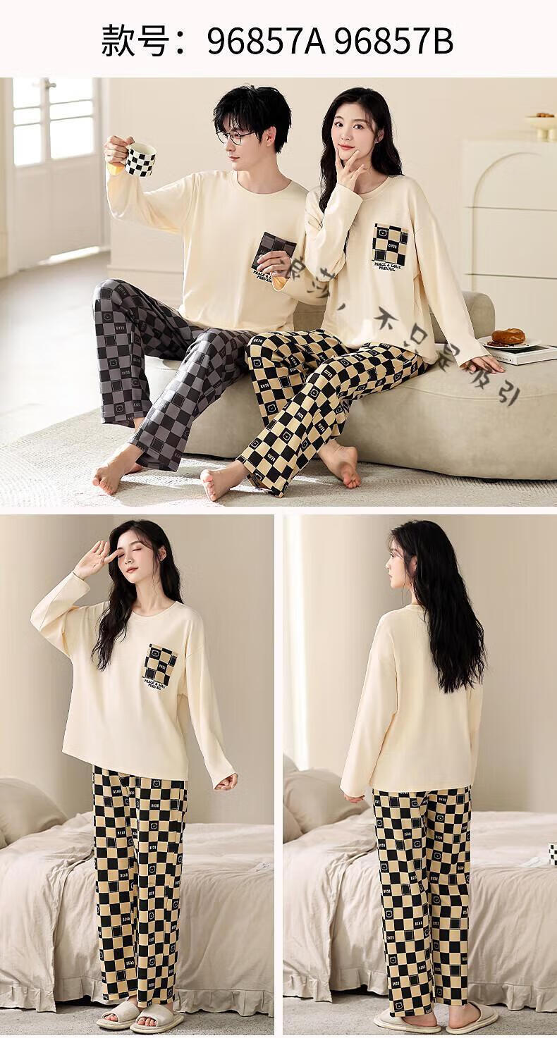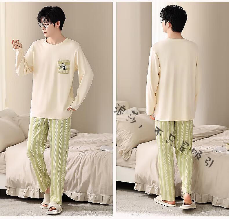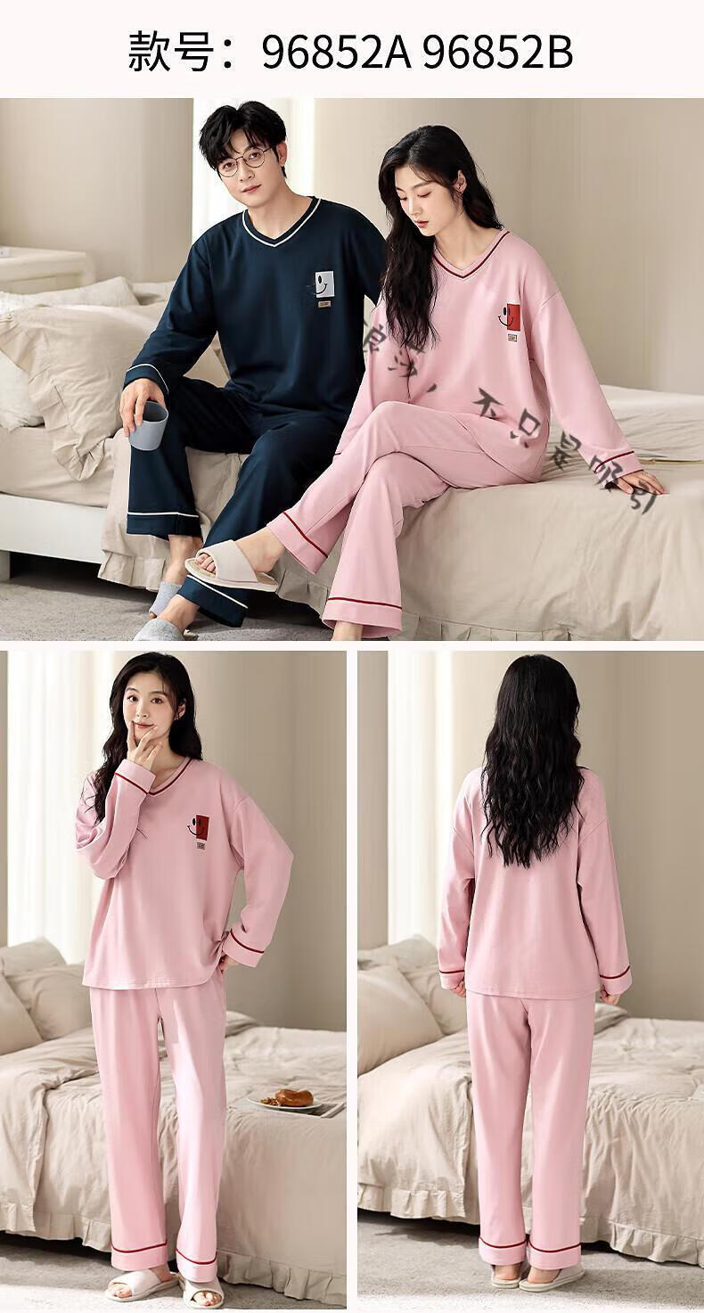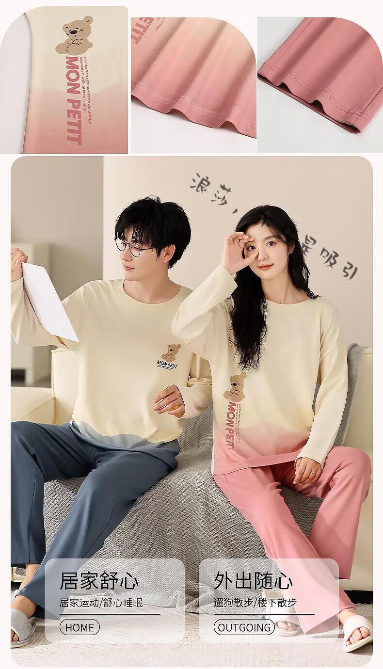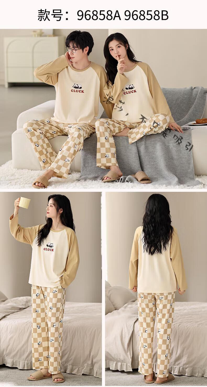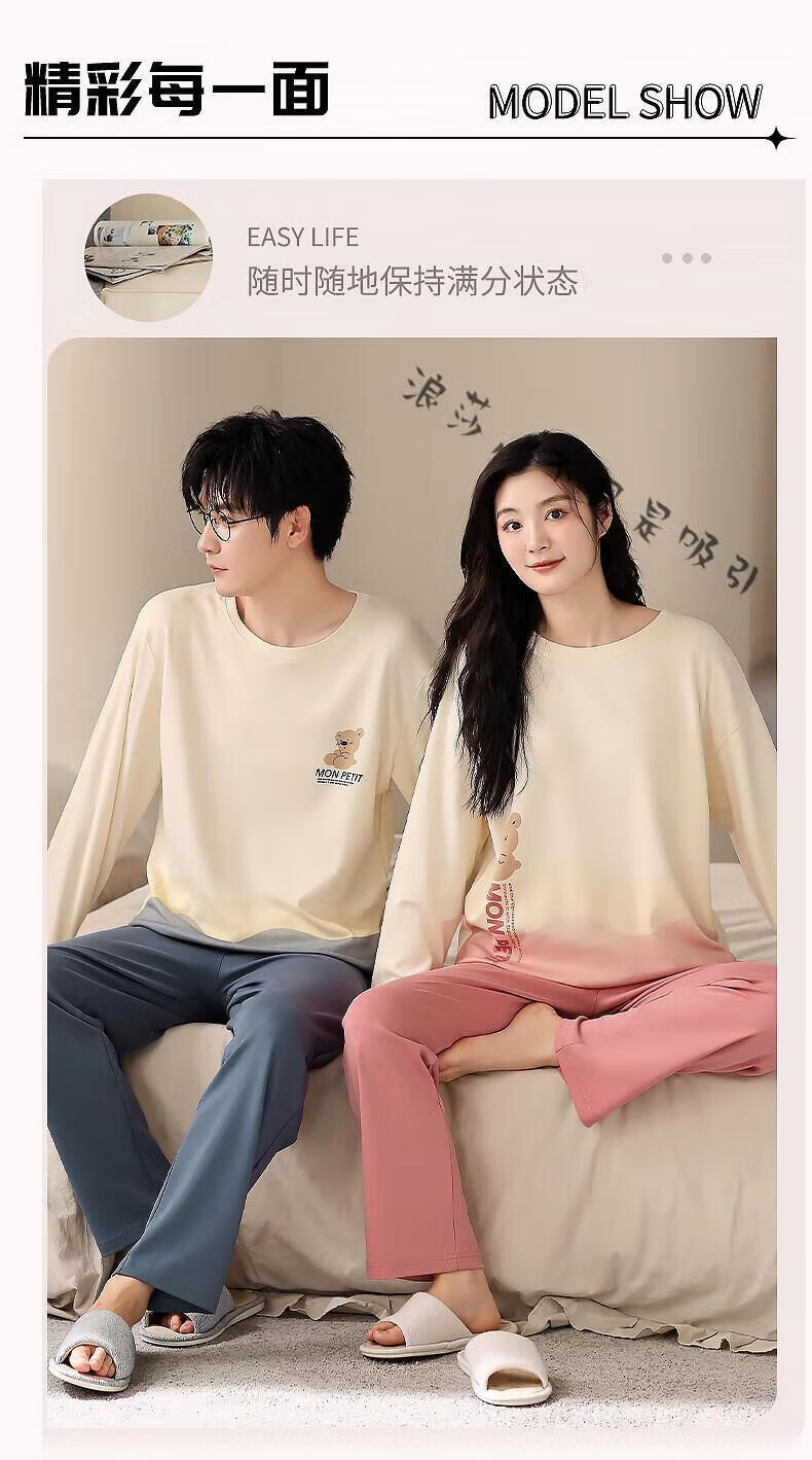 LangSha couple pajamas for one man and one woman in spring and autumn pure cotton round neck long-sleeved cartoon casual spring and autumn can be worn outside home clothes 96850 Female M + Male L
