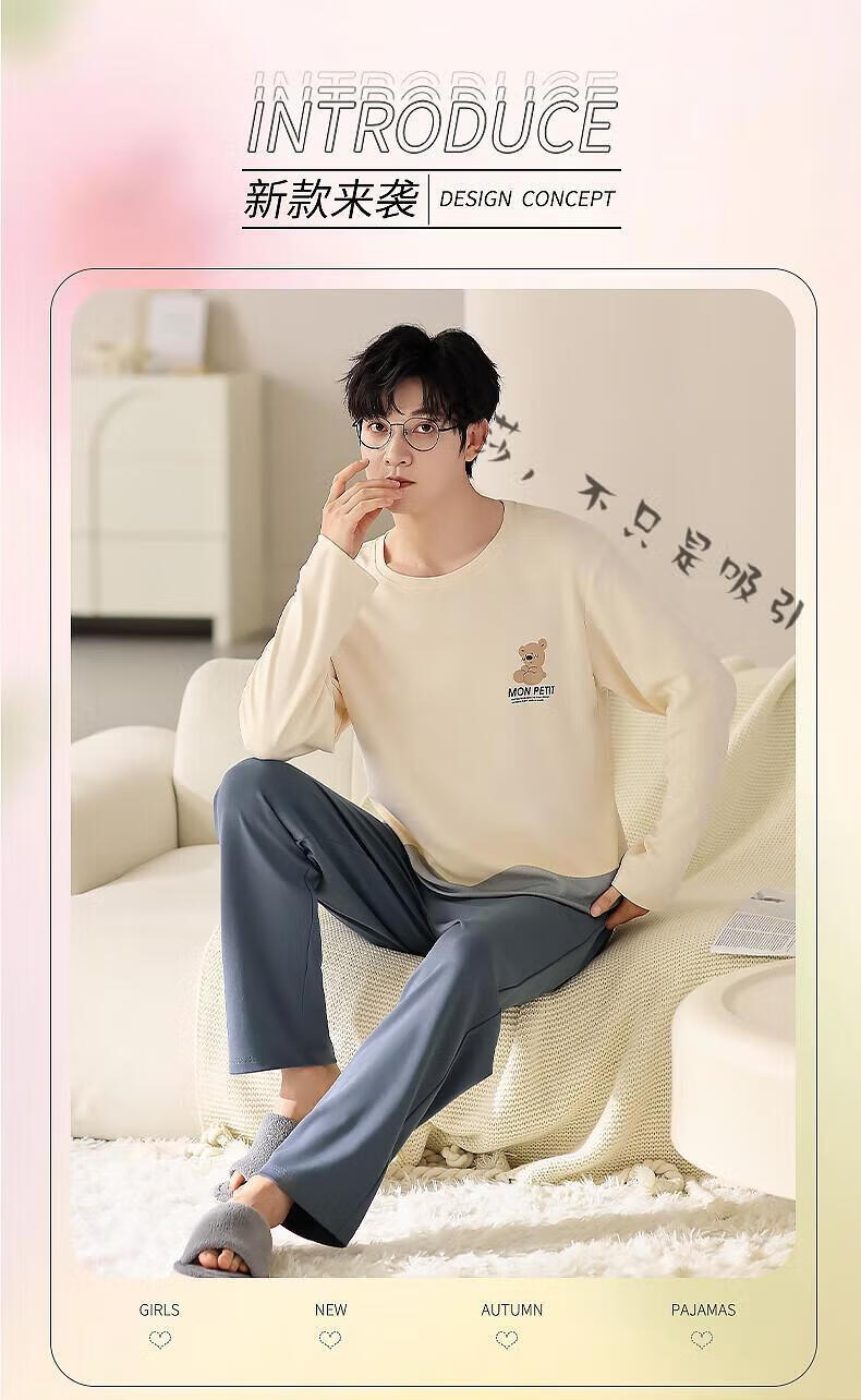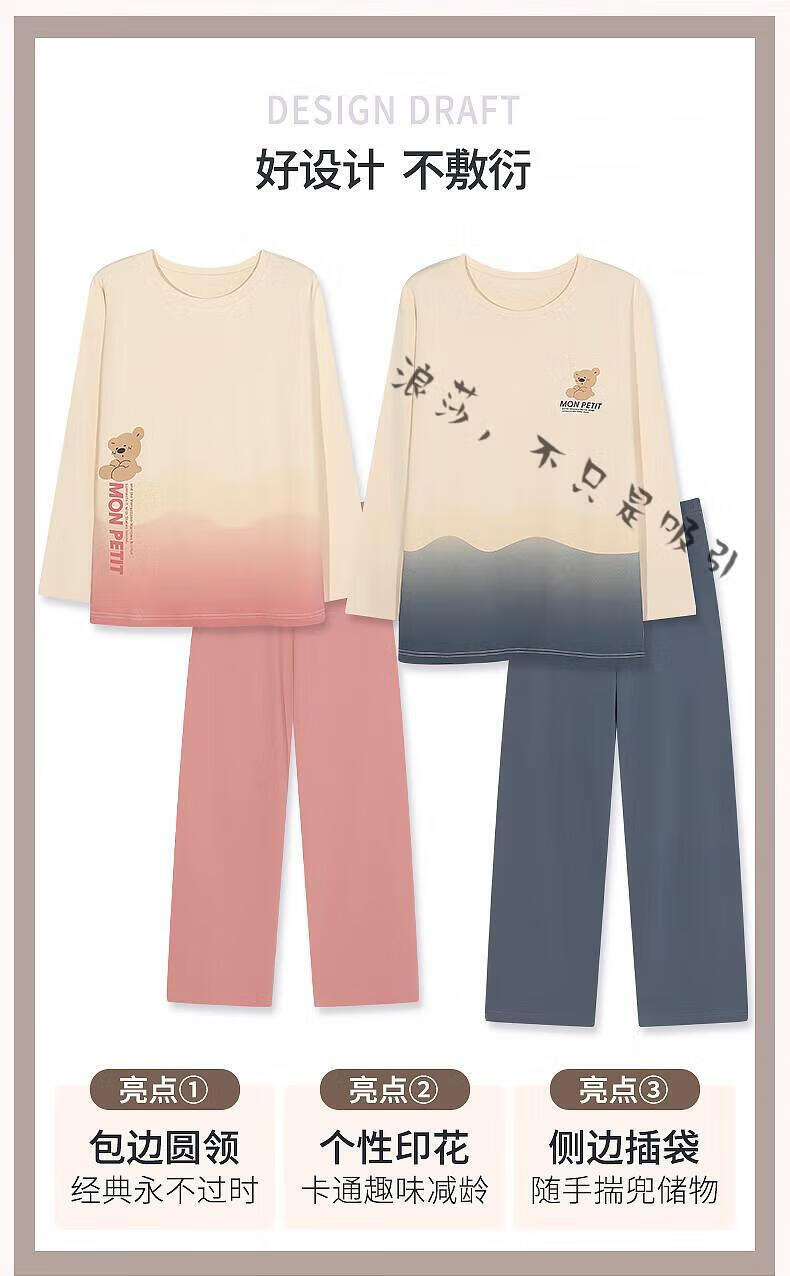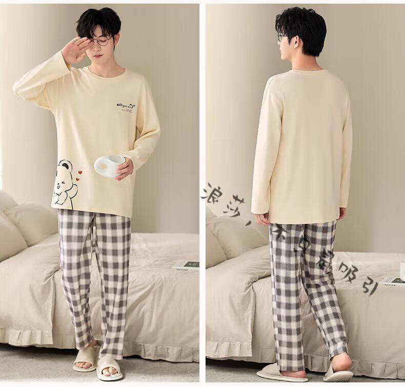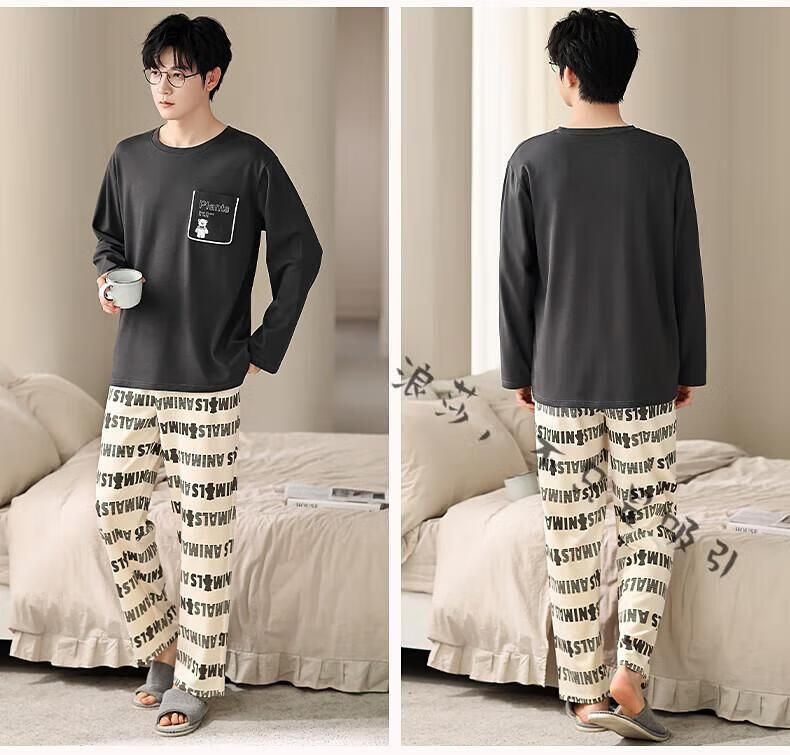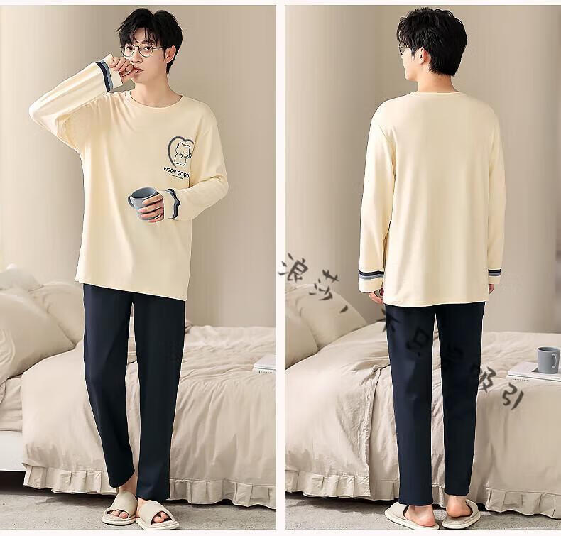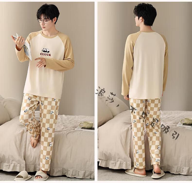 LangSha couple pajamas for one man and one woman in spring and autumn pure cotton round neck long-sleeved cartoon casual spring and autumn can be worn outside home clothes 96850 Female M + Male L