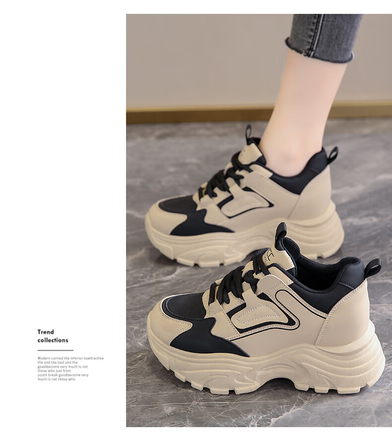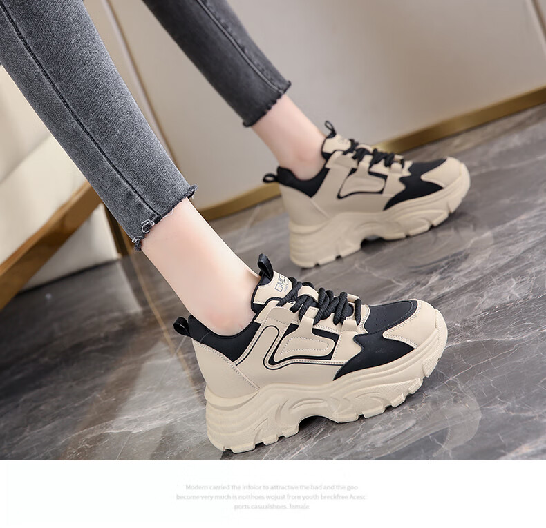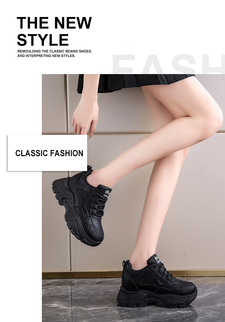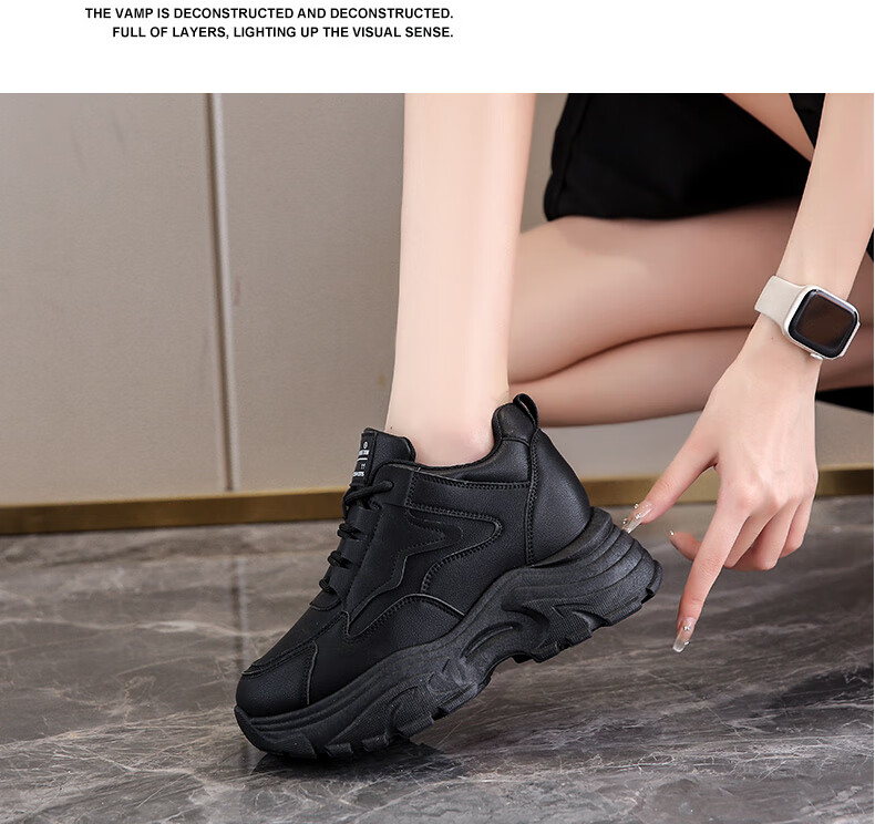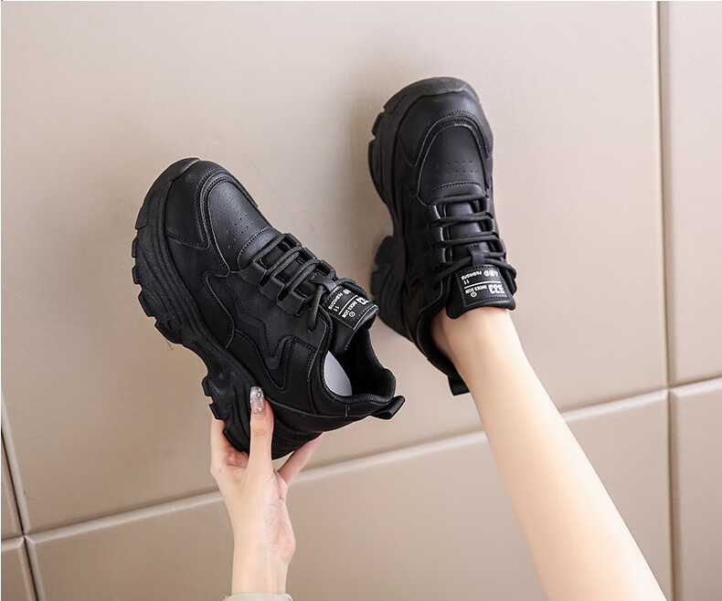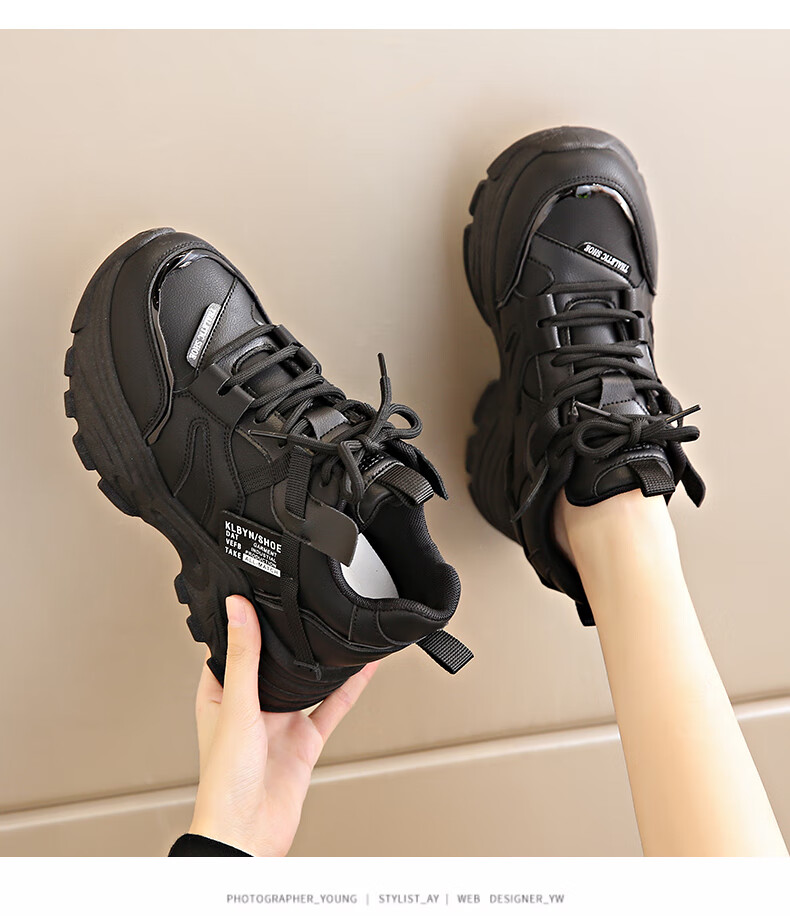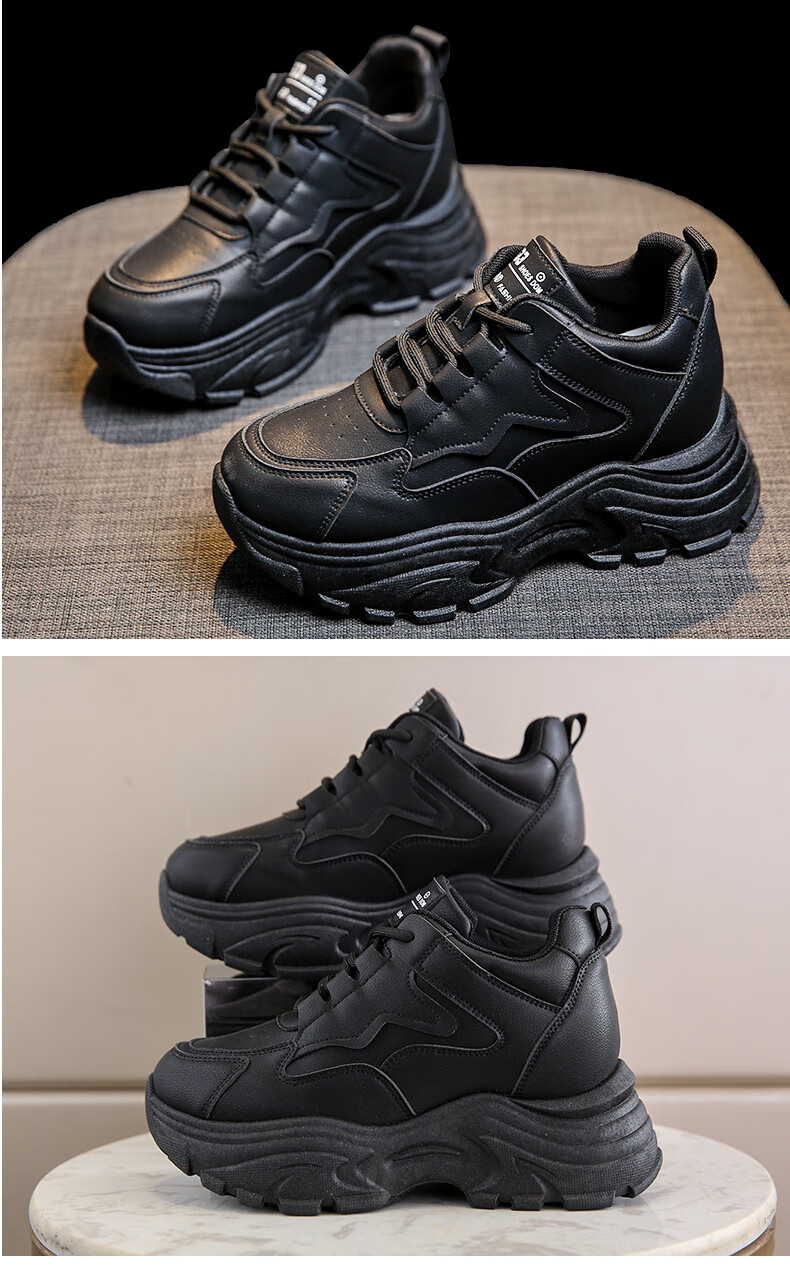 Woodpecker women's 8CM height increasing shoes small versatile wedge black sneakers autumn and winter thick sole non-slip leather daddy shoes black leather 35