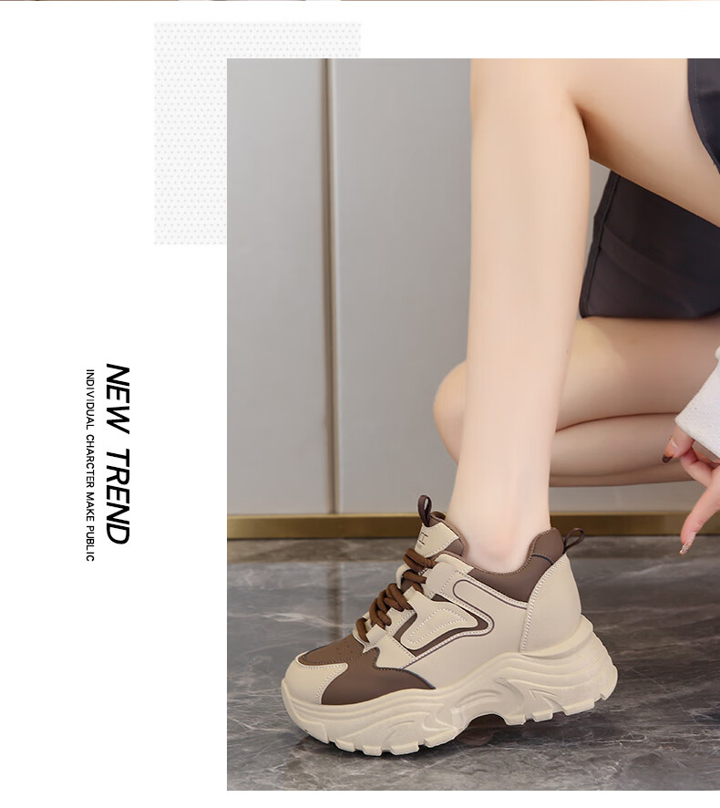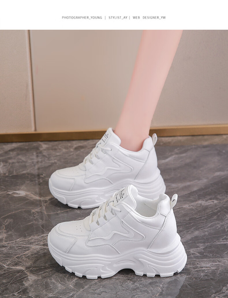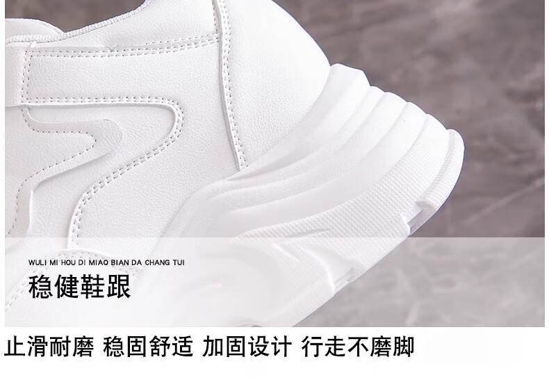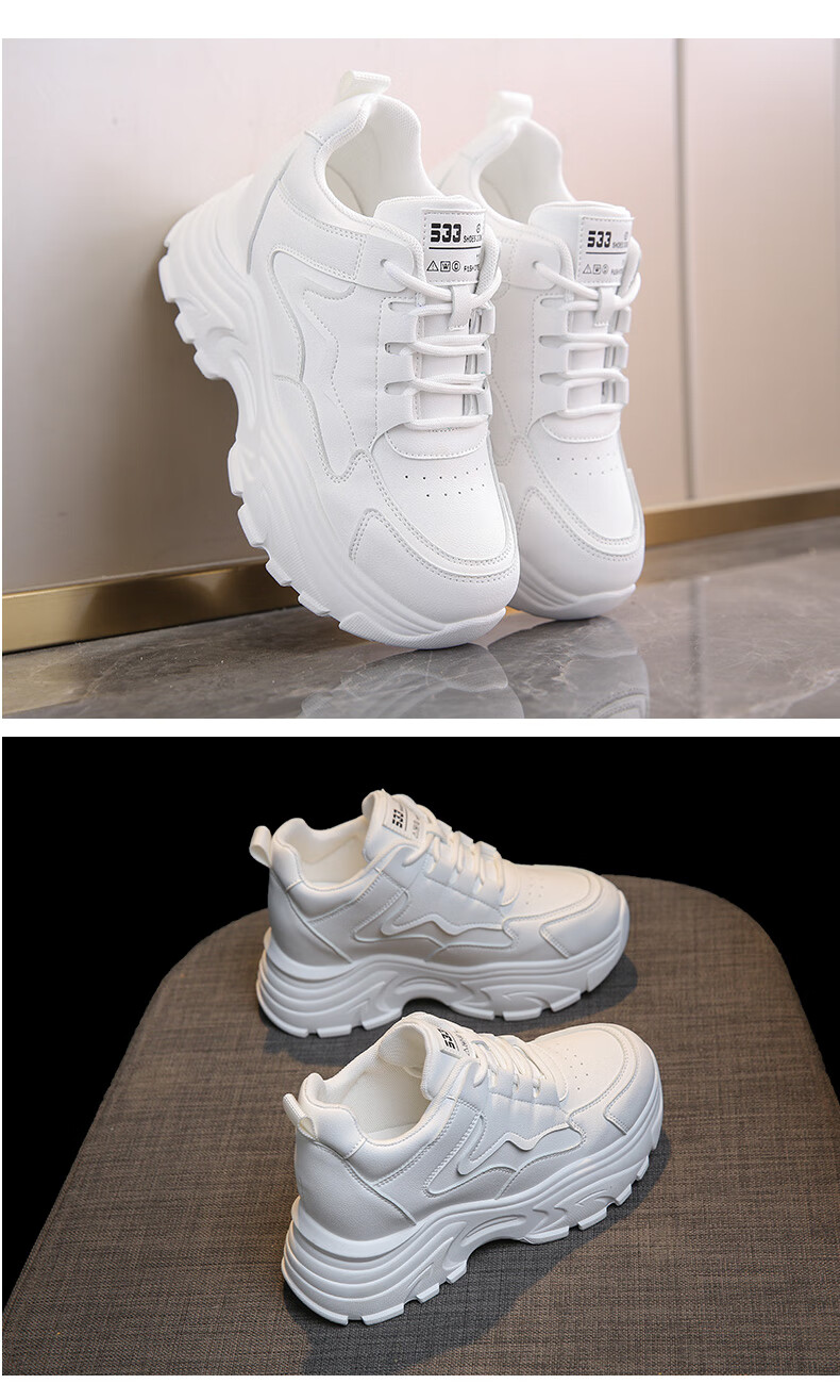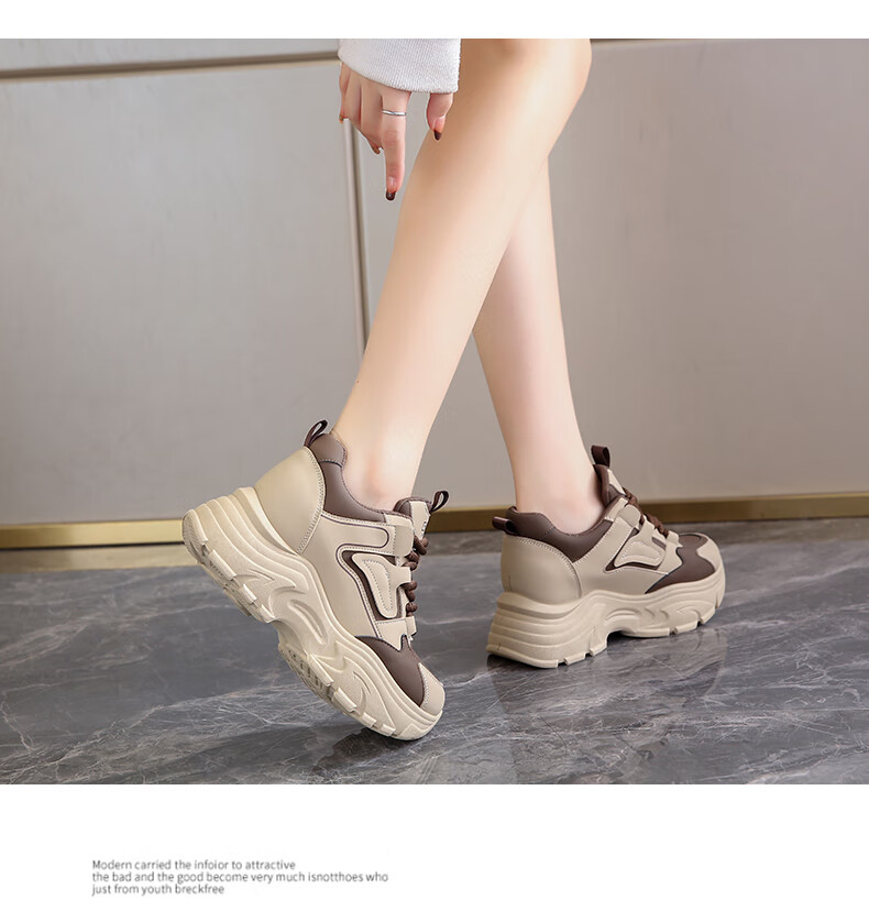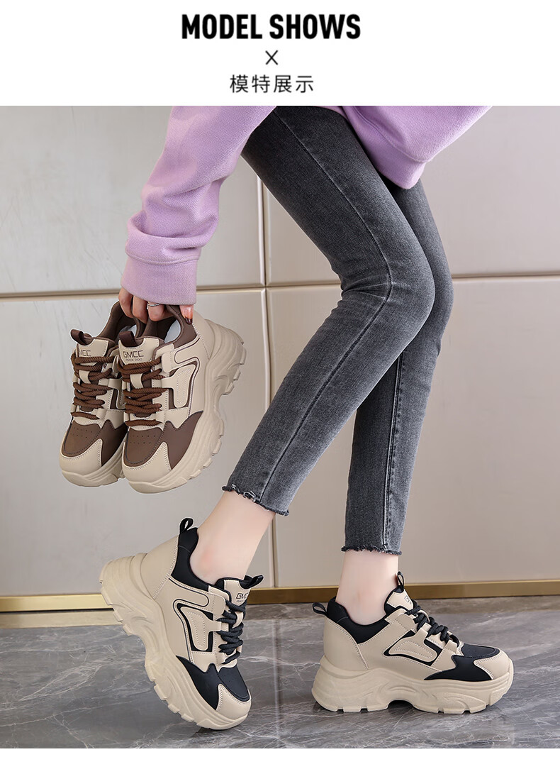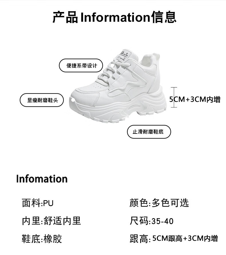 Woodpecker women's 8CM height increasing shoes small versatile wedge black sneakers autumn and winter thick sole non-slip leather daddy shoes black leather 35