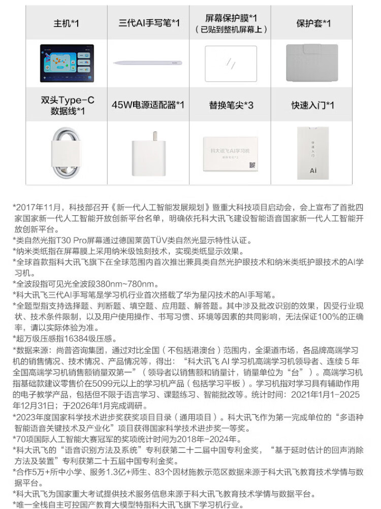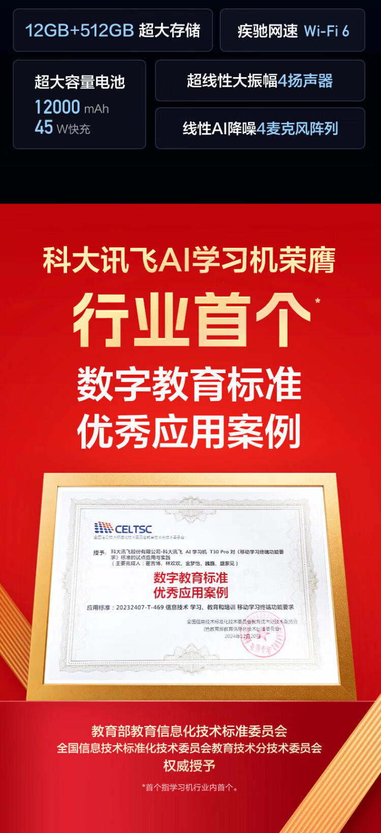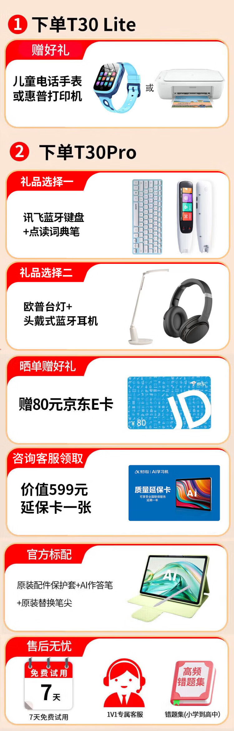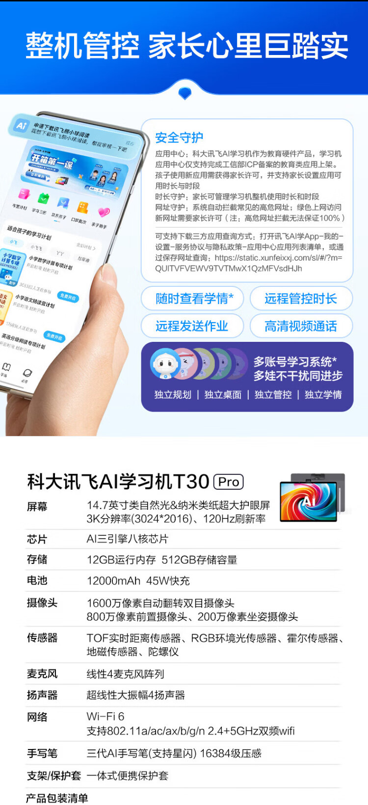 IFLYTEK Artificial Intelligence Learning Machine T30Pro/T30 Lite Primary School Junior High School High School AI Accurate Question Answering Spark+DeepSeek Large Screen Eye Protection Student Tablet Tutoring Machine T30 Pro 12+512G 14.7-inch Large Screen