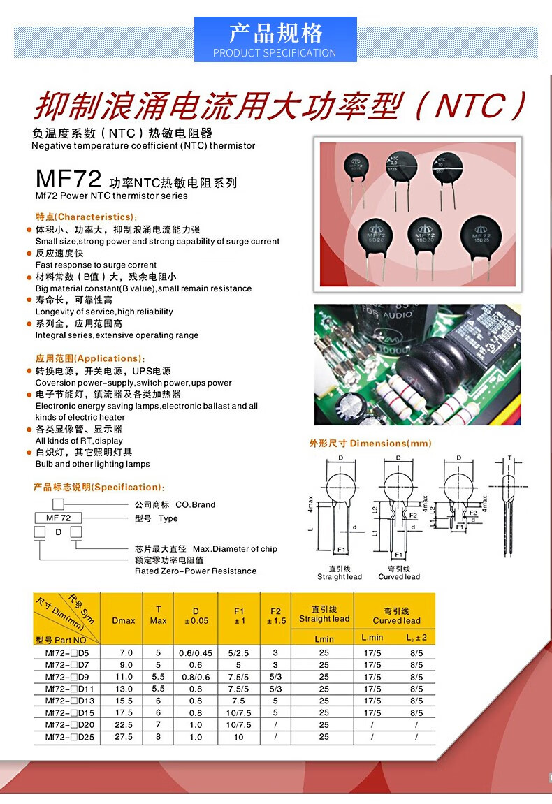 Thermistor high current power type NTC MF72 3D/5D/10D-20 surge current suppression resistor 120D-20