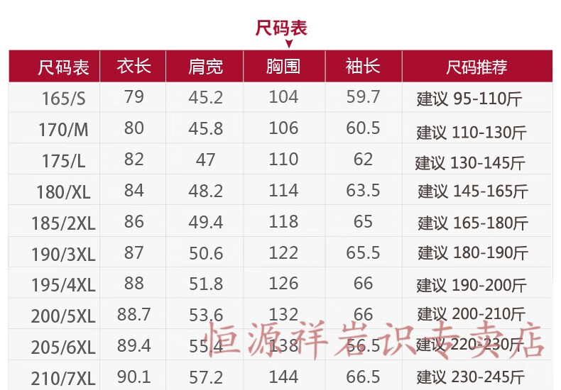 China (cm) 165 / 88-90 170 / 96-98 175 / 108-110 180 / 118-122 185 / 126-130