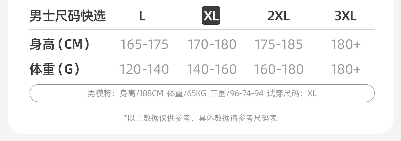 China (cm) 165 / 88-90 170 / 96-98 175 / 108-110 180 / 118-122 185 / 126-130