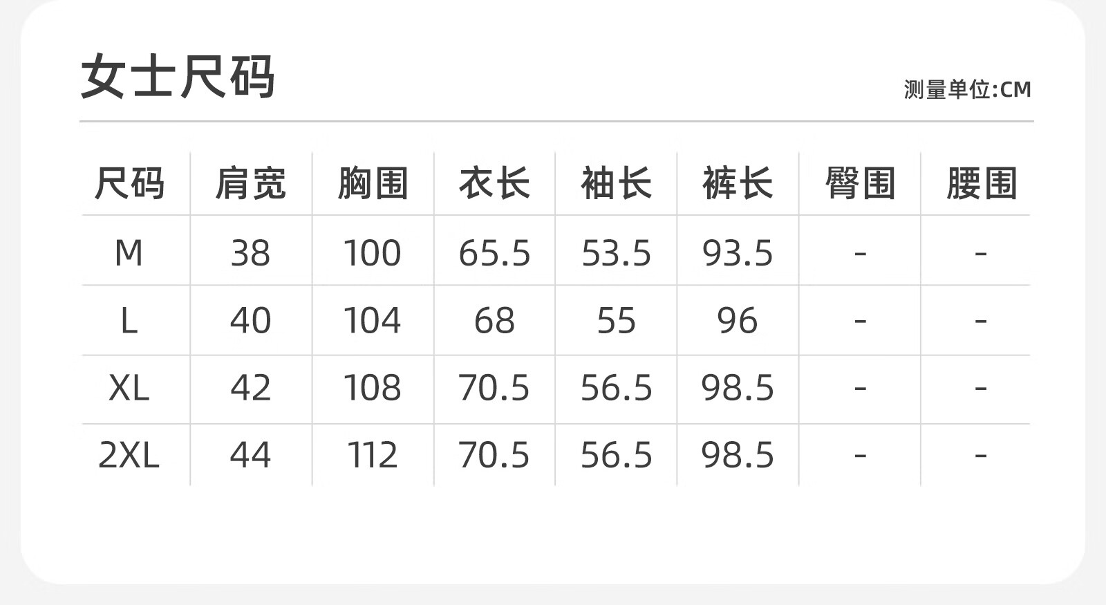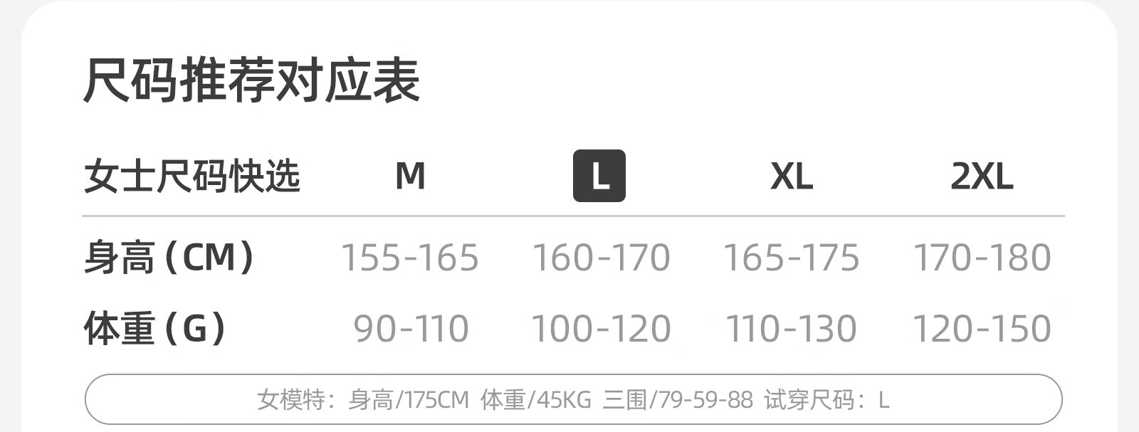 China (cm) 160-165/84-86 165-170 / 88-90 167-172 / 92-96 168-173 / 98-102 170-176 / 106-110