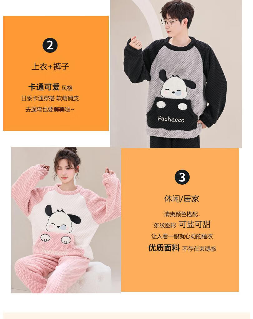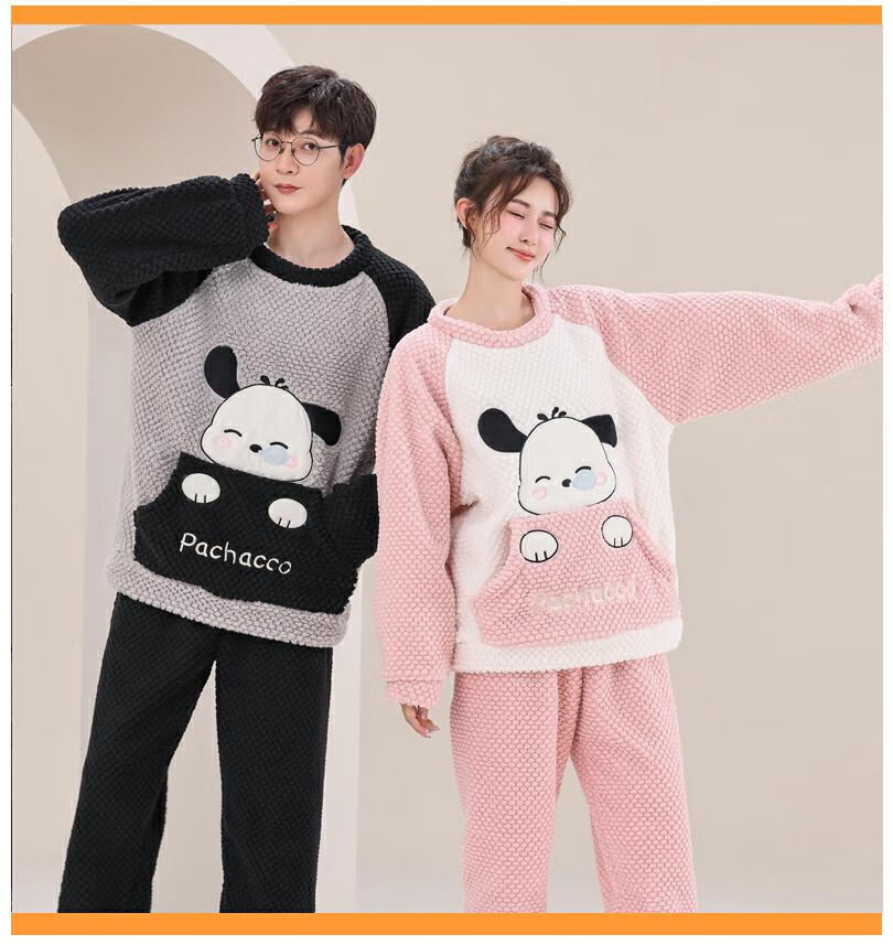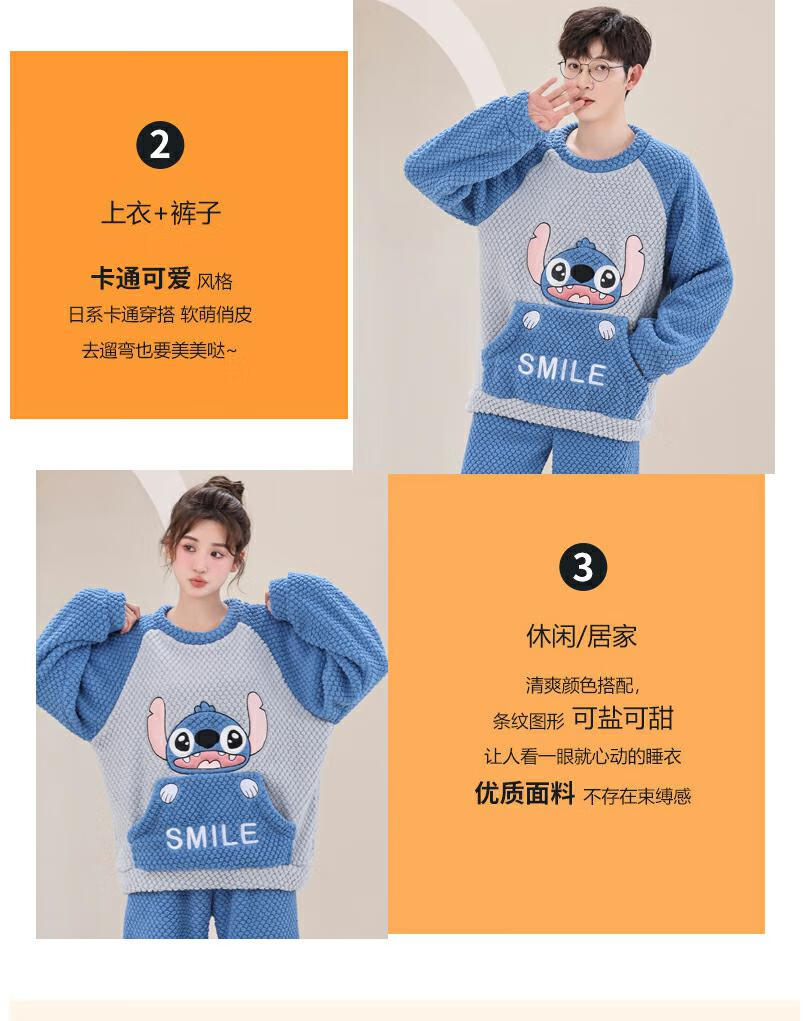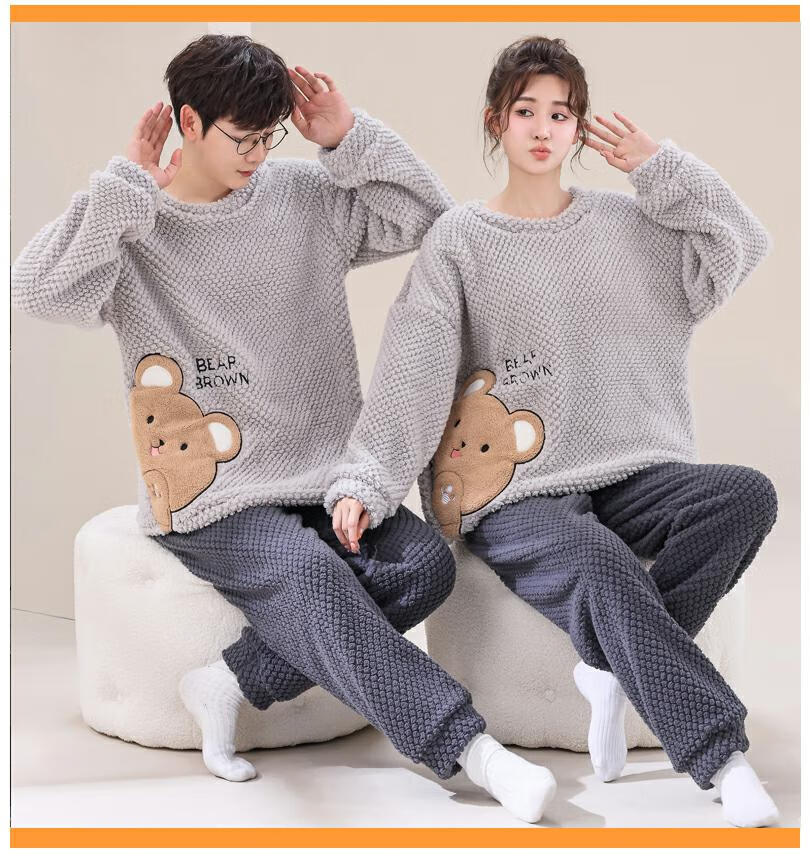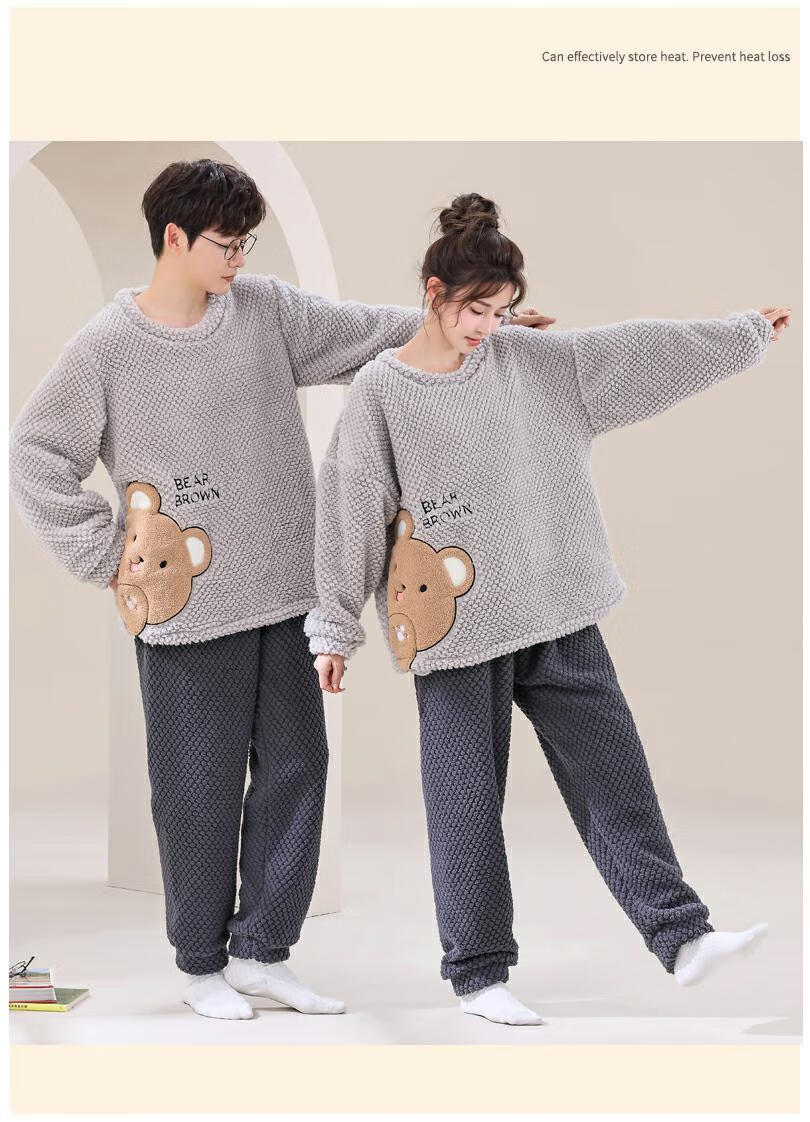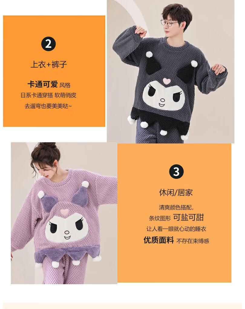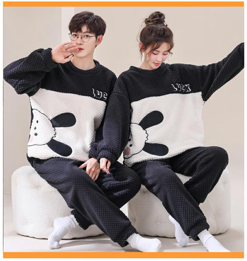 LangSha buy one get one free couple pajamas for women autumn and winter coral velvet thickened cute cartoon large size men's home wear set velvet Kurome M female + male L