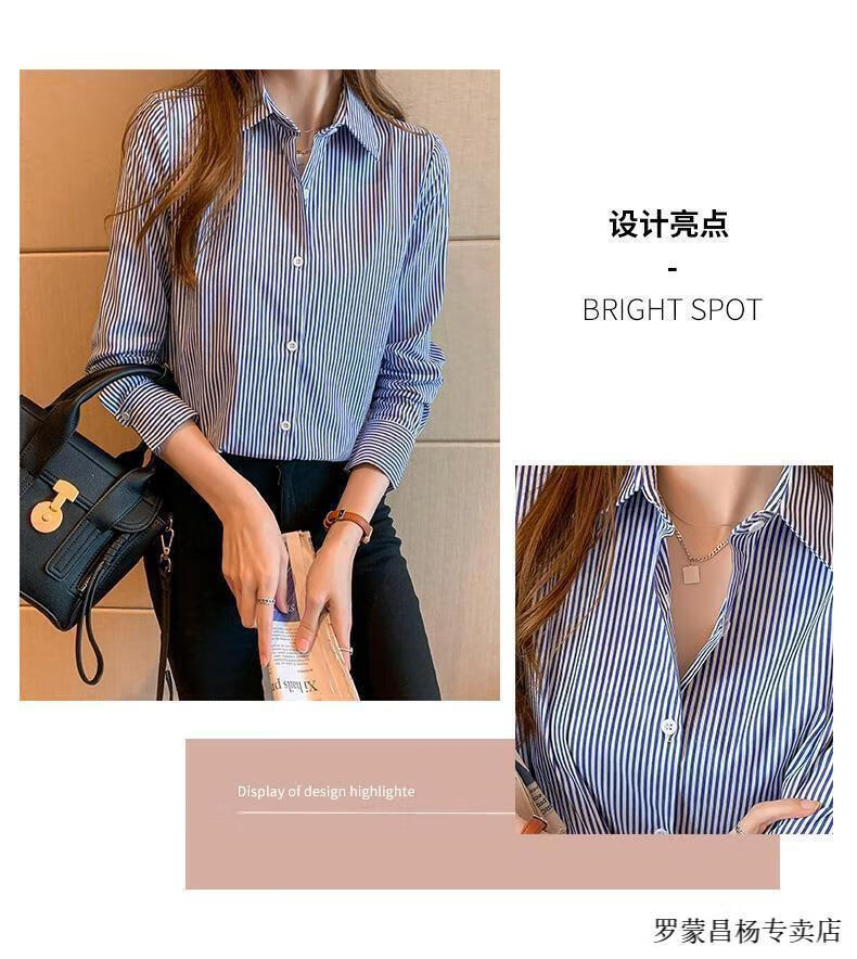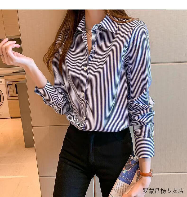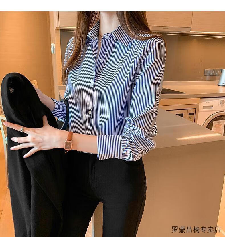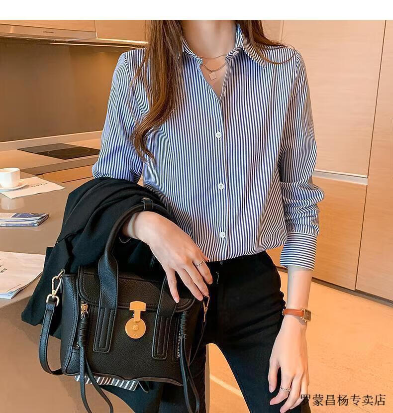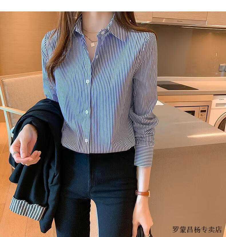 ROMON plus velvet striped shirt for women 2026 autumn new blue design niche shirt autumn and winter long-sleeved tops versatile blue and white stripes (plus/velvet style) XL