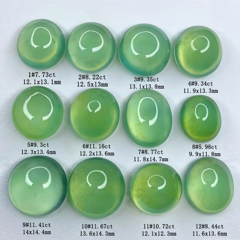 Blue Xianghe 2 Brazilian prehnite fluorescent green large carat cabochon loose stone custom inlaid with 18K gold and silver ring pendant earrings 7.73 carats 1#