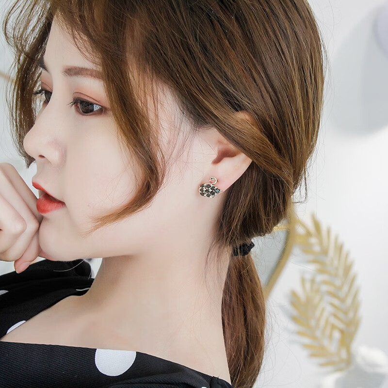 BOMP Old Phoenix Gold Store Korean Micropaved Zirconia Black Swan S925 Silver Needle Earrings Female Super Fairy Versatile Earrings Black Swan Earrings