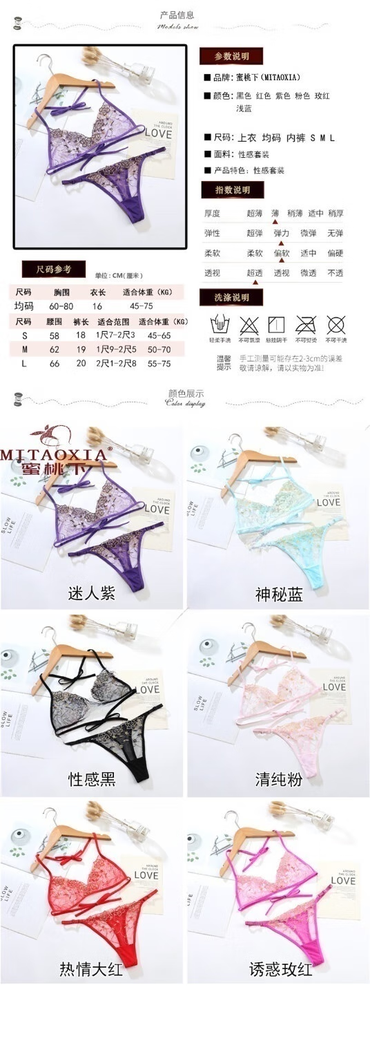 Under the peach French transparent mesh underwear set women's sexy strappy bra hollow embroidered lace thong blue L 110-150Jin Jin equals 0.5 kg