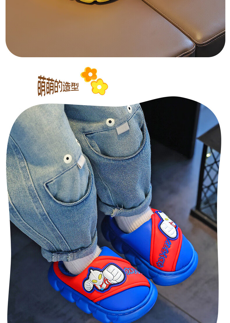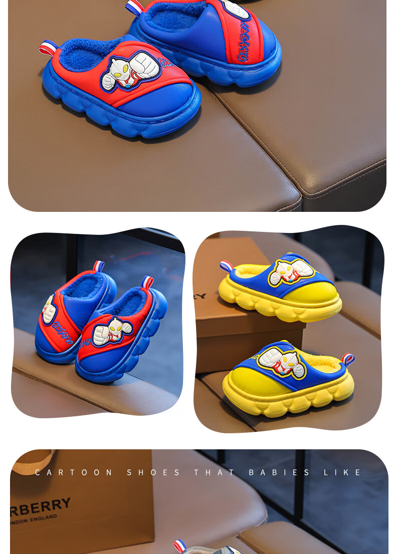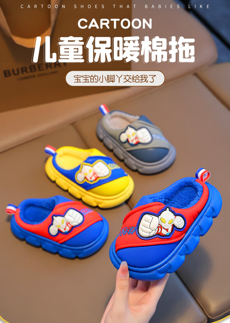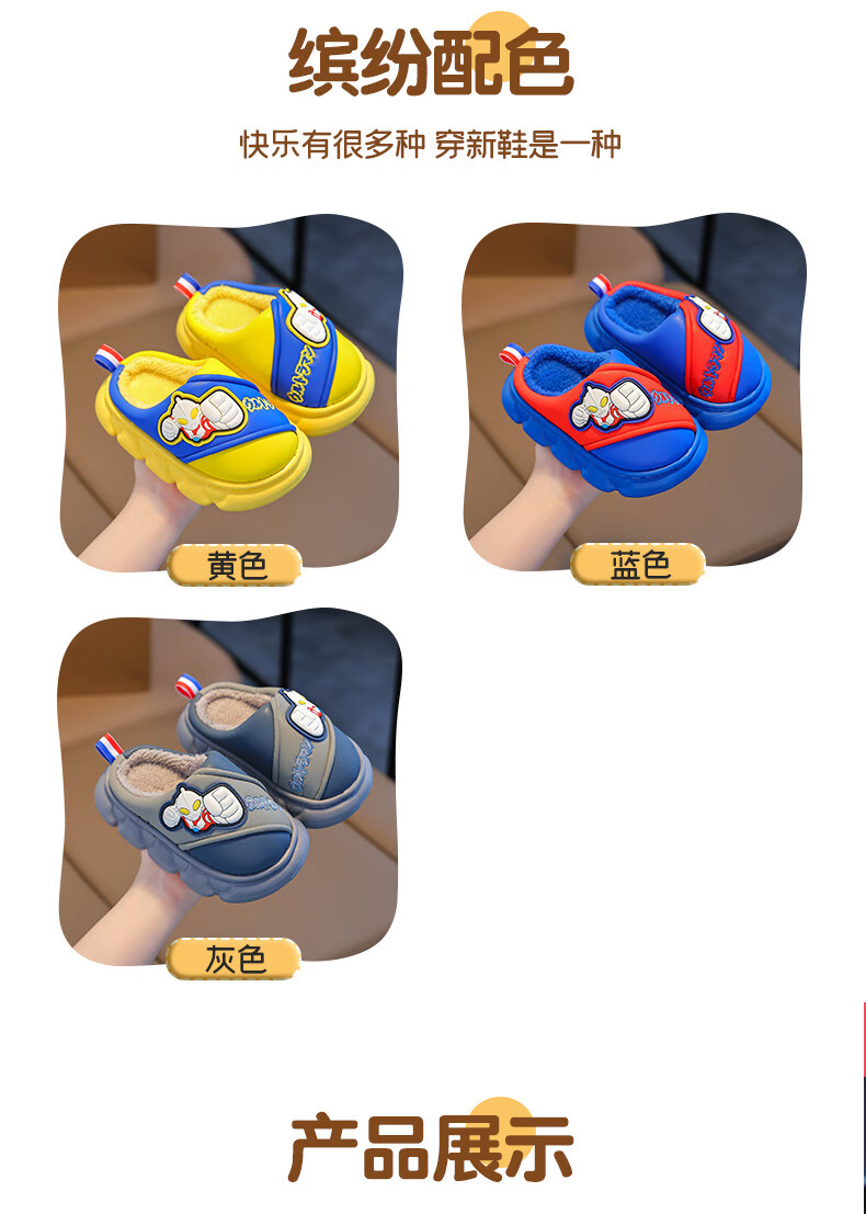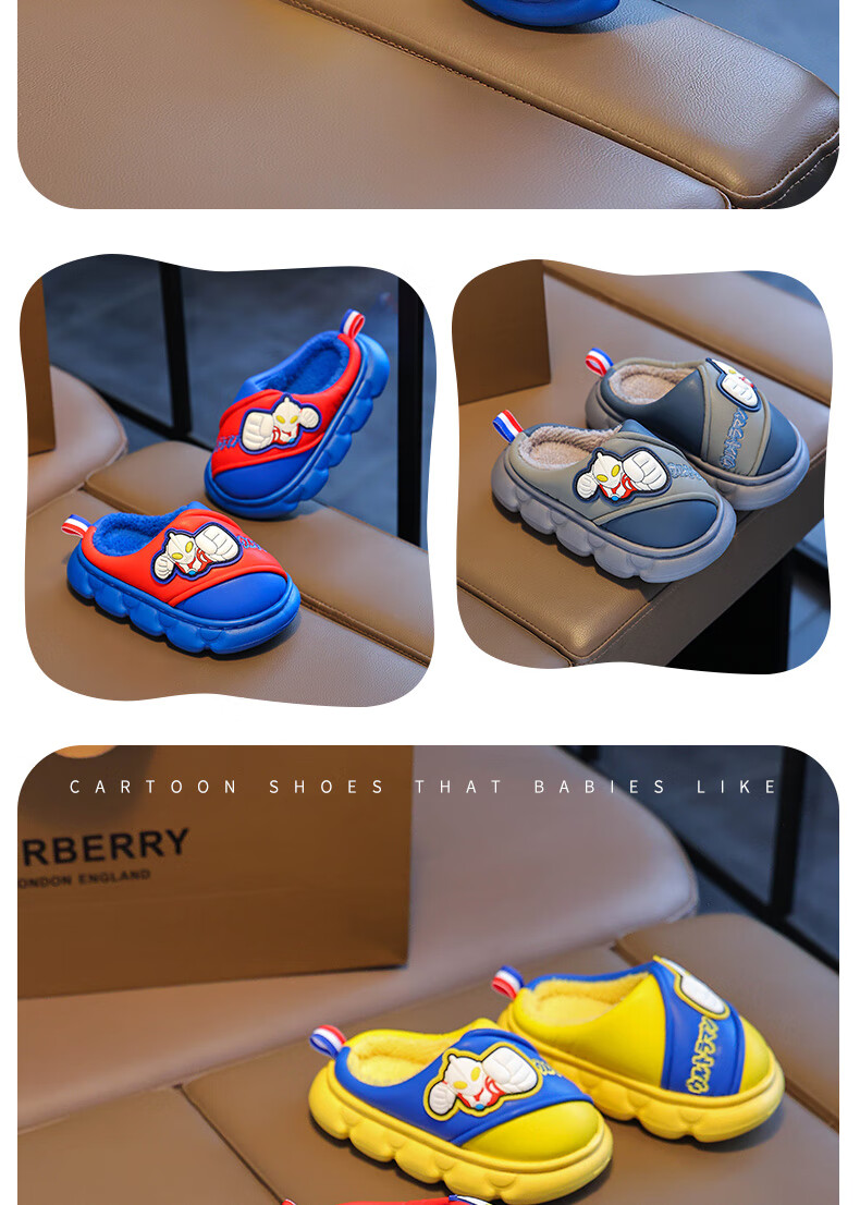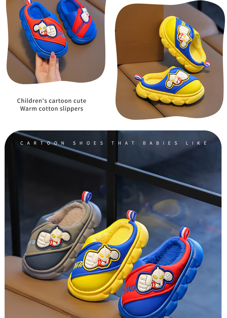 Candy Astringent Ultraman Odorless Waterproof Children's Cotton Slippers PU Leather Soft Bottom Anti-Slip Plus Velvet Warm Boy Baby Bag Heel Cotton Shoes SD34 Ultra M-Gray 32-33 Sizes Inner Length 19.5cm