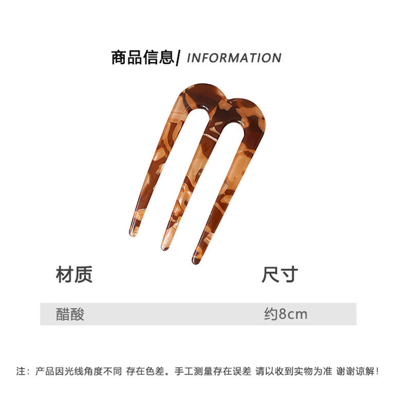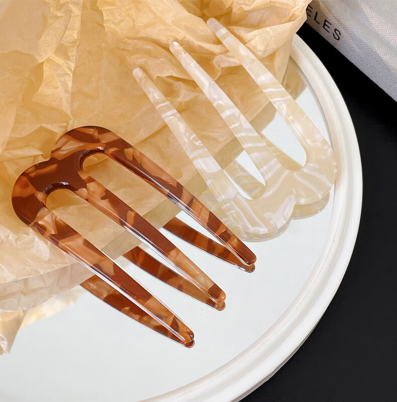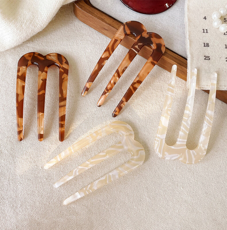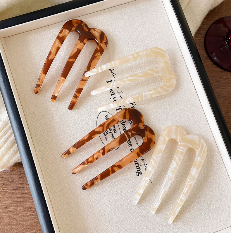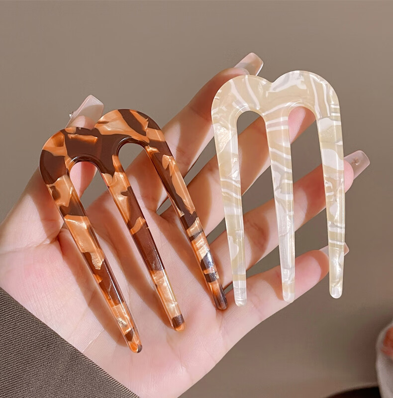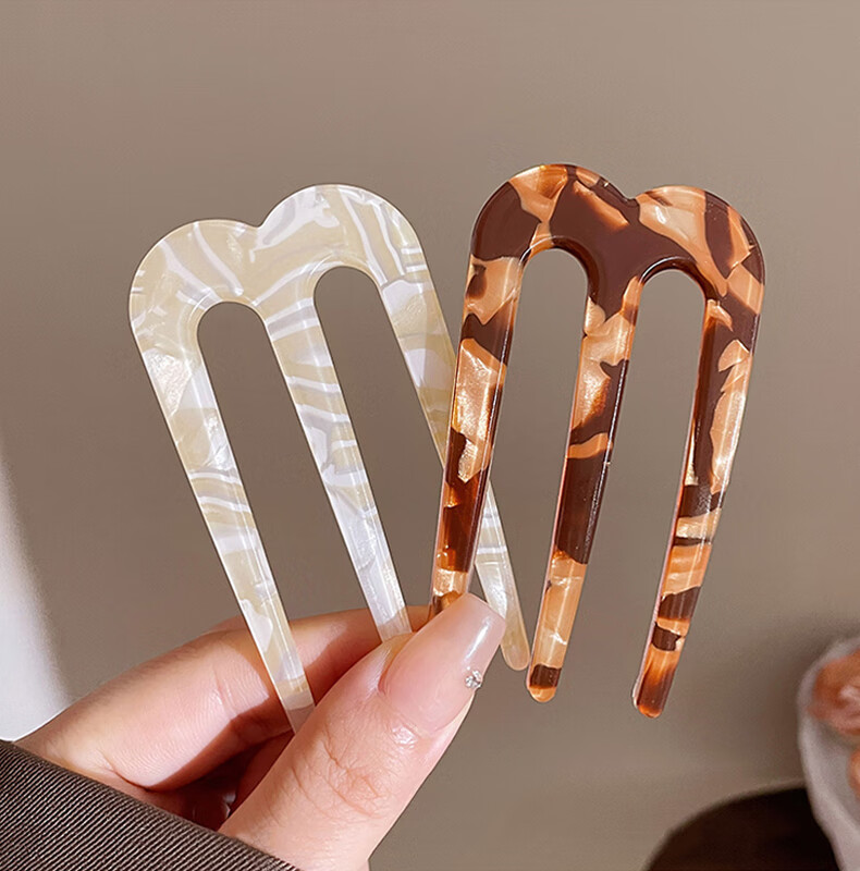 Zuoou three-tooth hairpin acetic acid U-shaped new Chinese-style hairpin on the back of the head, daily commuting hairpin, three-tooth brown hairpin