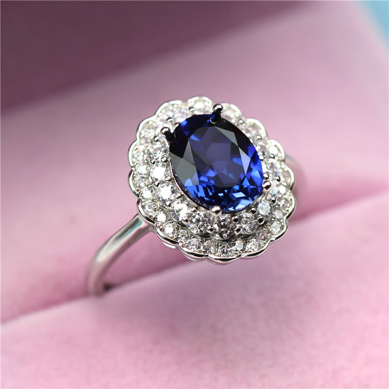 DL 1998 Tanzanite Sapphire 925 Silver Blue Ring Double Layer Diamond Retro Colored Jewel Ring Opening Japanese and Korean Female Silver Live Mouth (Main Stone 7X9mm) B6