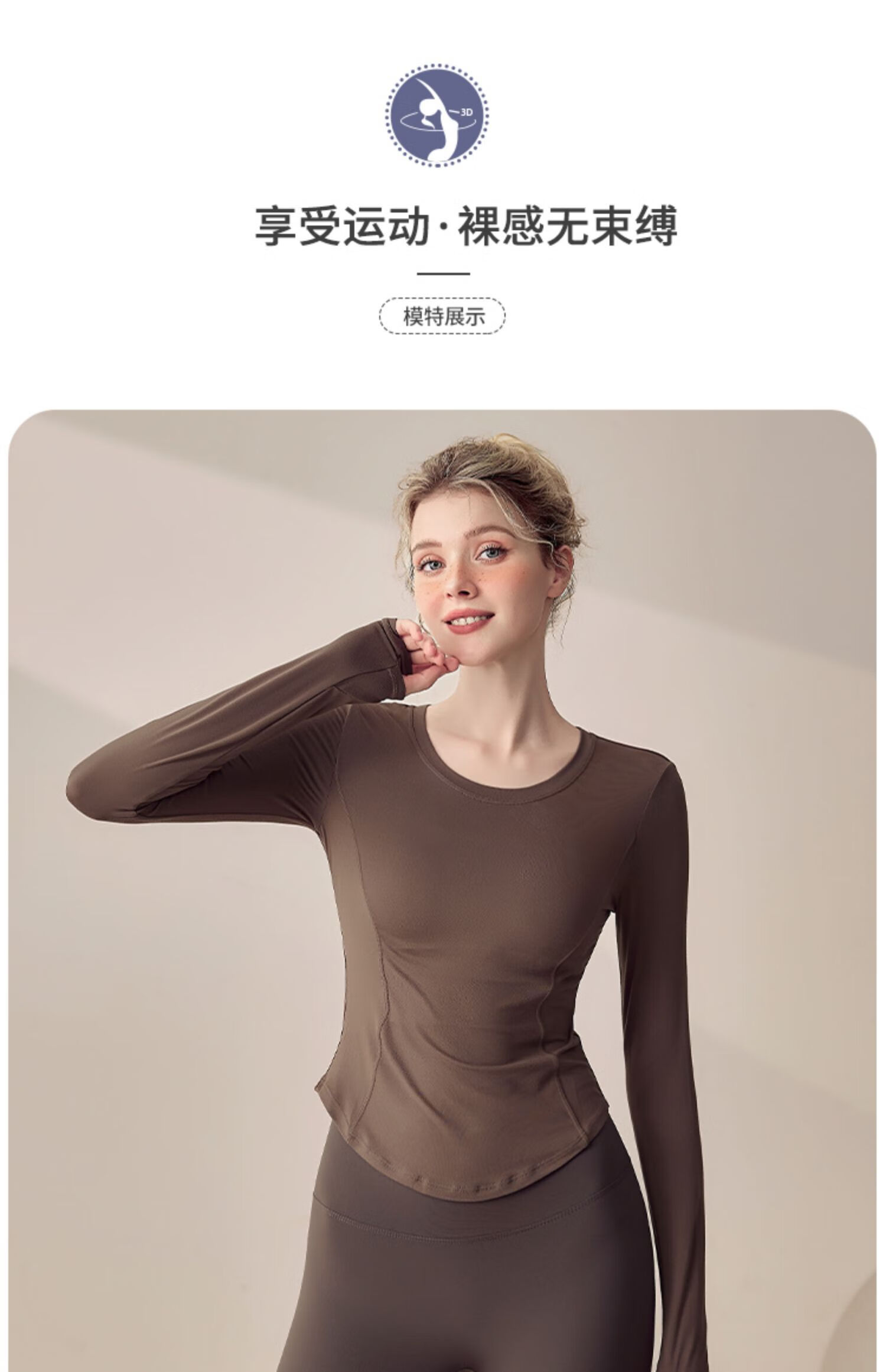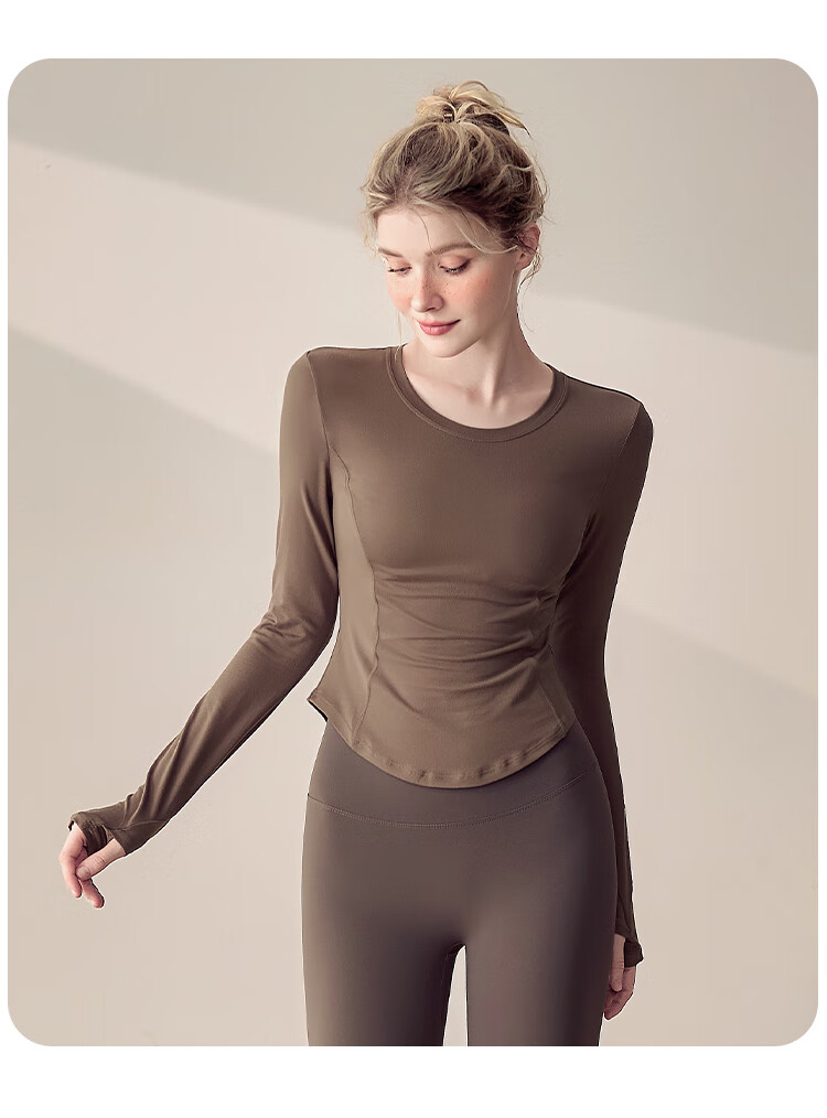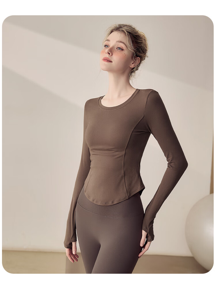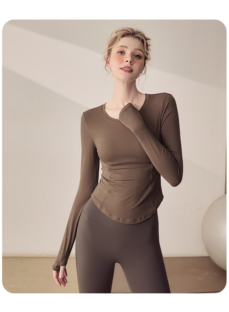 LULU CENTURY Autumn and Winter round neck running sports long-sleeved T-shirt women's slim slim yoga clothing top Pilates training fitness clothing chestnut brown L
