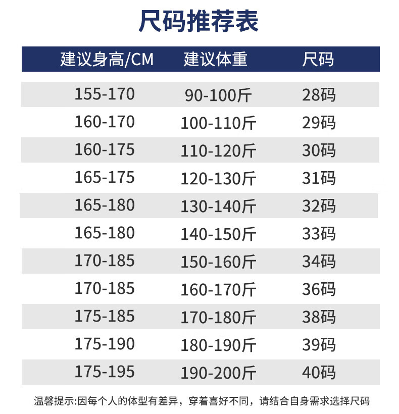 USA(inch) 28-30 30-32 32-34 34-38 38-42