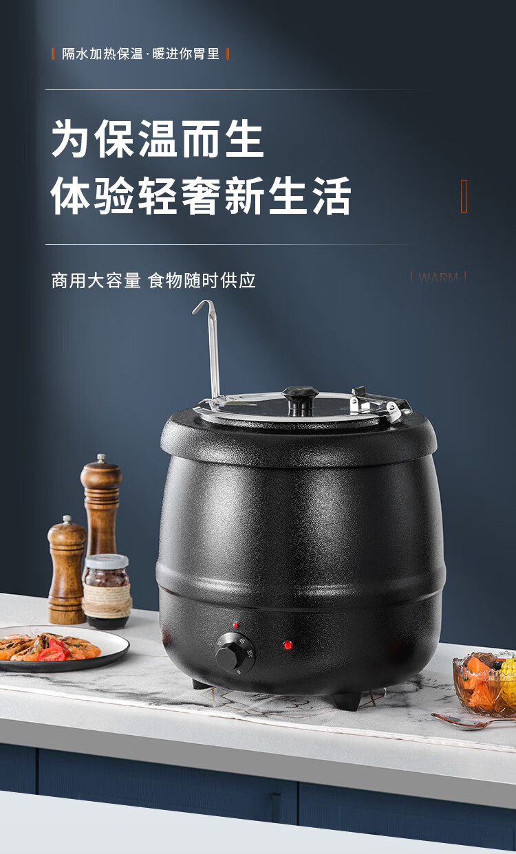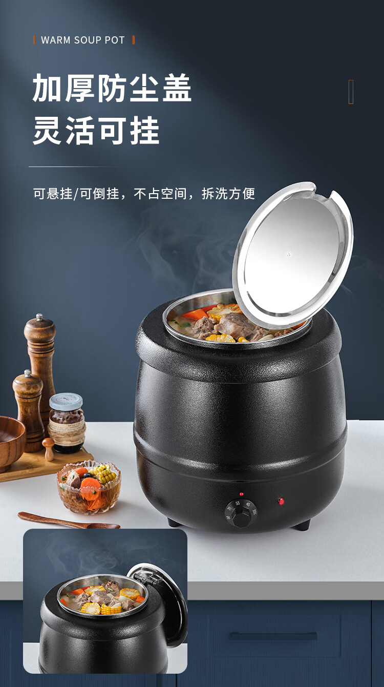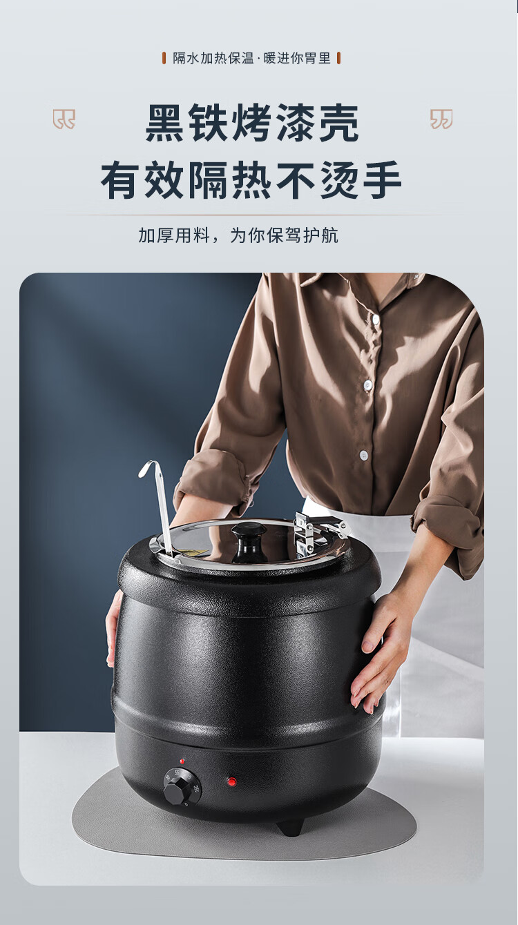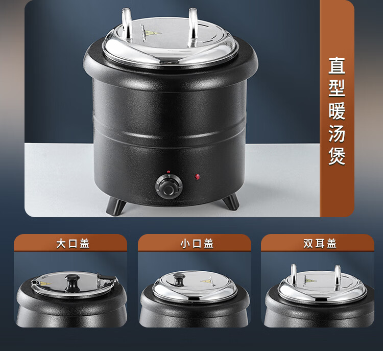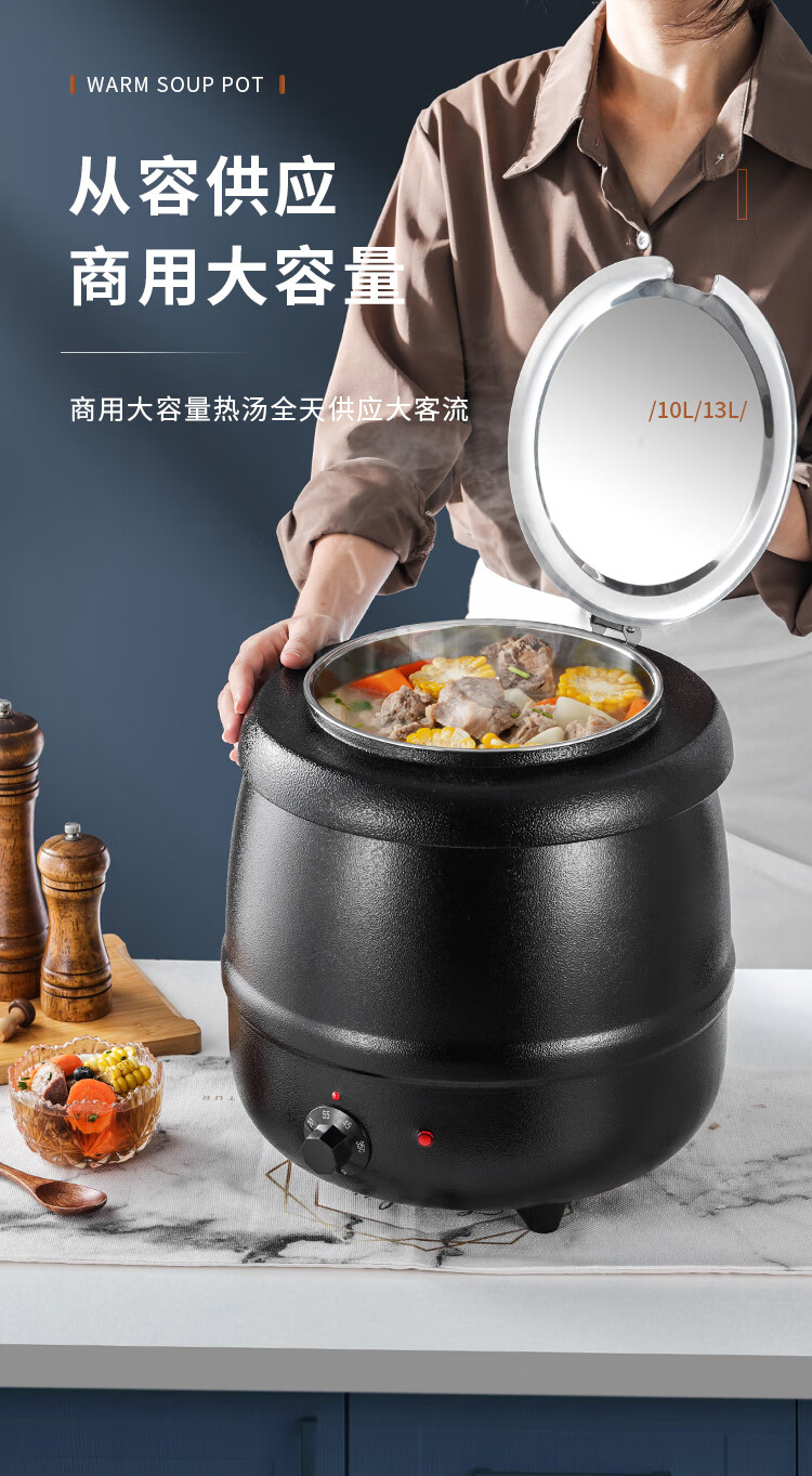 Cantonese Warm Soup Pot Commercial Stainless Steel Electric Heating Insulated Soup Pot Hotel Breakfast Buffet Warm Porridge Pot Warming Soup Stove 13L Drum Type Black Soup Pot Small Mouth Lid 201 Liner