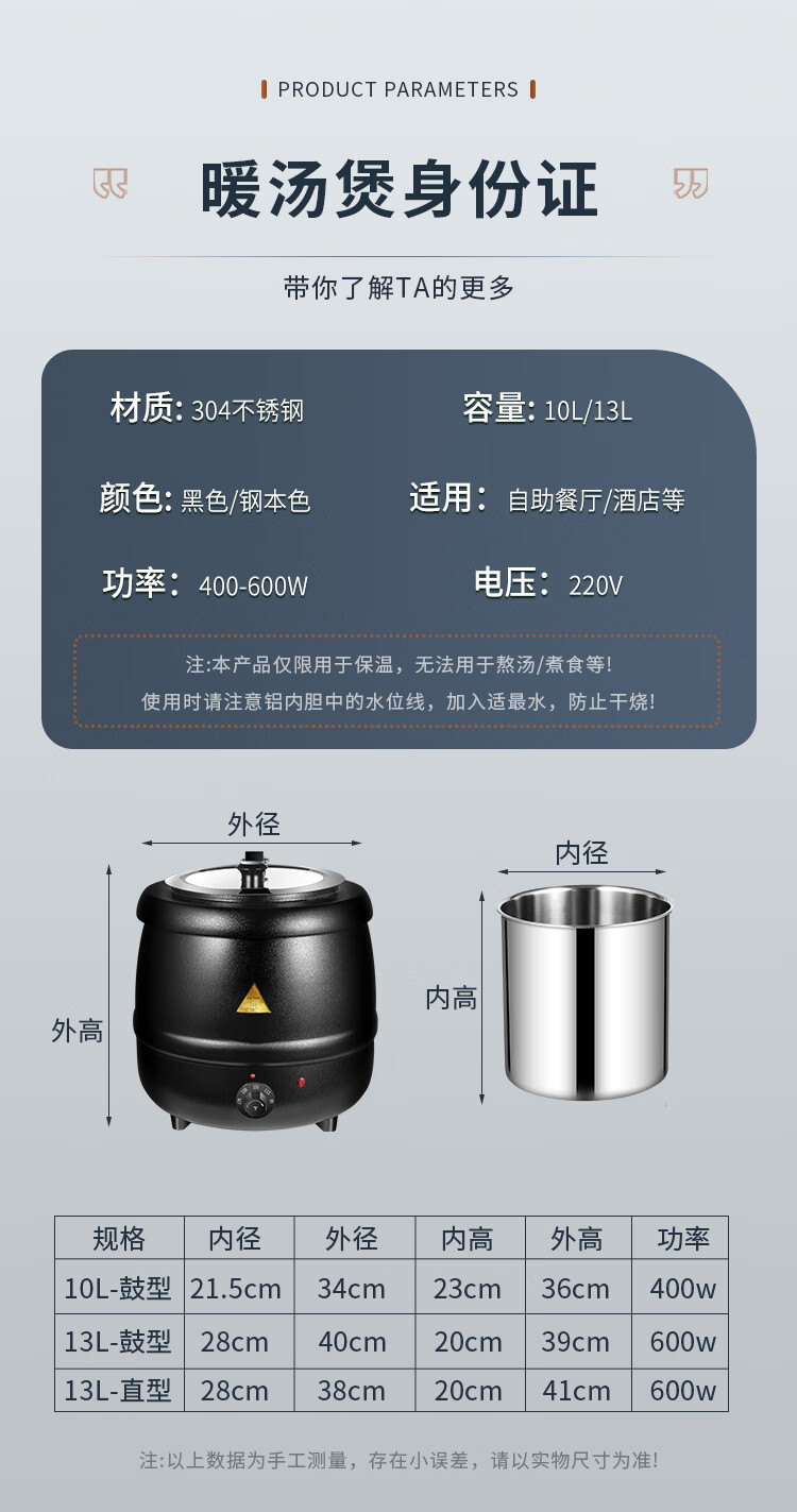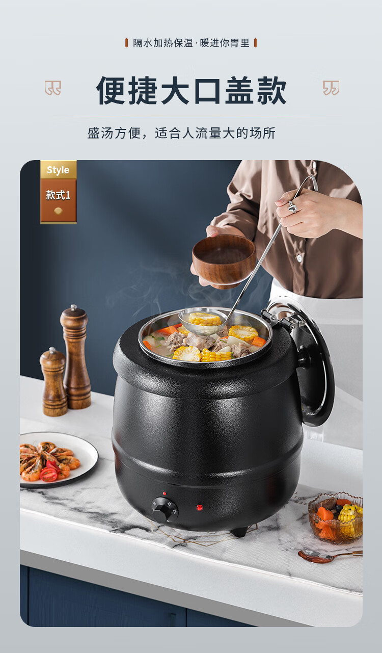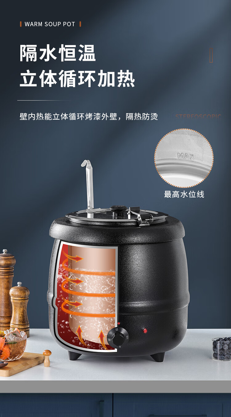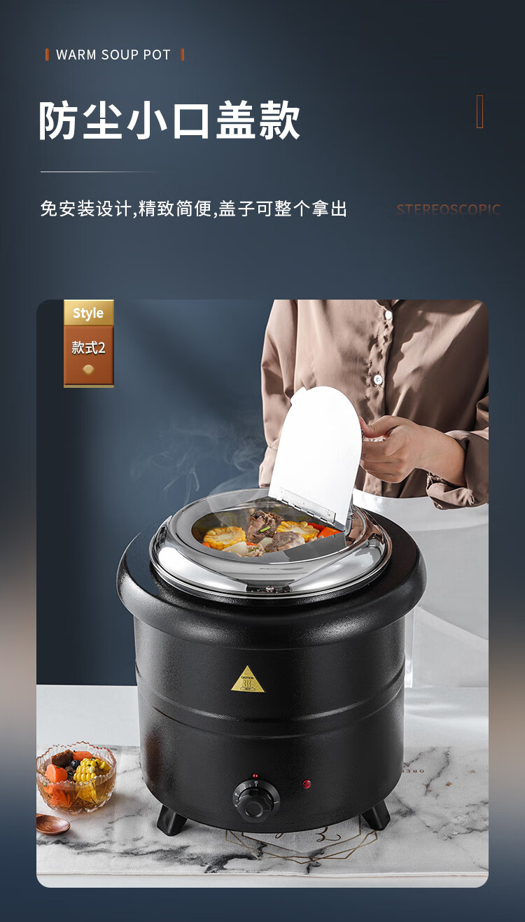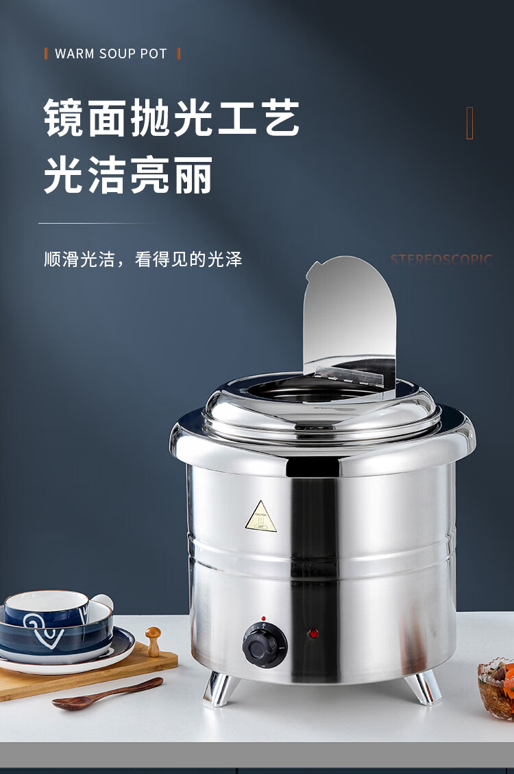 Cantonese Warm Soup Pot Commercial Stainless Steel Electric Heating Insulated Soup Pot Hotel Breakfast Buffet Warm Porridge Pot Warming Soup Stove 13L Drum Type Black Soup Pot Small Mouth Lid 201 Liner
