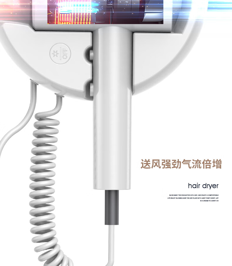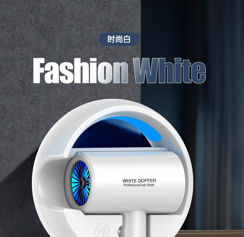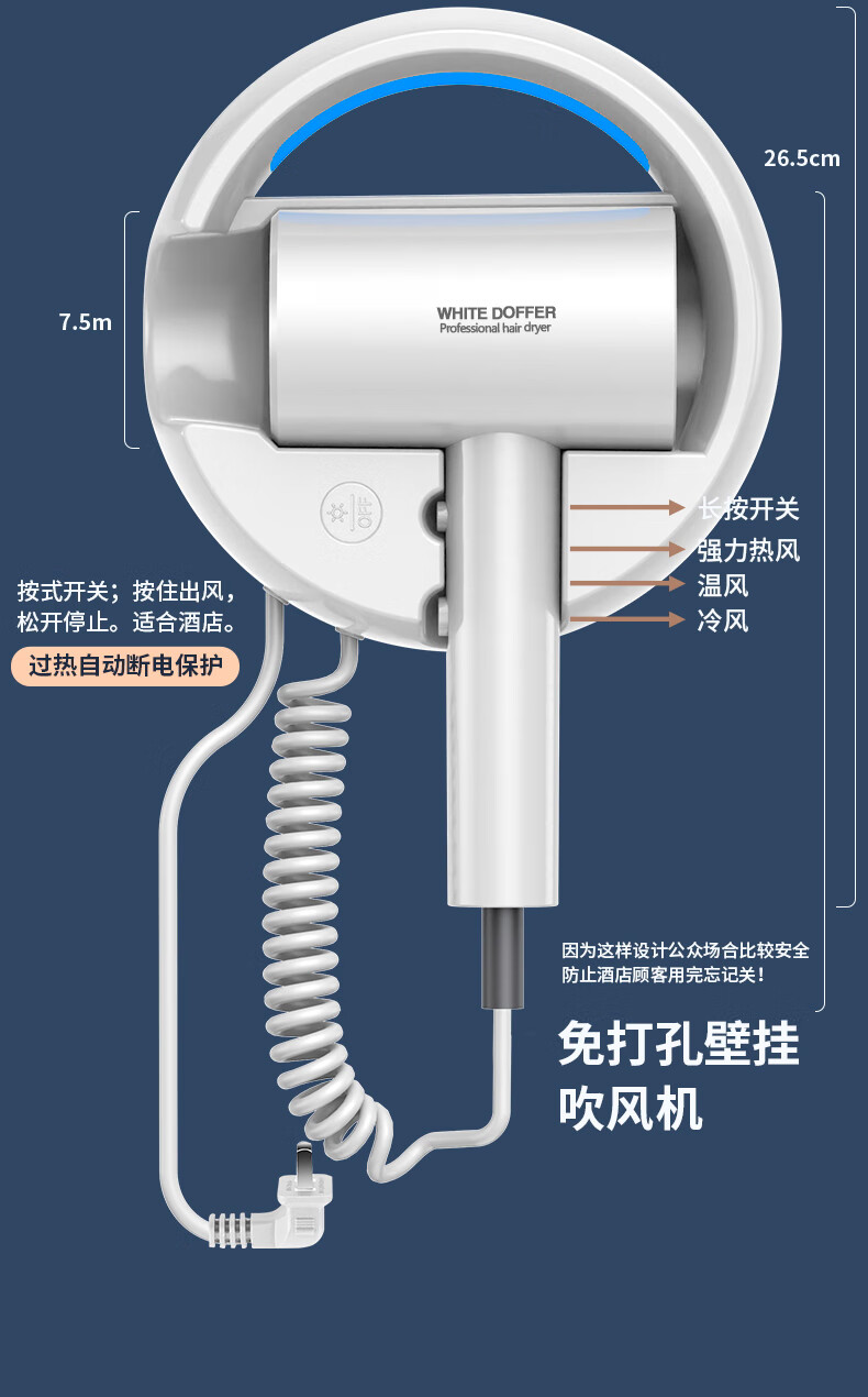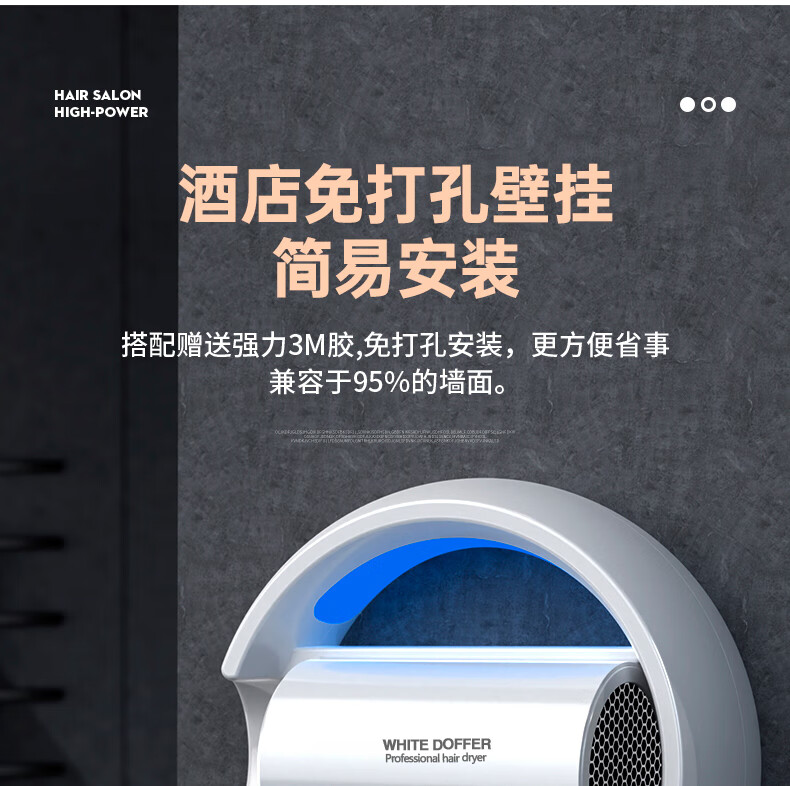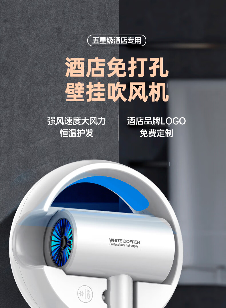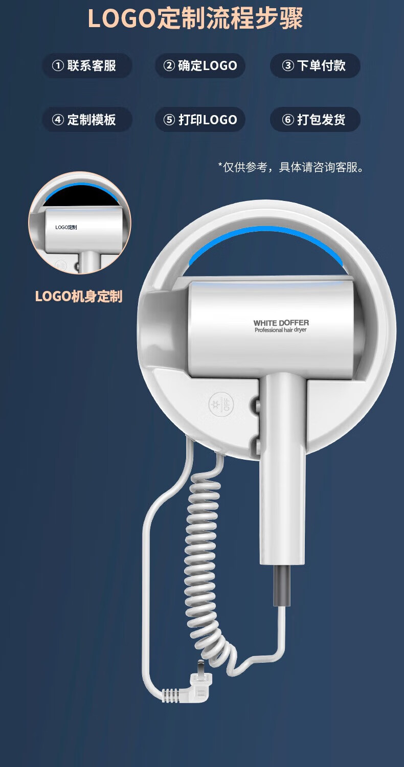 White Doffer hotel hair dryer wall-mounted bathroom punch-free home bathroom high-power hot and cold air blue light hair dryer hanging on the wall does not hurt hair can be customized punch-free + punch white 1600W hotel and guesthouse general