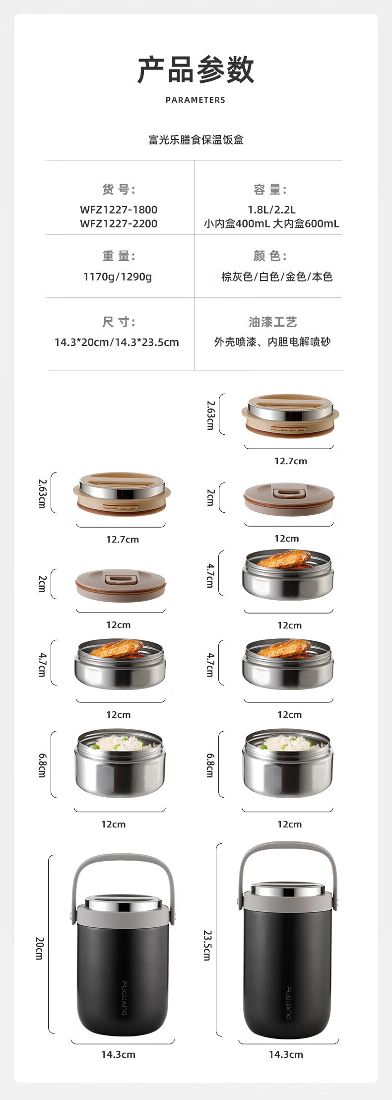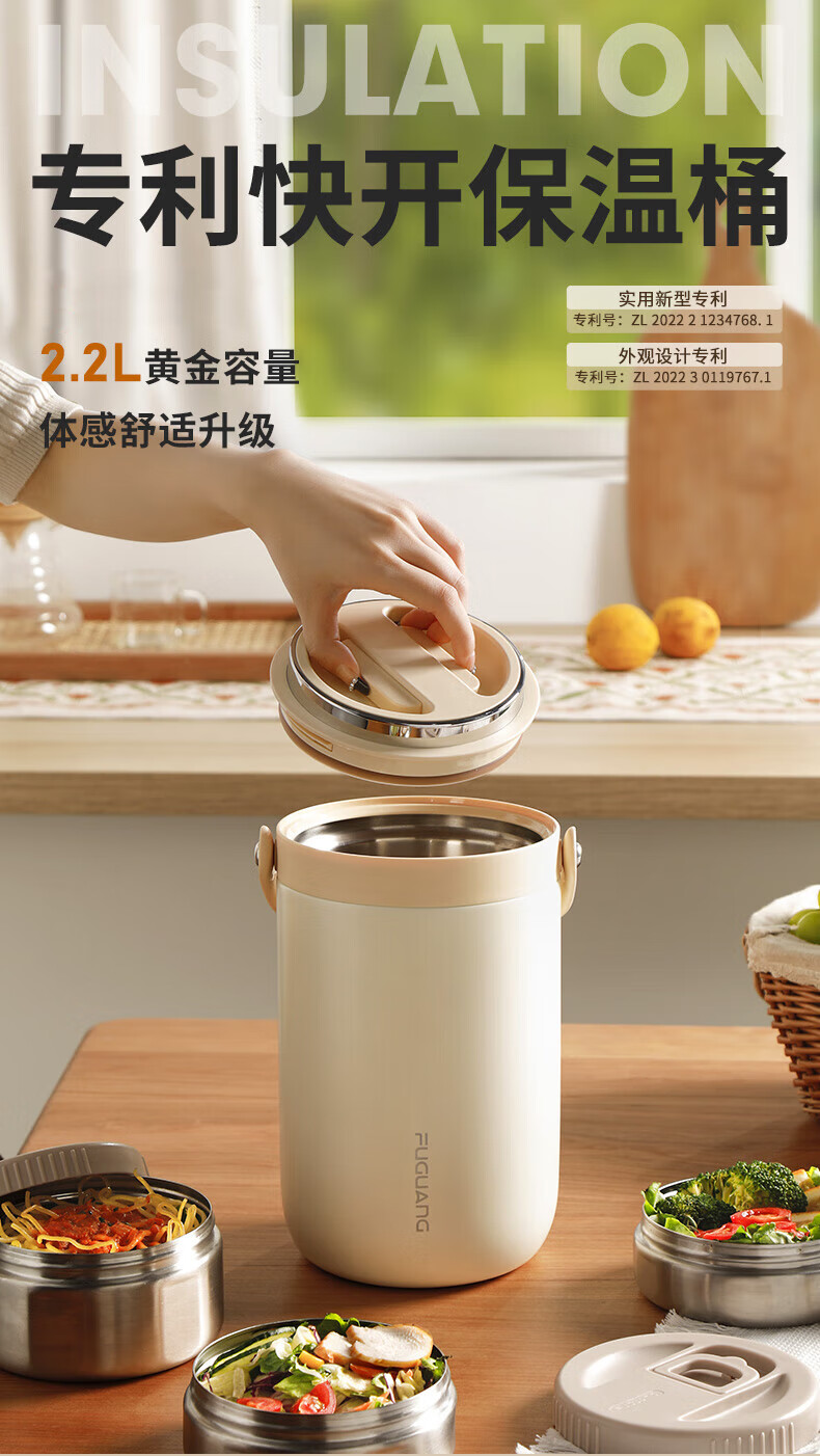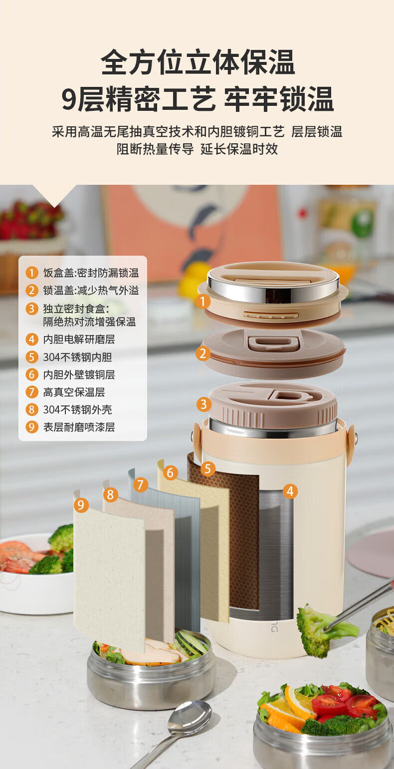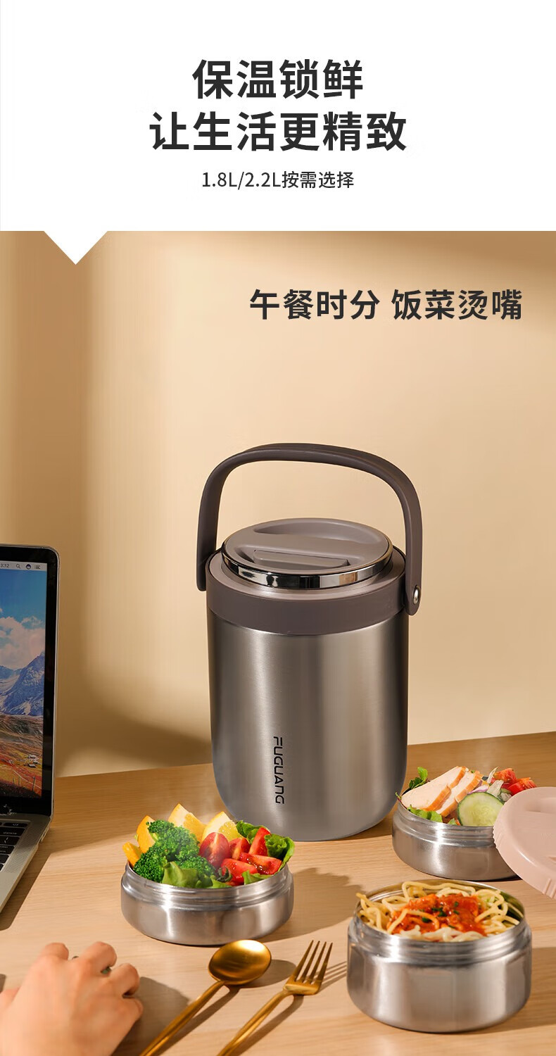 Fuguang insulated lunch box, multi-layered, odor-free, long-lasting insulated lunch box, large capacity, portable lunch box for office workers and students, 1800ml gray antibacterial material, tableware + food bag