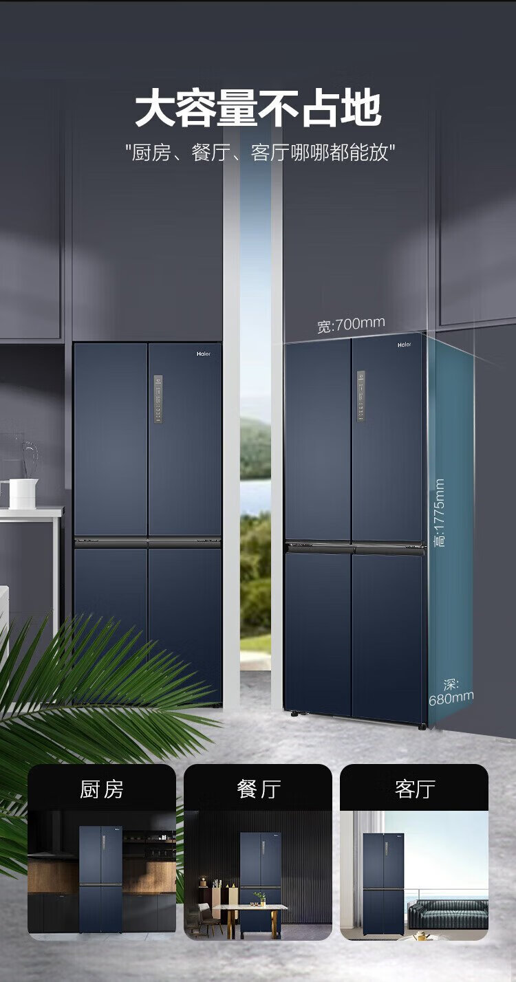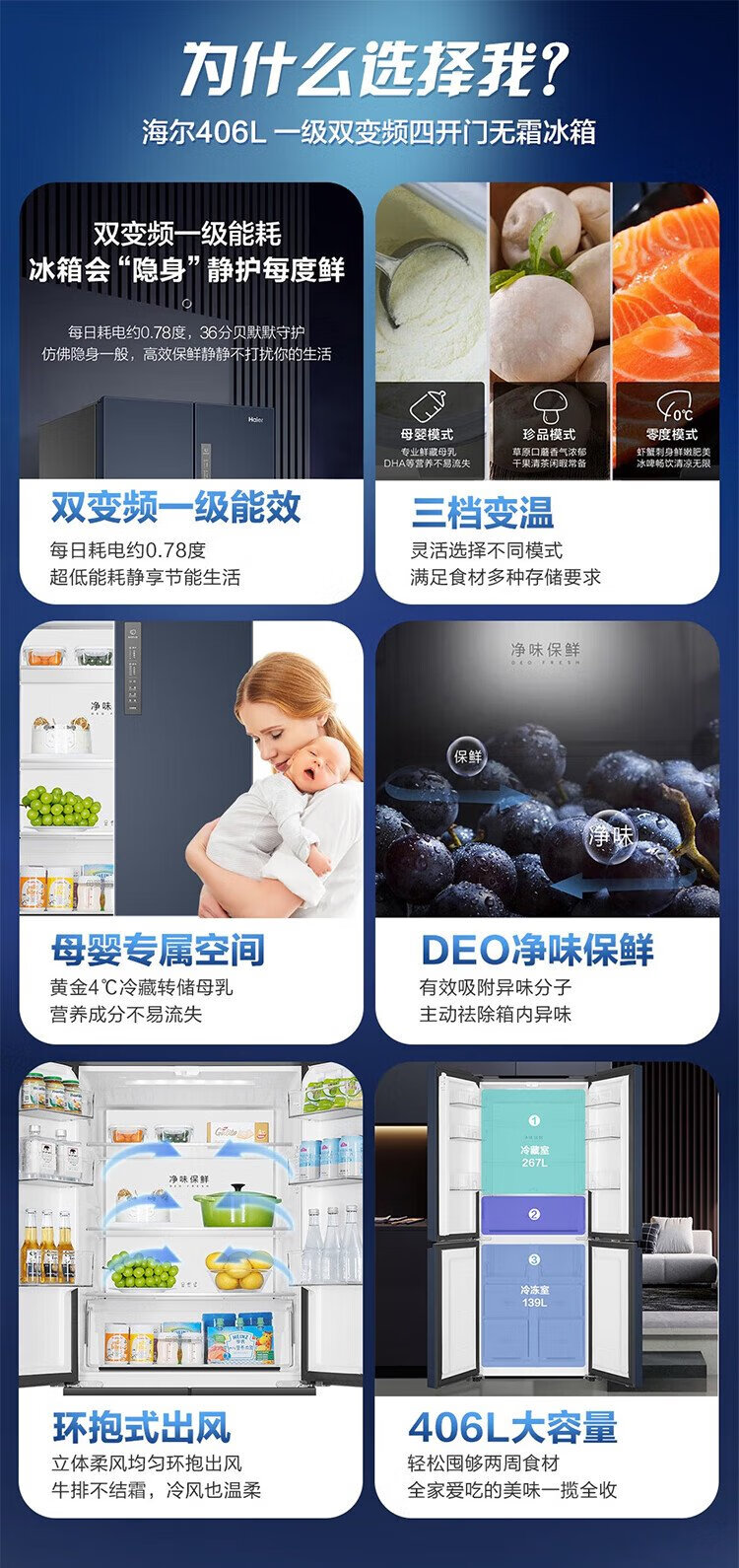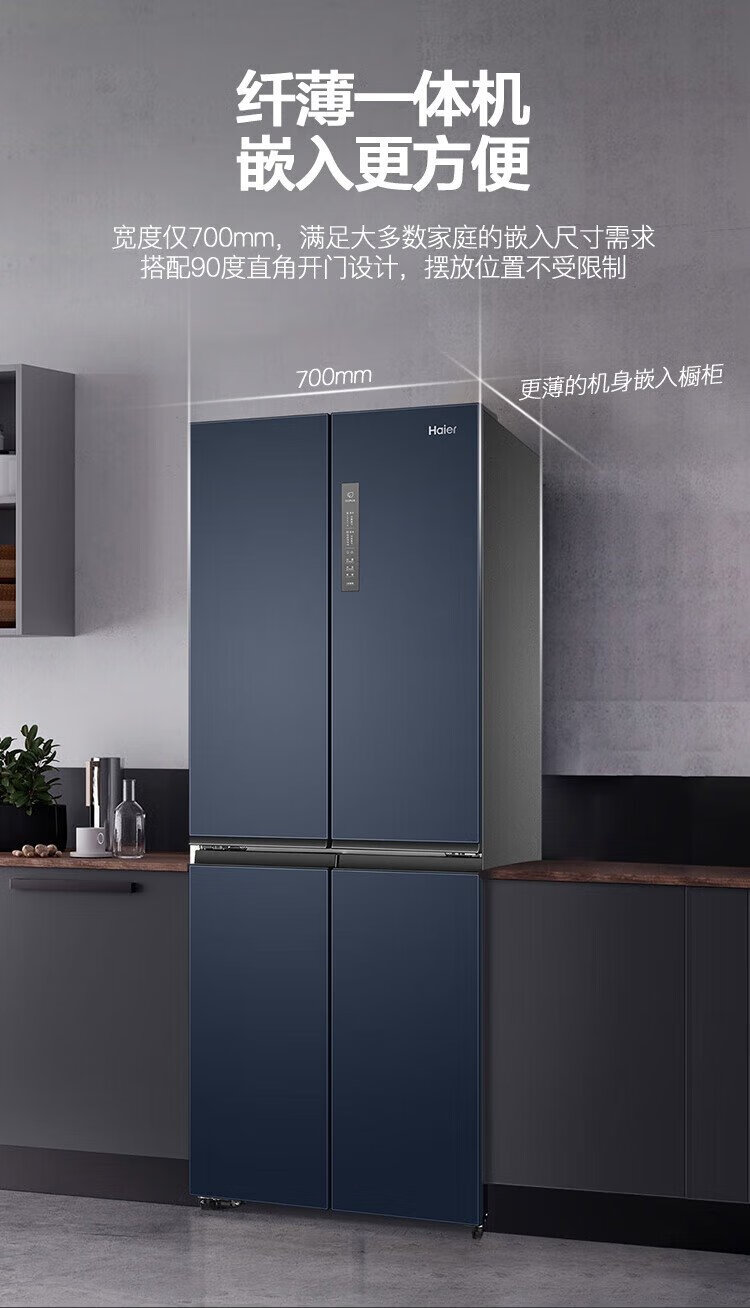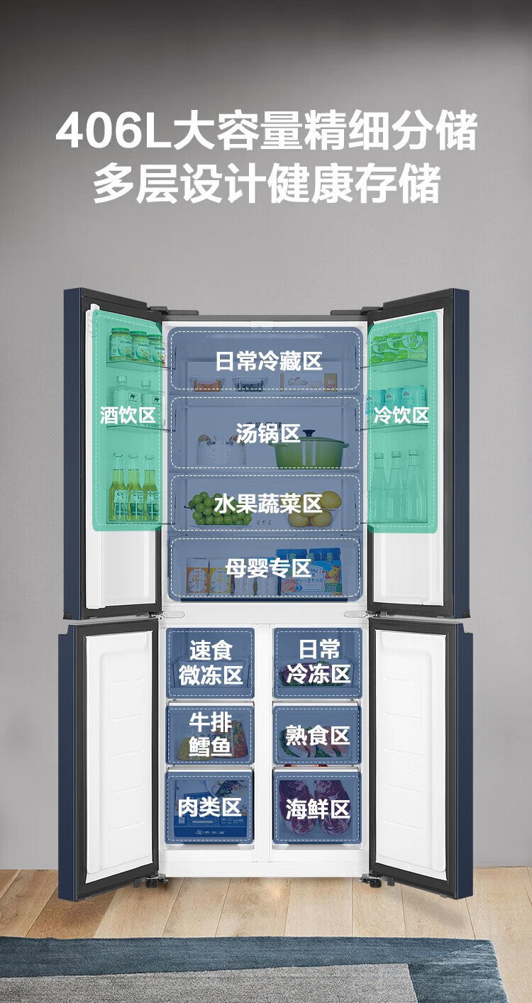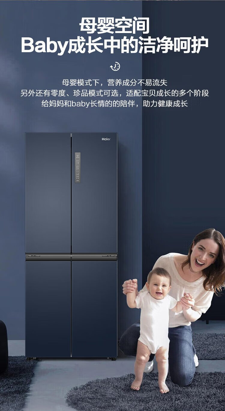 Haier refrigerator 406 liters four-door cross-door ultra-thin air-cooled frost-free first-class energy efficiency dual-frequency maternal and infant space energy-saving and energy-saving household refrigerator state subsidy 20% Star Stone Blue 406 liters maternal and infant temperature changing space + DEO purification
