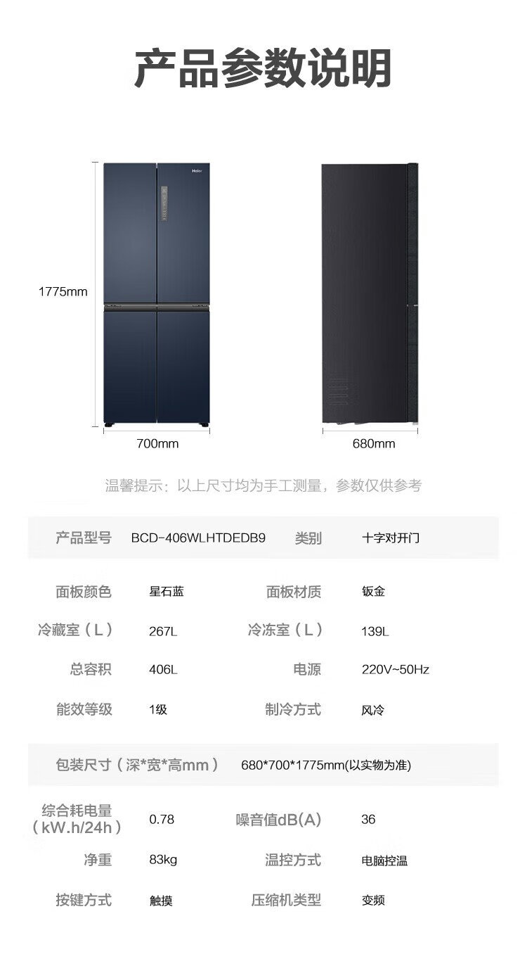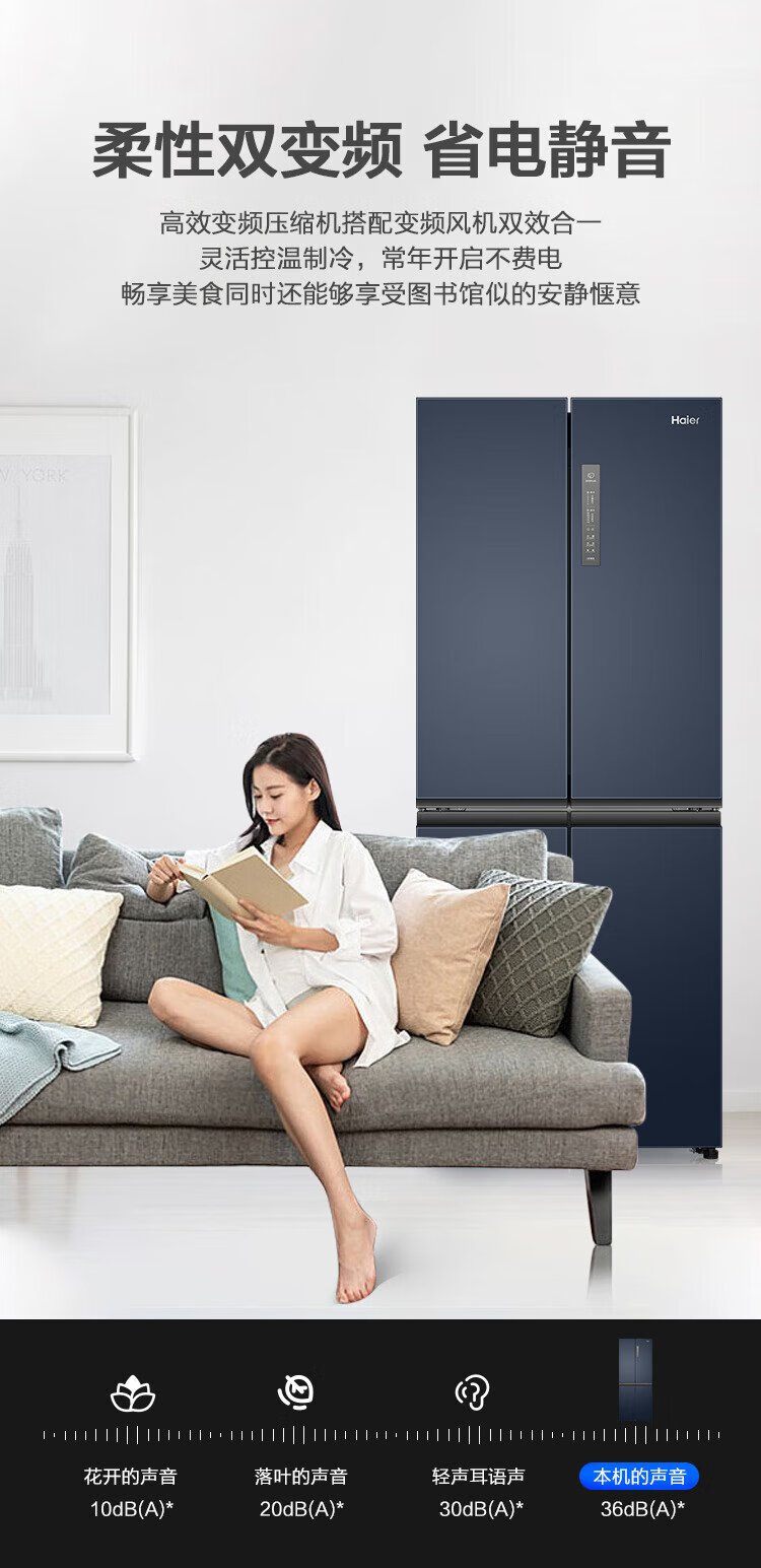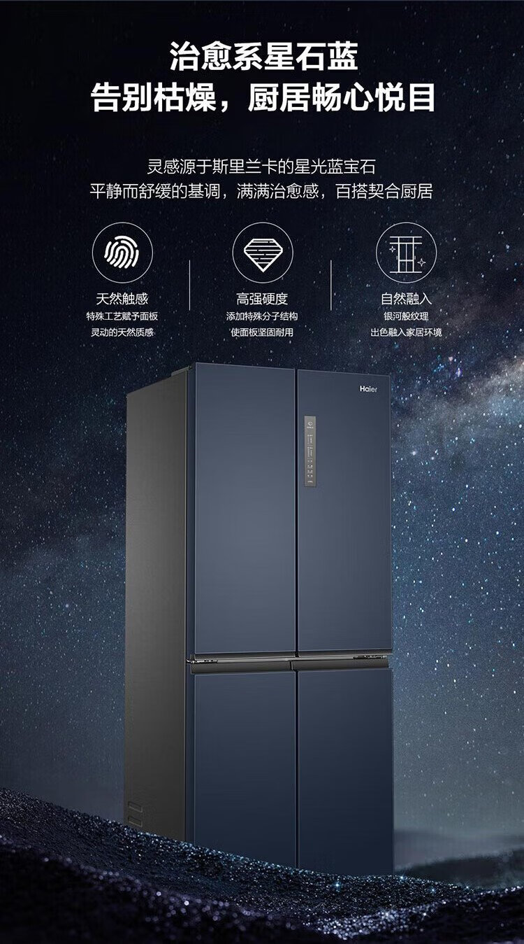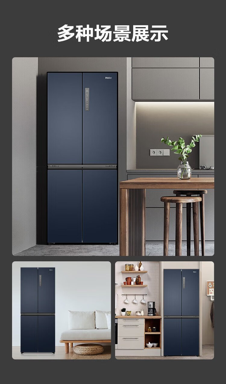 Haier refrigerator 406 liters four-door cross-door ultra-thin air-cooled frost-free first-class energy efficiency dual-frequency maternal and infant space energy-saving and energy-saving household refrigerator state subsidy 20% Star Stone Blue 406 liters maternal and infant temperature changing space + DEO purification