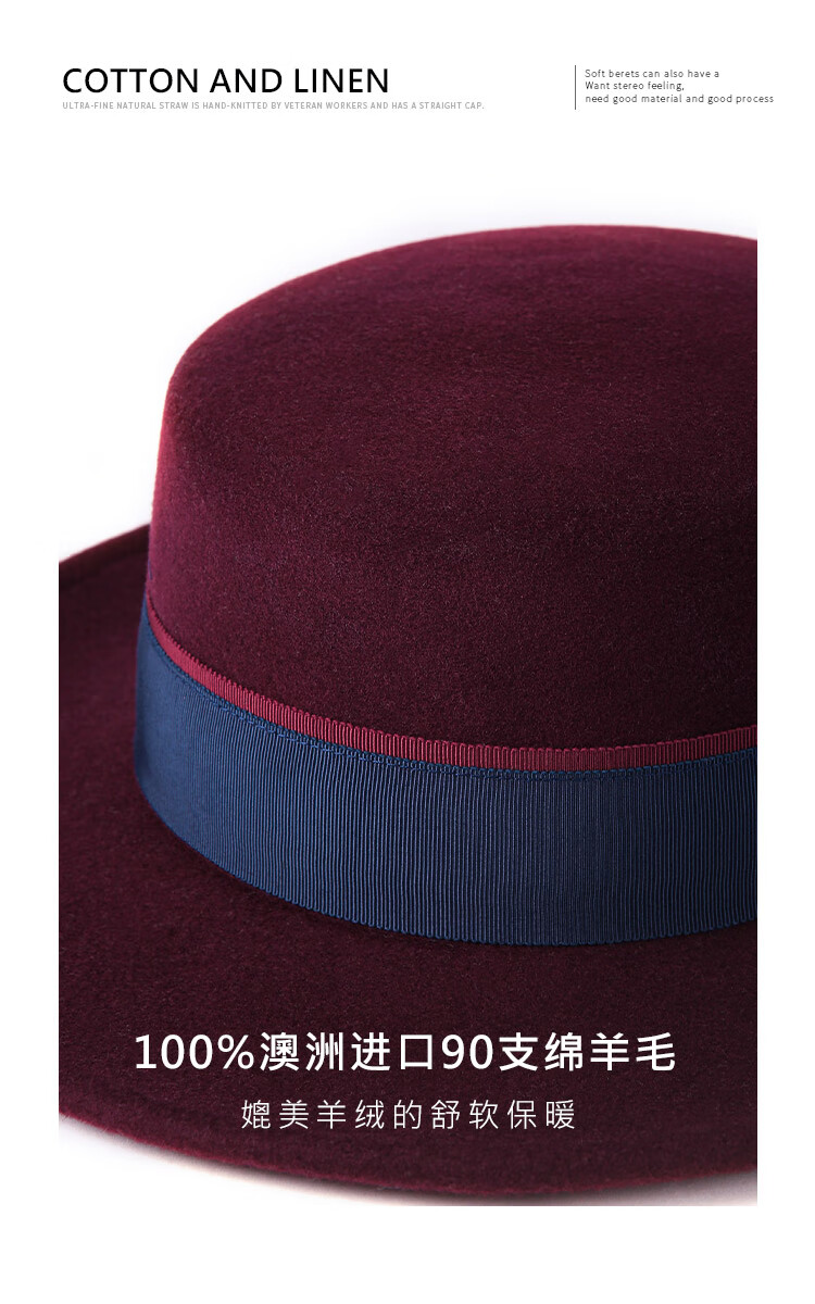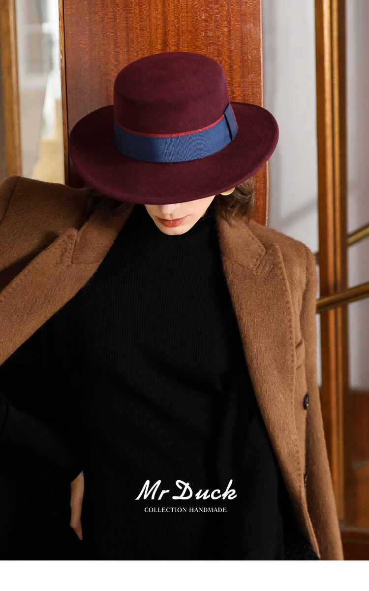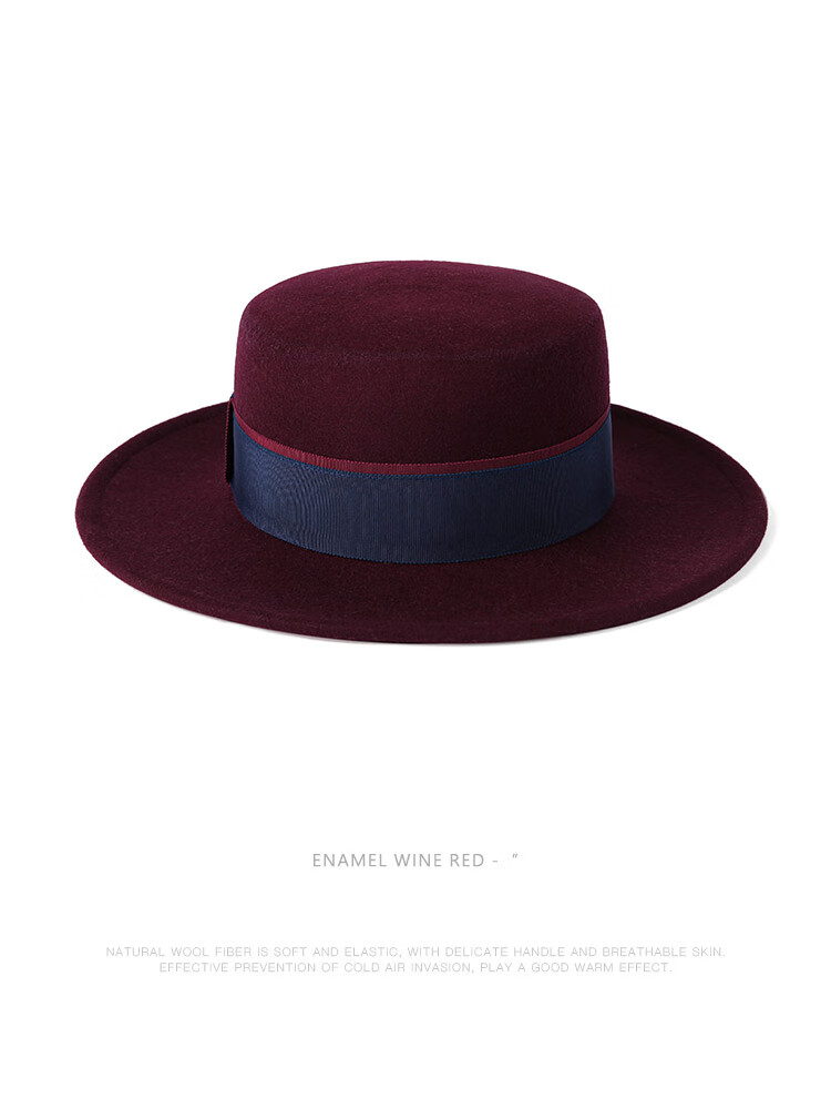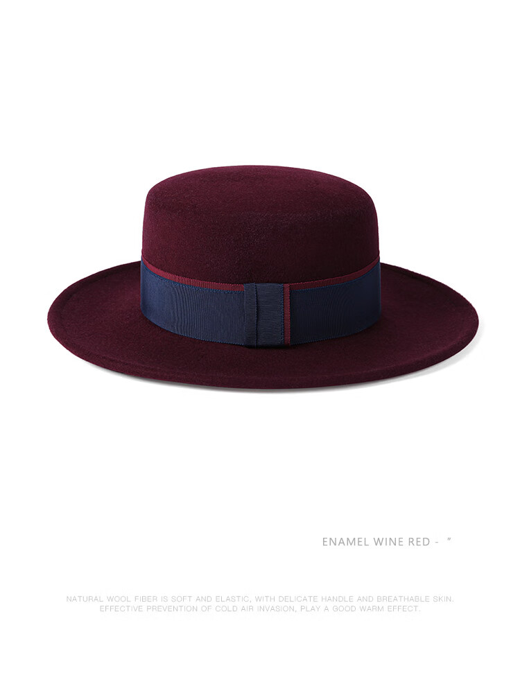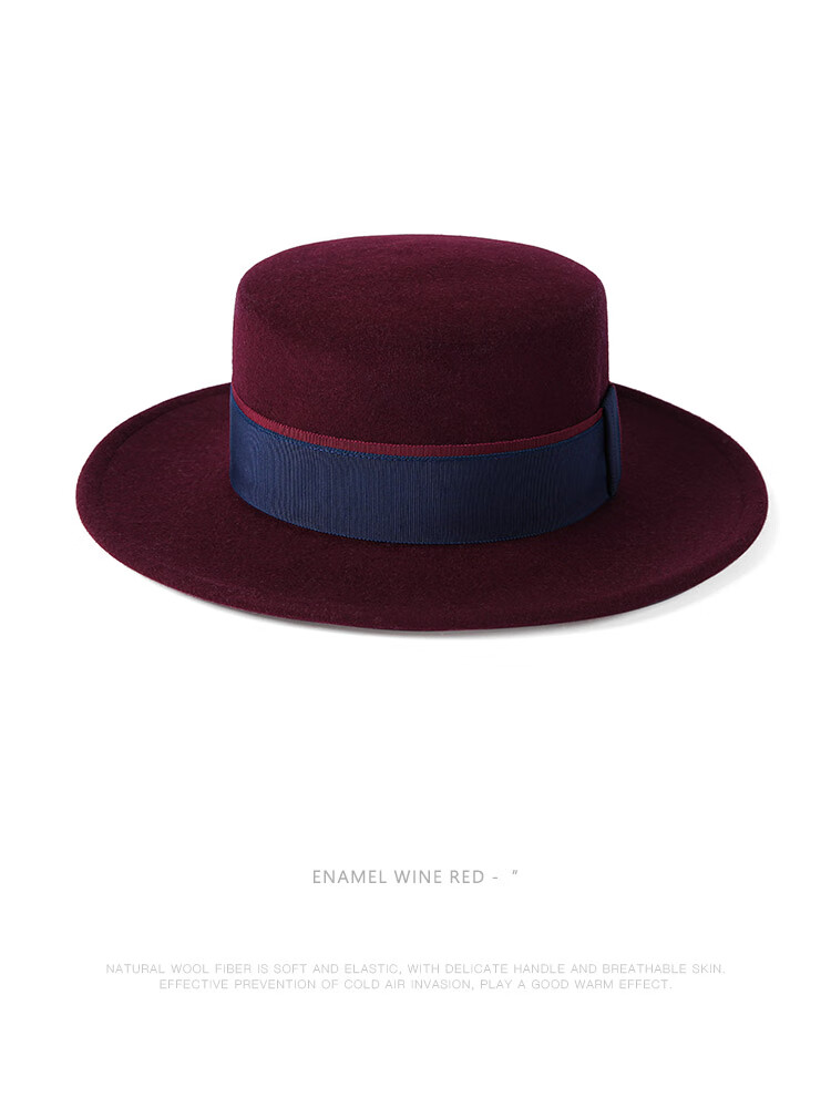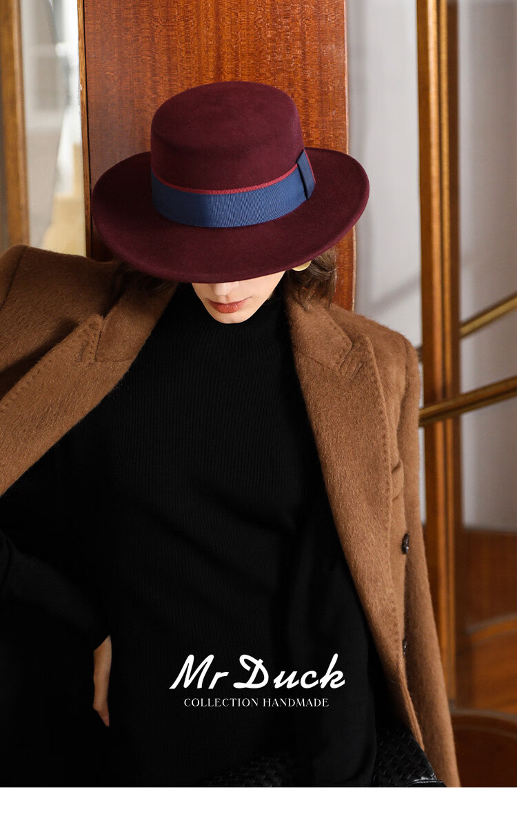 Mr DUCK Australian wool flat top hat for women New Year atmosphere festive hat Qiji red French style handmade felt hat MW462145-enamel wine red (double patchwork ribbon) L (57-58cm)