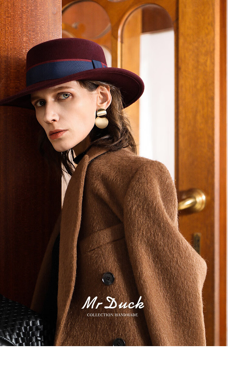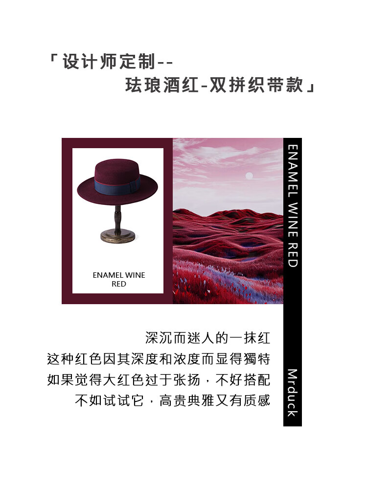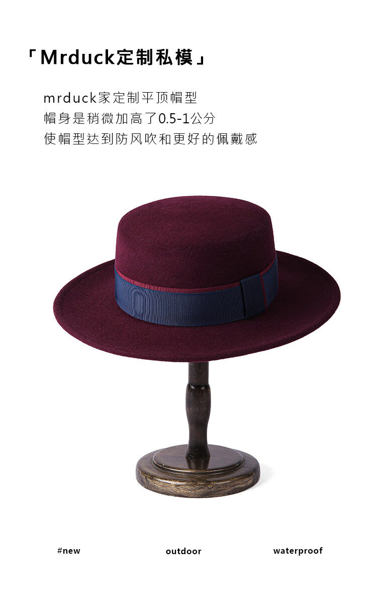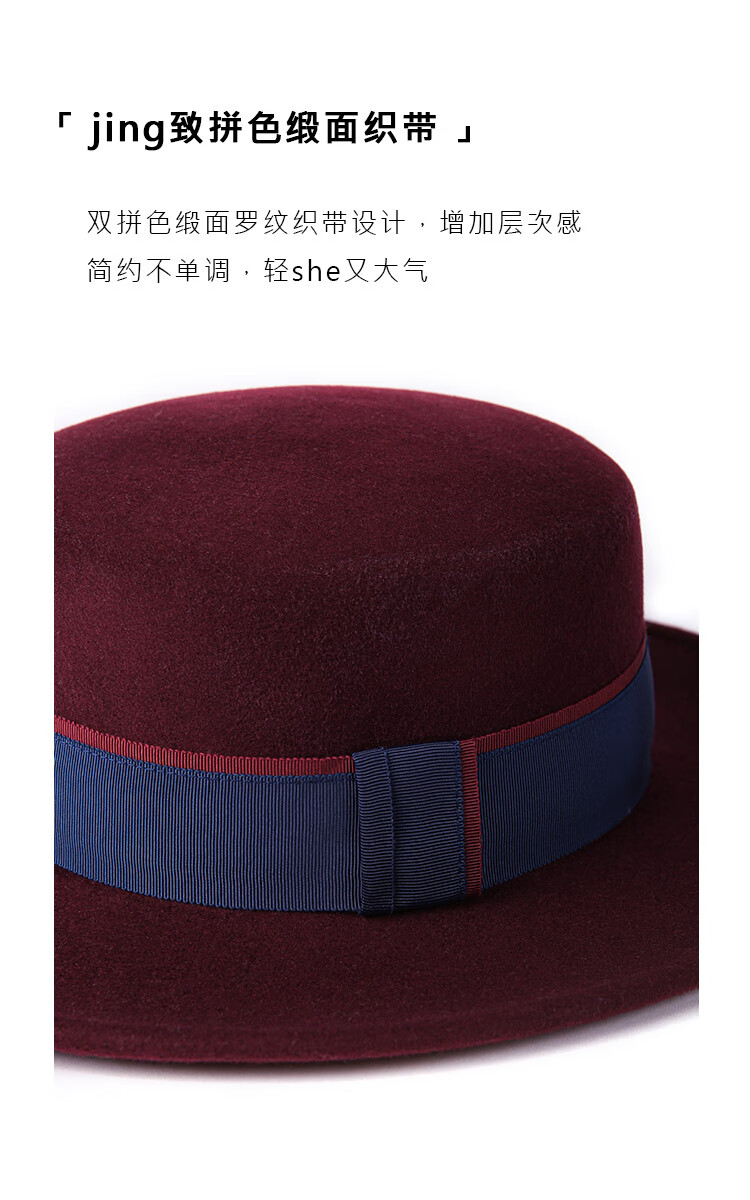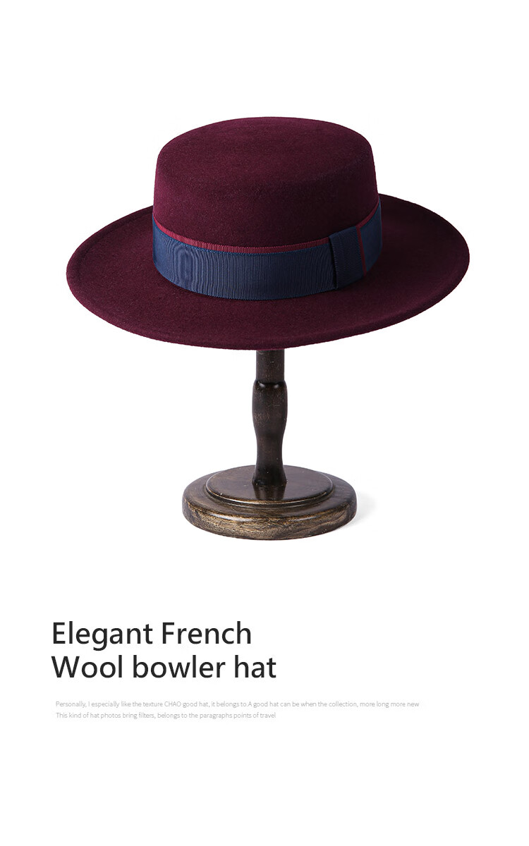 Mr DUCK Australian wool flat top hat for women New Year atmosphere festive hat Qiji red French style handmade felt hat MW462145-enamel wine red (double patchwork ribbon) L (57-58cm)
