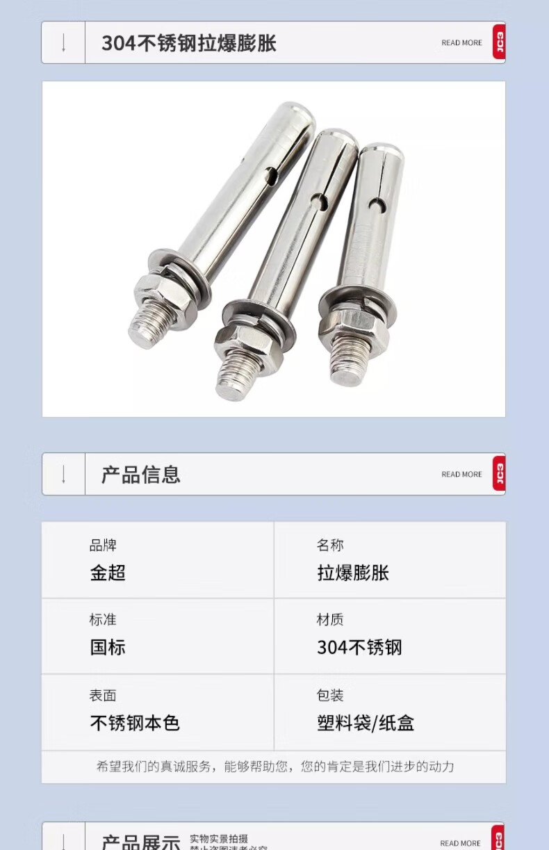 Jinchao 304 stainless steel expansion screws, color zinc, explosion pipe, explosion nail, external expansion screw, expansion pipe, M6*50 (10 pieces), color zinc