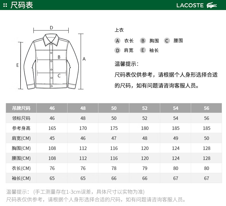 China (cm) 165 / 88-90 170 / 96-98 175 / 108-110 180 / 118-122 185 / 126-130