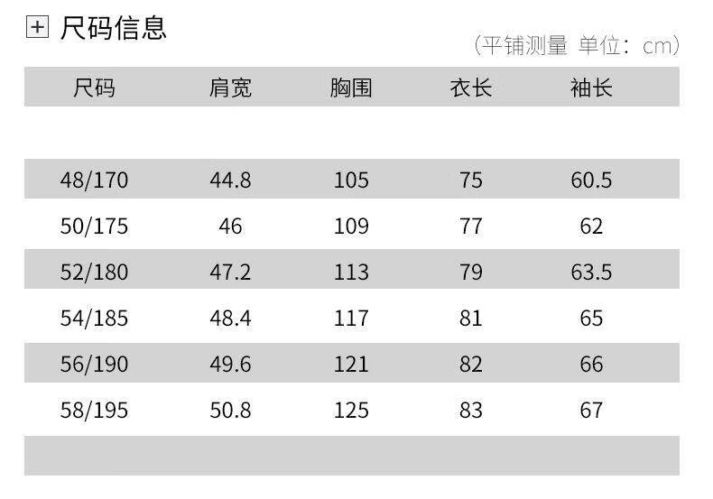 China (cm) 165 / 88-90 170 / 96-98 175 / 108-110 180 / 118-122 185 / 126-130