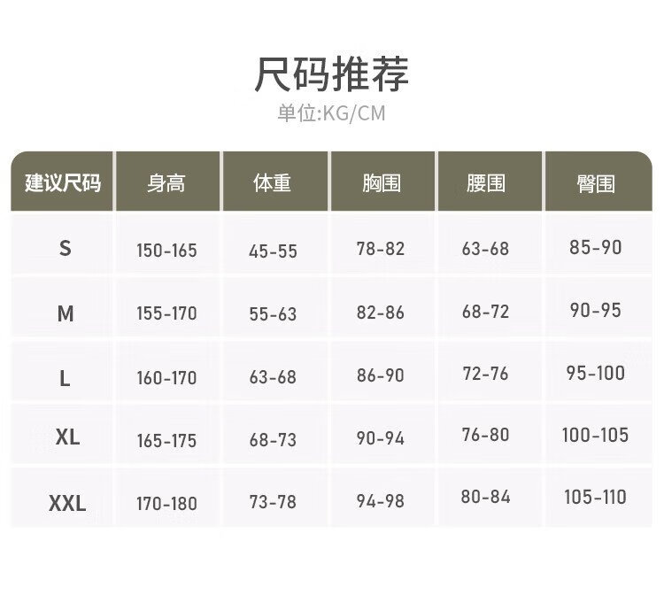 China (cm) 165 / 88-90 170 / 96-98 175 / 108-110 180 / 118-122 185 / 126-130