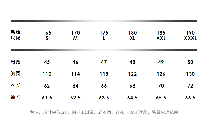 China (cm) 165 / 88-90 170 / 96-98 175 / 108-110 180 / 118-122 185 / 126-130