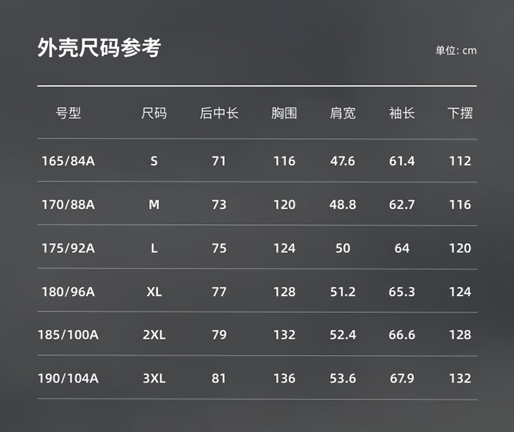 China (cm) 165 / 88-90 170 / 96-98 175 / 108-110 180 / 118-122 185 / 126-130