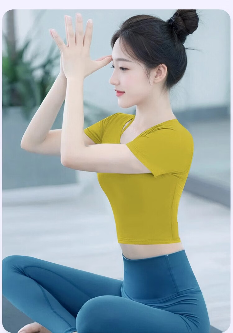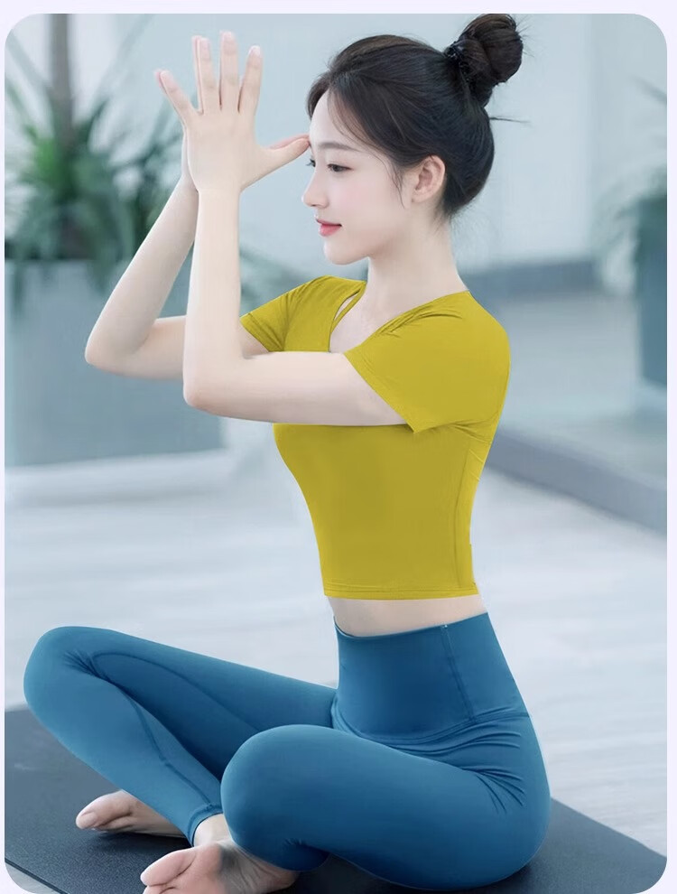 Shuangxiu Dopamine Yoga Wear 2025 New Style Summer Short Sleeve Professional Pilates Running Fitness Clothing Tops for Women with Breast Pads Leaf Yellow Top + Royal Blue Pants Suit M 100-110Jin Jin is equal to 0.5 kg