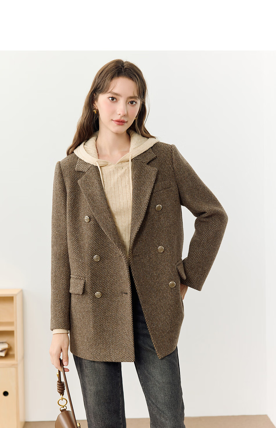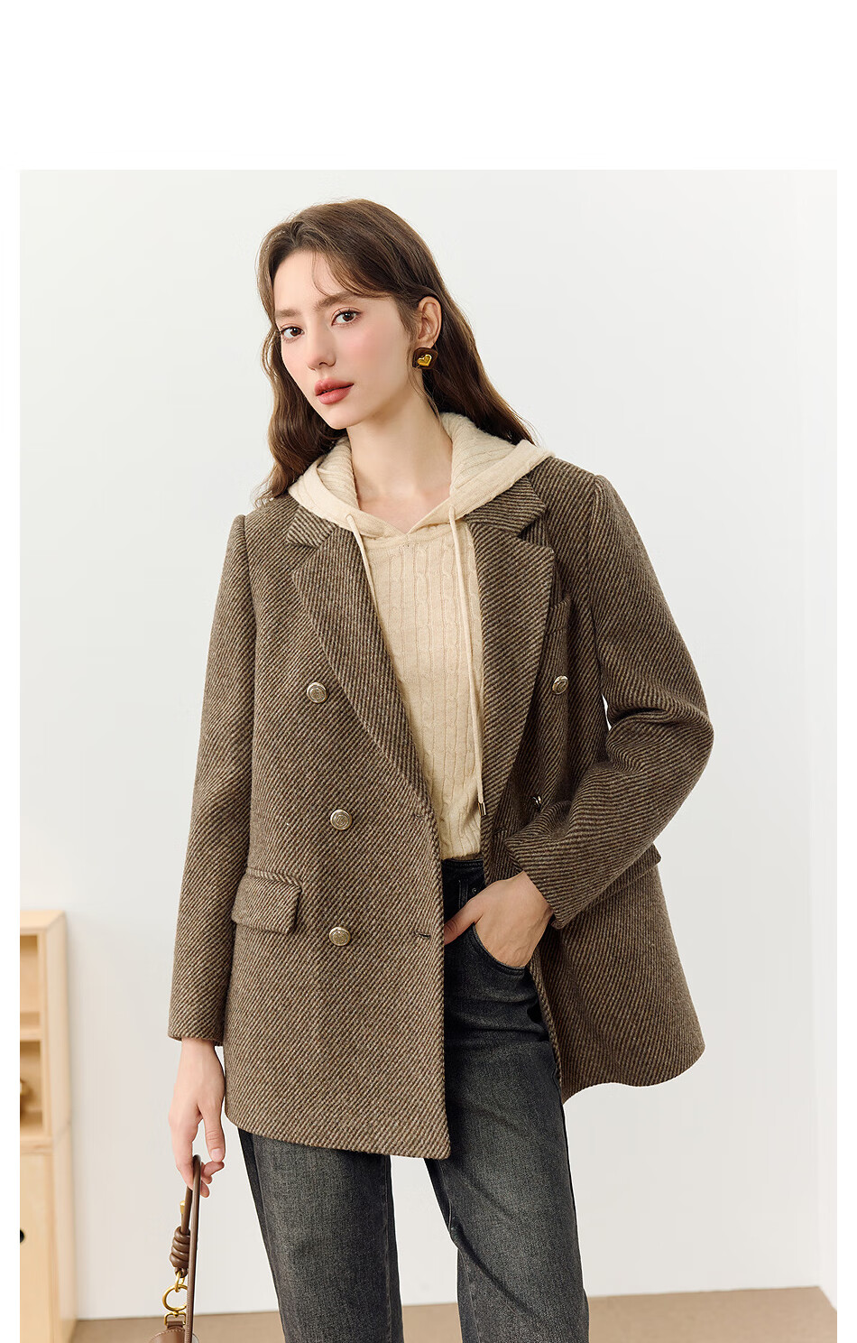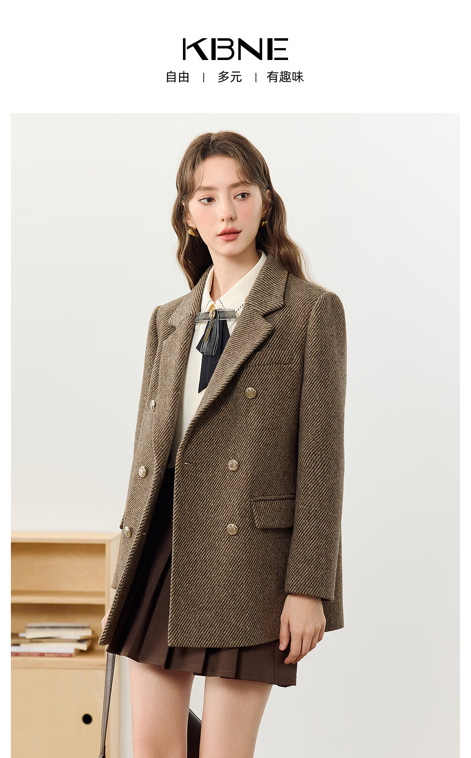 KBNE all wool old money style suit jacket for women in autumn and winter new style lazy high-end casual suit for women brown M