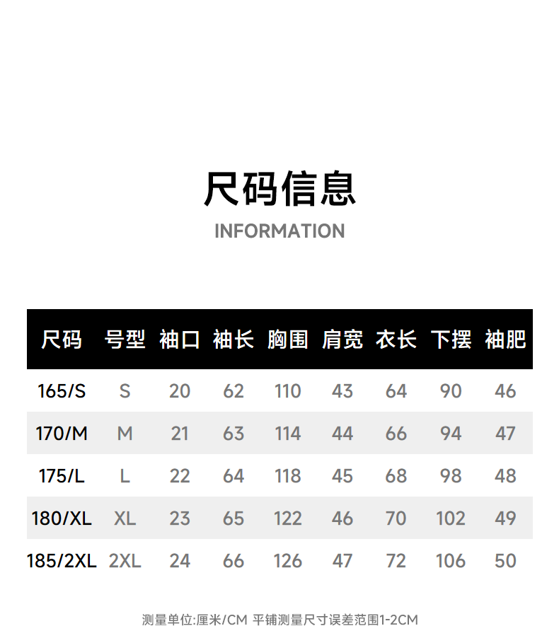 China (cm) 165 / 88-90 170 / 96-98 175 / 108-110 180 / 118-122 185 / 126-130