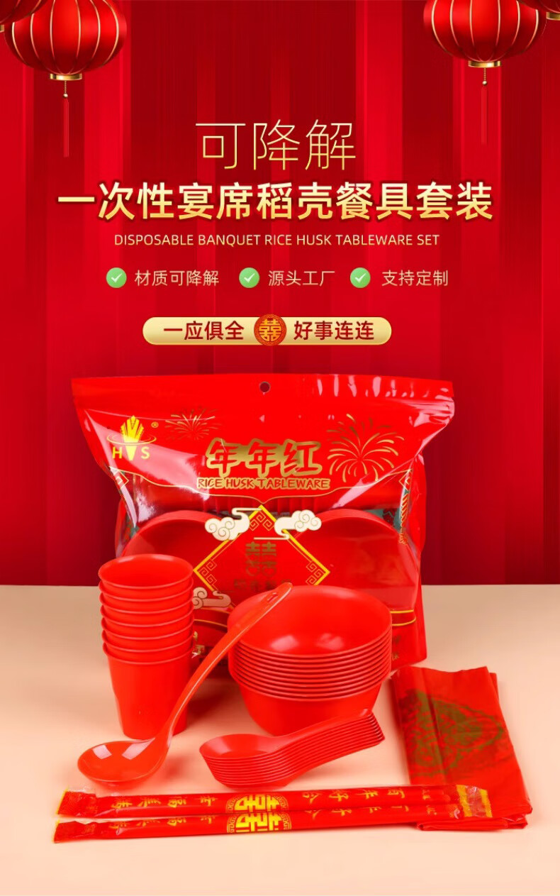 Fuguan rice husk disposable tableware wedding red set banquet birthday household bowls and chopsticks wedding banquet spoon food grade red rice husk bowl + cup + spoon 50 each