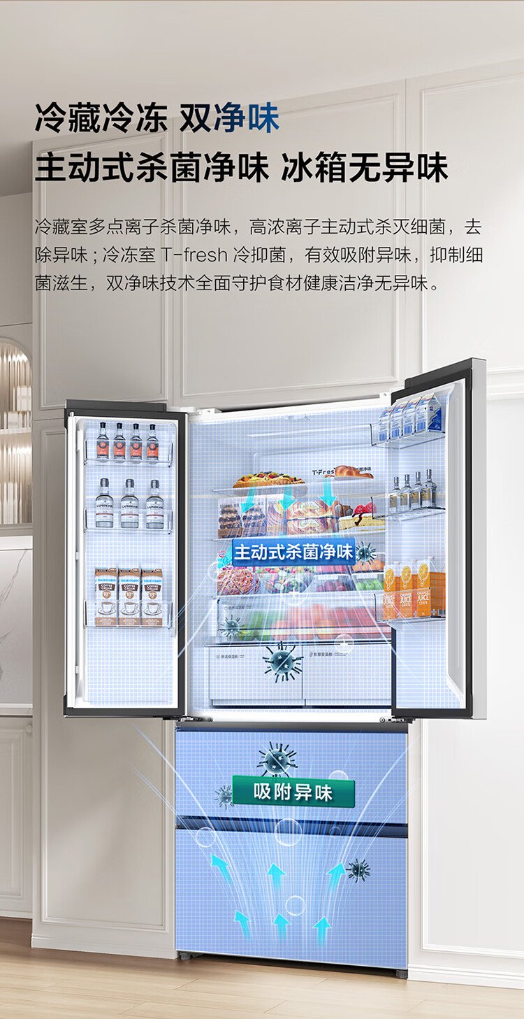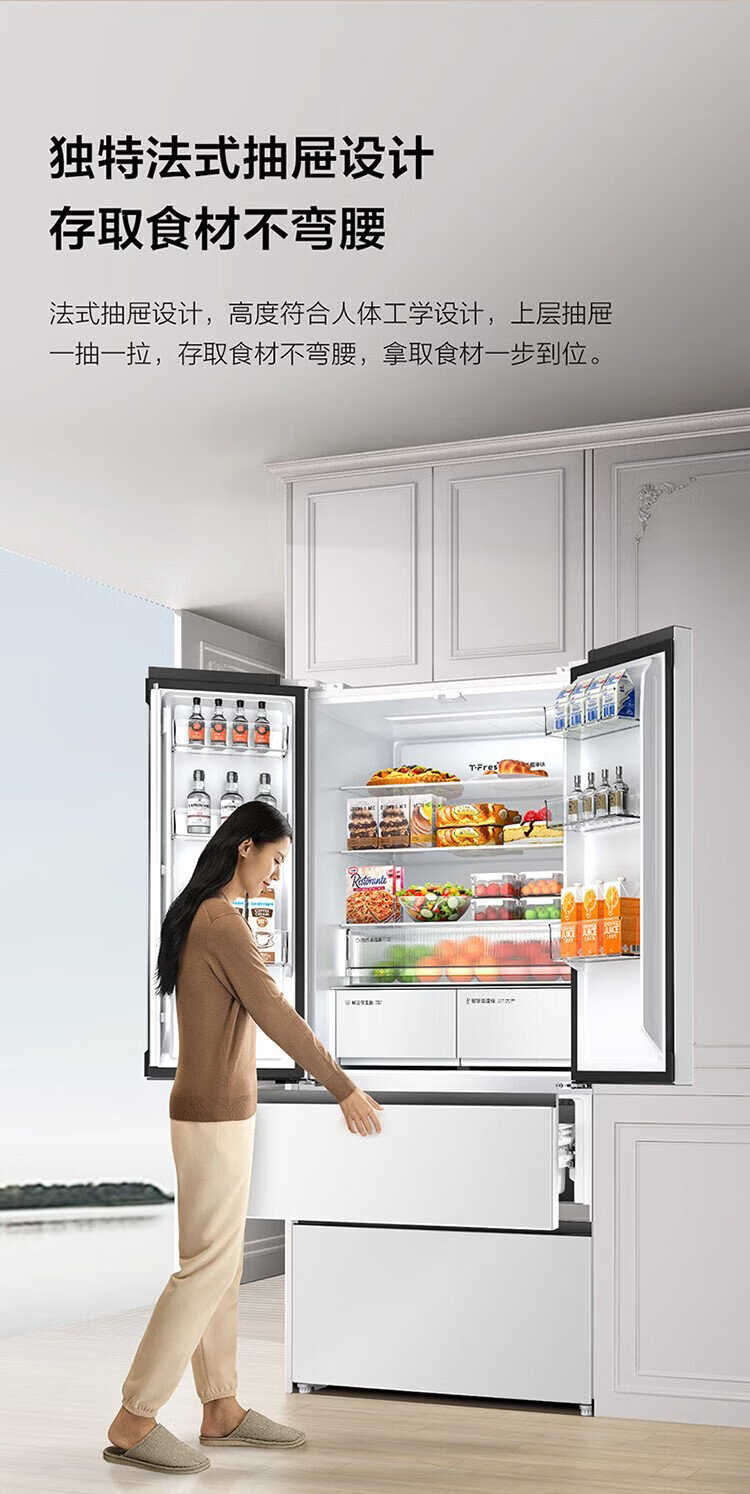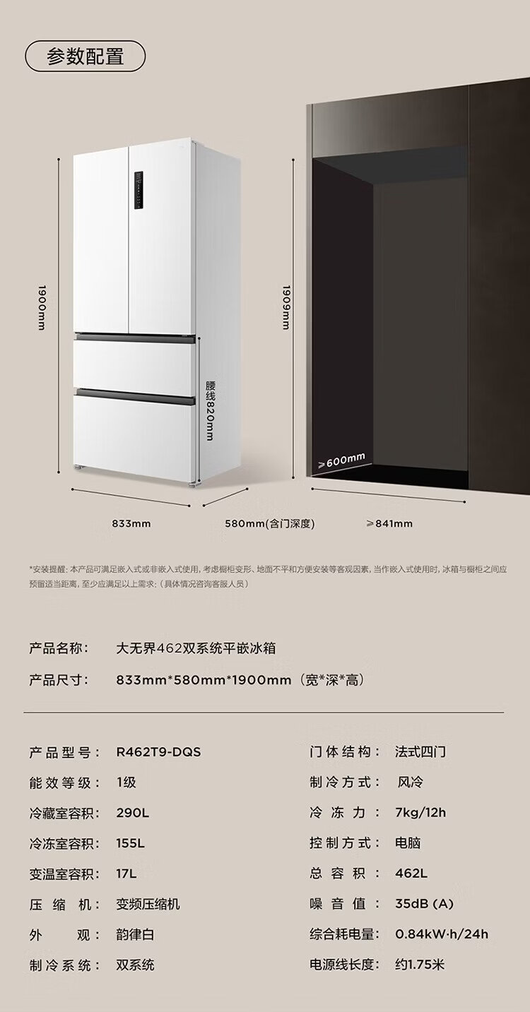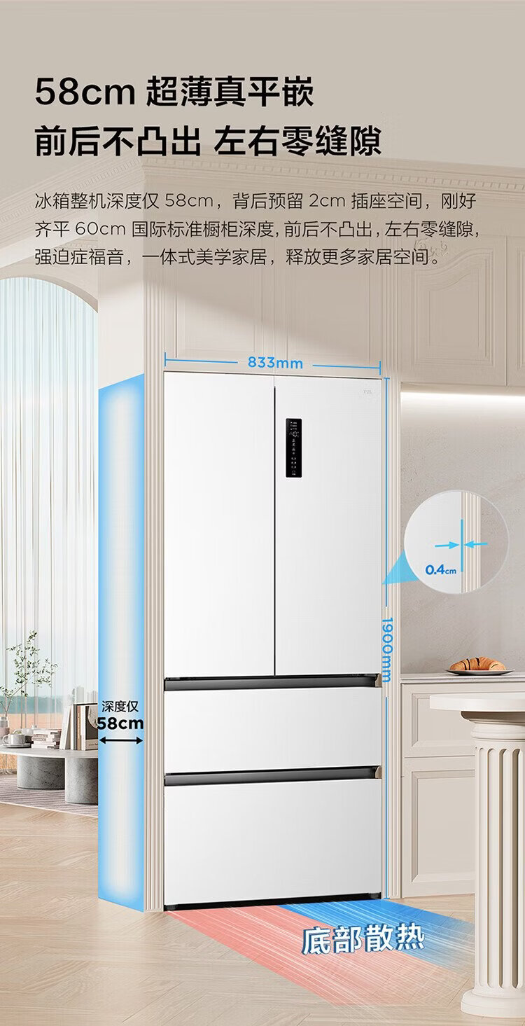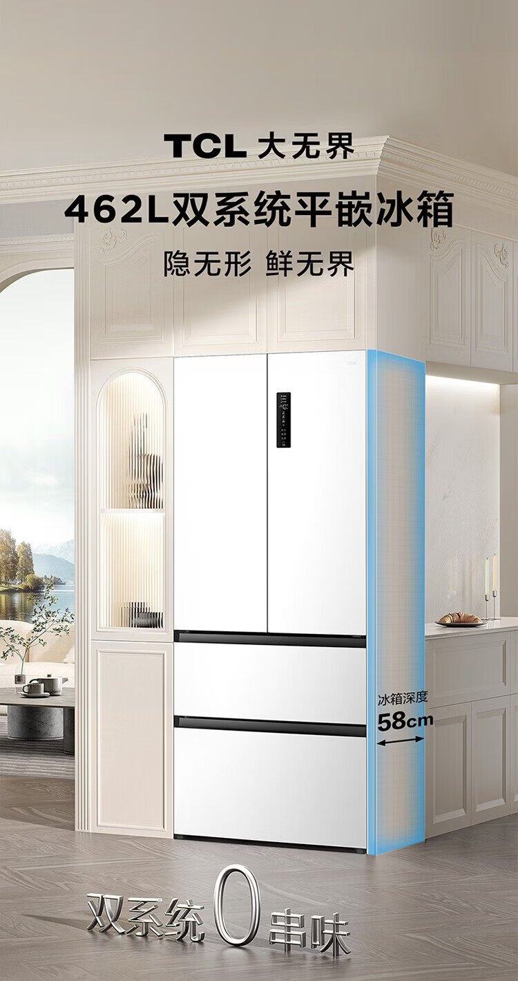 TCL Big Unbounded 462-liter T9 Pro French multi-door four-door 58cm ultra-thin zero-embedded dual system dual cycle household refrigerator first-class energy efficiency trade-in R462T9-DQS Rhythm White