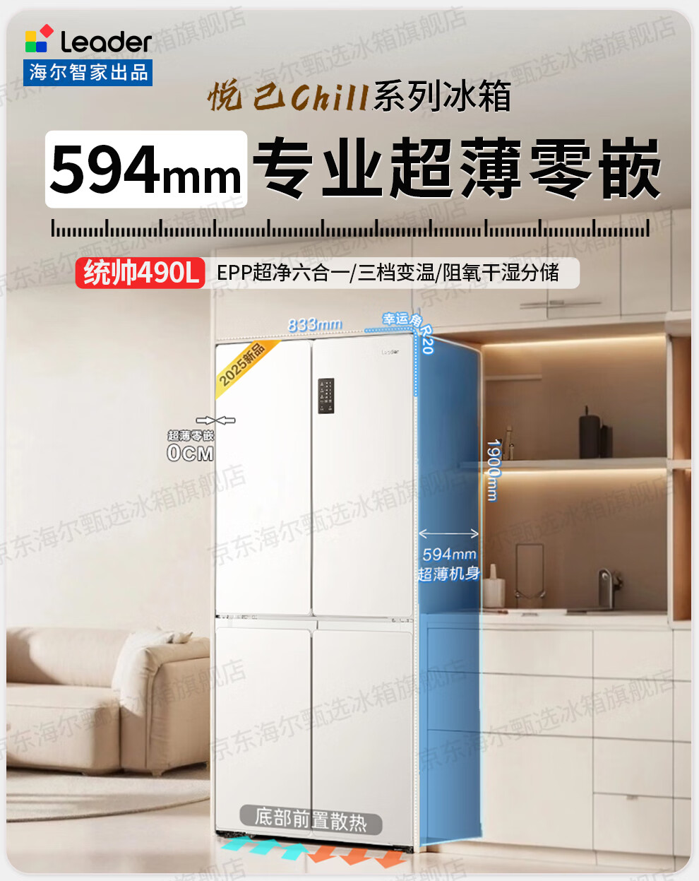 Haier refrigerator produces 516 ultra-thin zero-embedded 490-liter four-door cross-door first-class energy-efficiency dual-frequency household large-capacity refrigerator bottom cooling state subsidy Leader Ultra-thin 594mm zero-embedded + EPP ultra-clean + dry and wet separate storage + three-speed temperature change