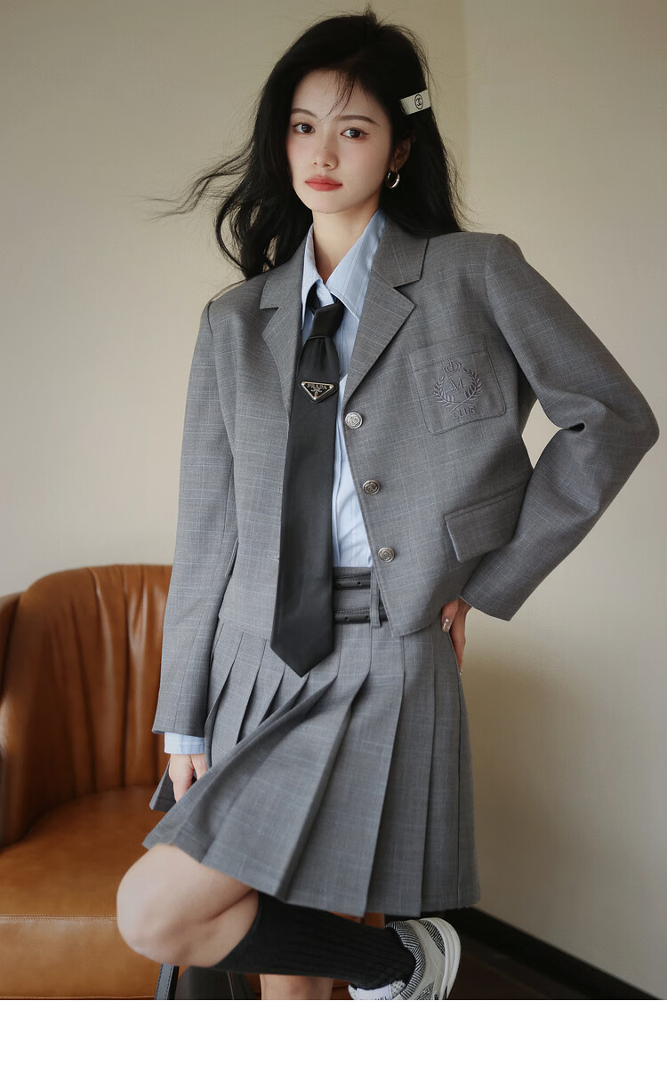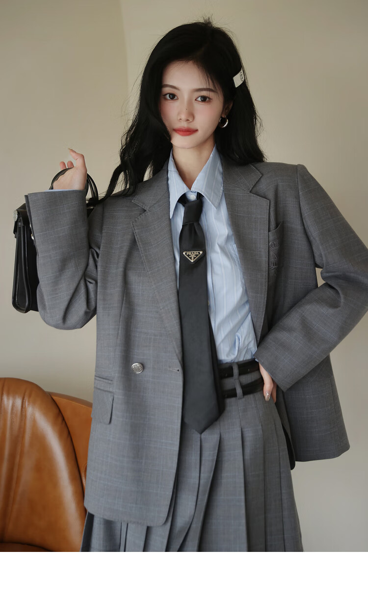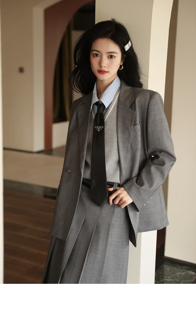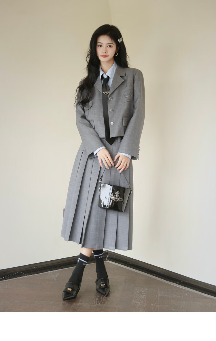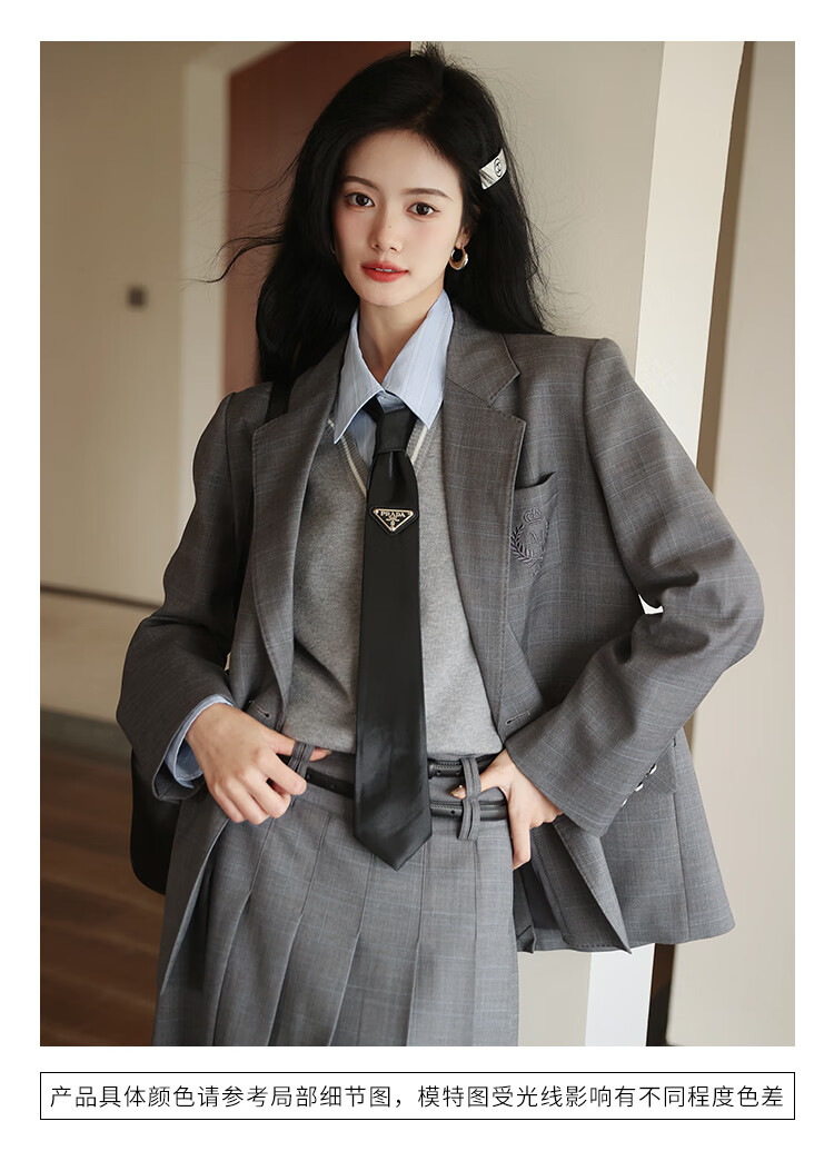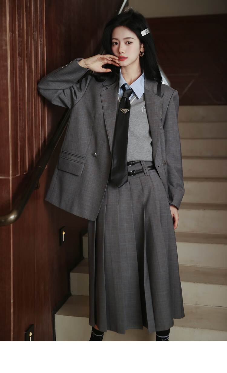 Plum Ripe St. Martin's Temperament Gray Suit Suit Women's British College Style Casual Jacket Half Skirt Gray Plaid (Short Suit) S