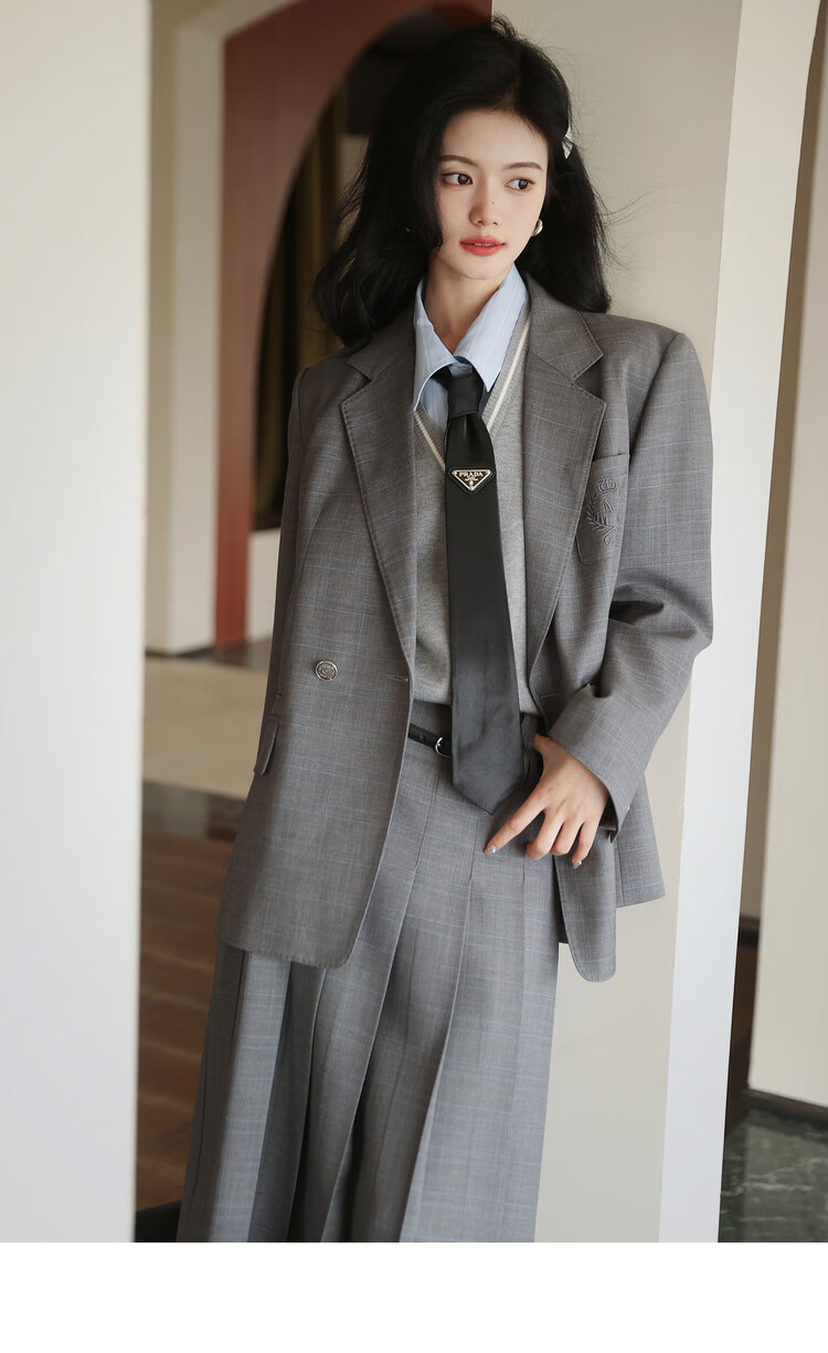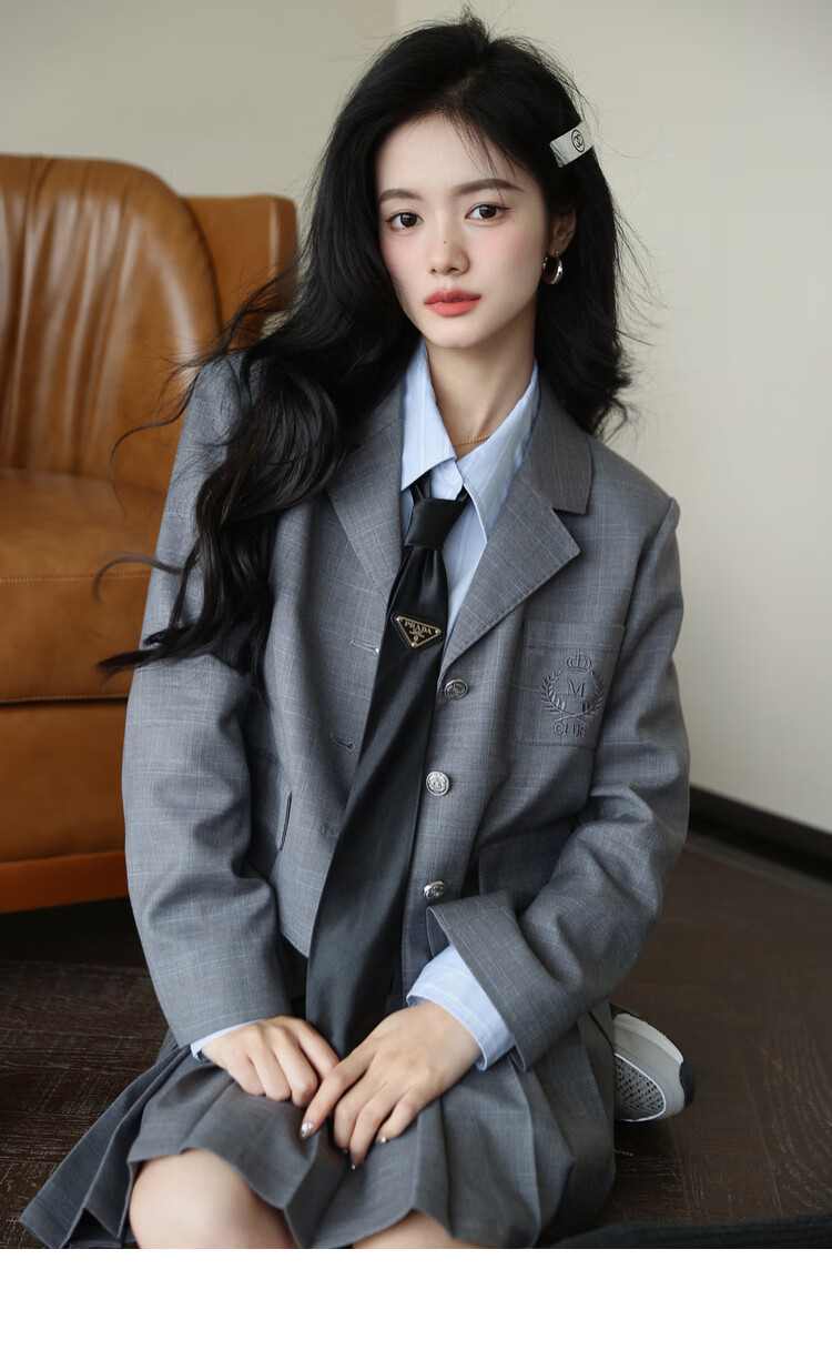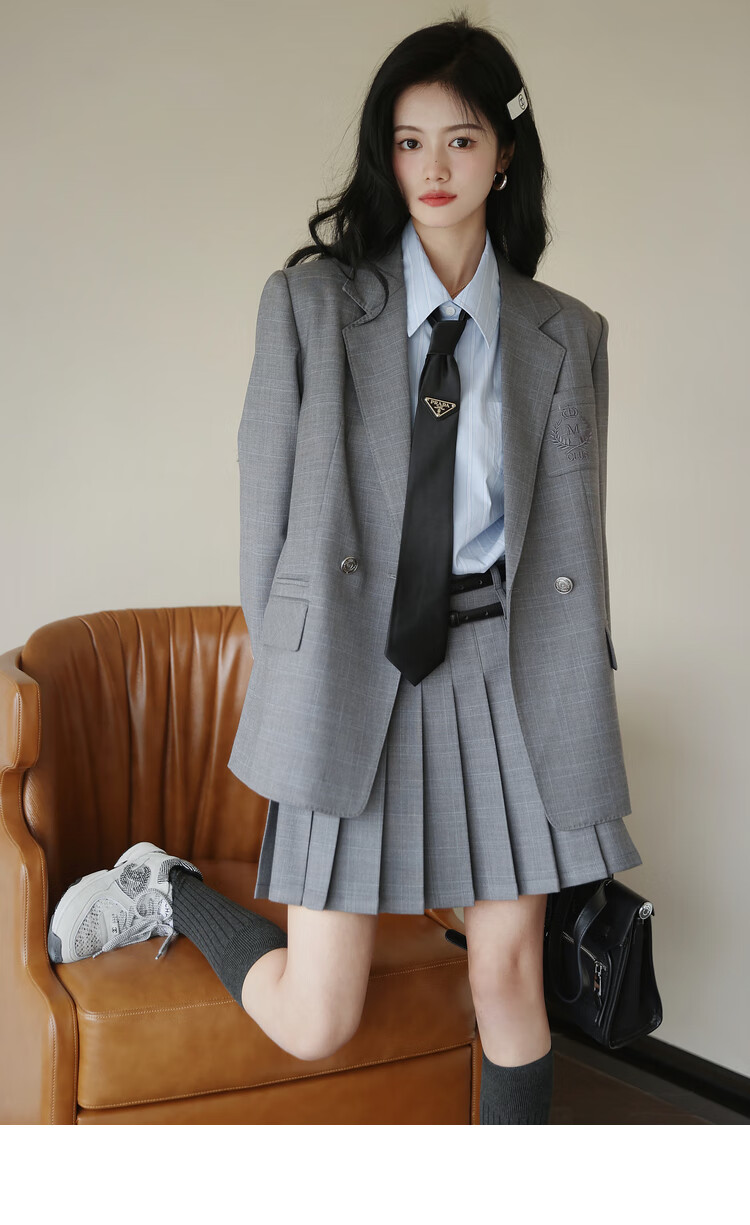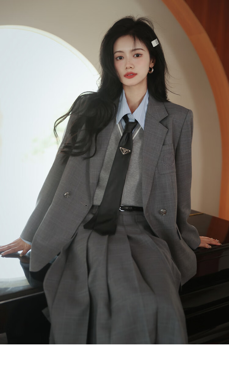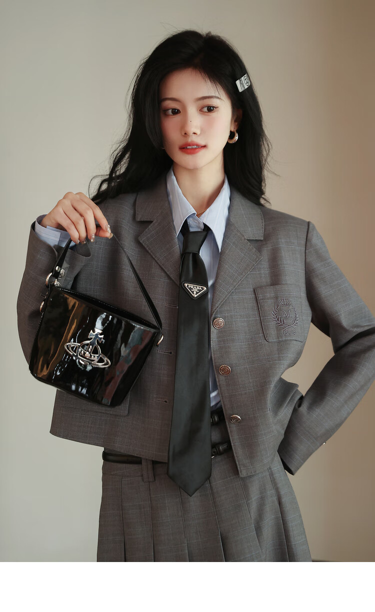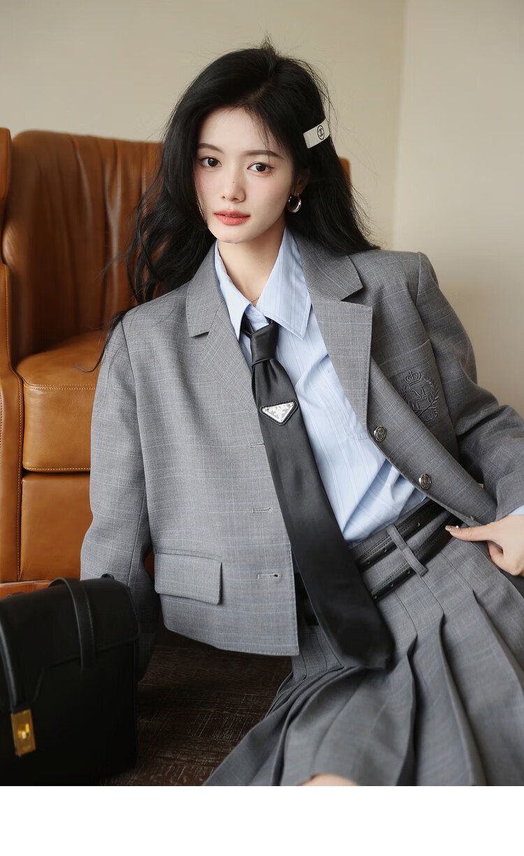 Plum Ripe St. Martin's Temperament Gray Suit Suit Women's British College Style Casual Jacket Half Skirt Gray Plaid (Short Suit) S