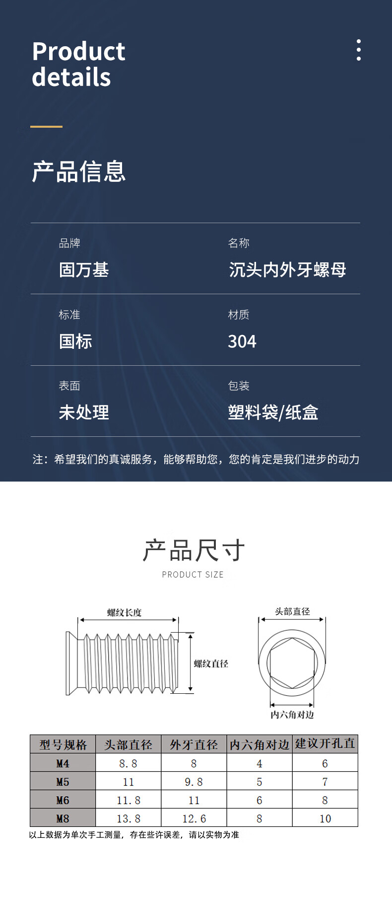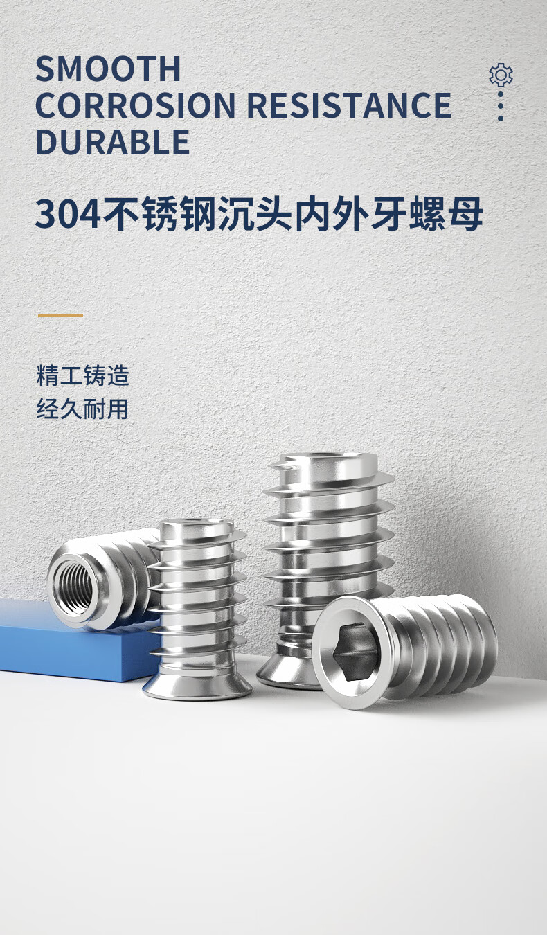 Guwanji 304 stainless steel internal and external thread nuts, furniture nuts, countersunk head, hexagonal embedded parts, screw caps, national standards, M4x10 (5 pieces) 304