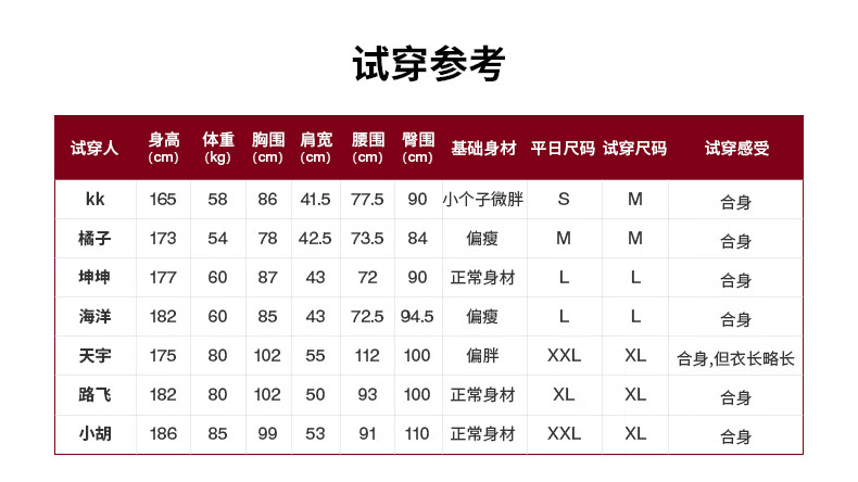 China (cm) 165 / 88-90 170 / 96-98 175 / 108-110 180 / 118-122 185 / 126-130