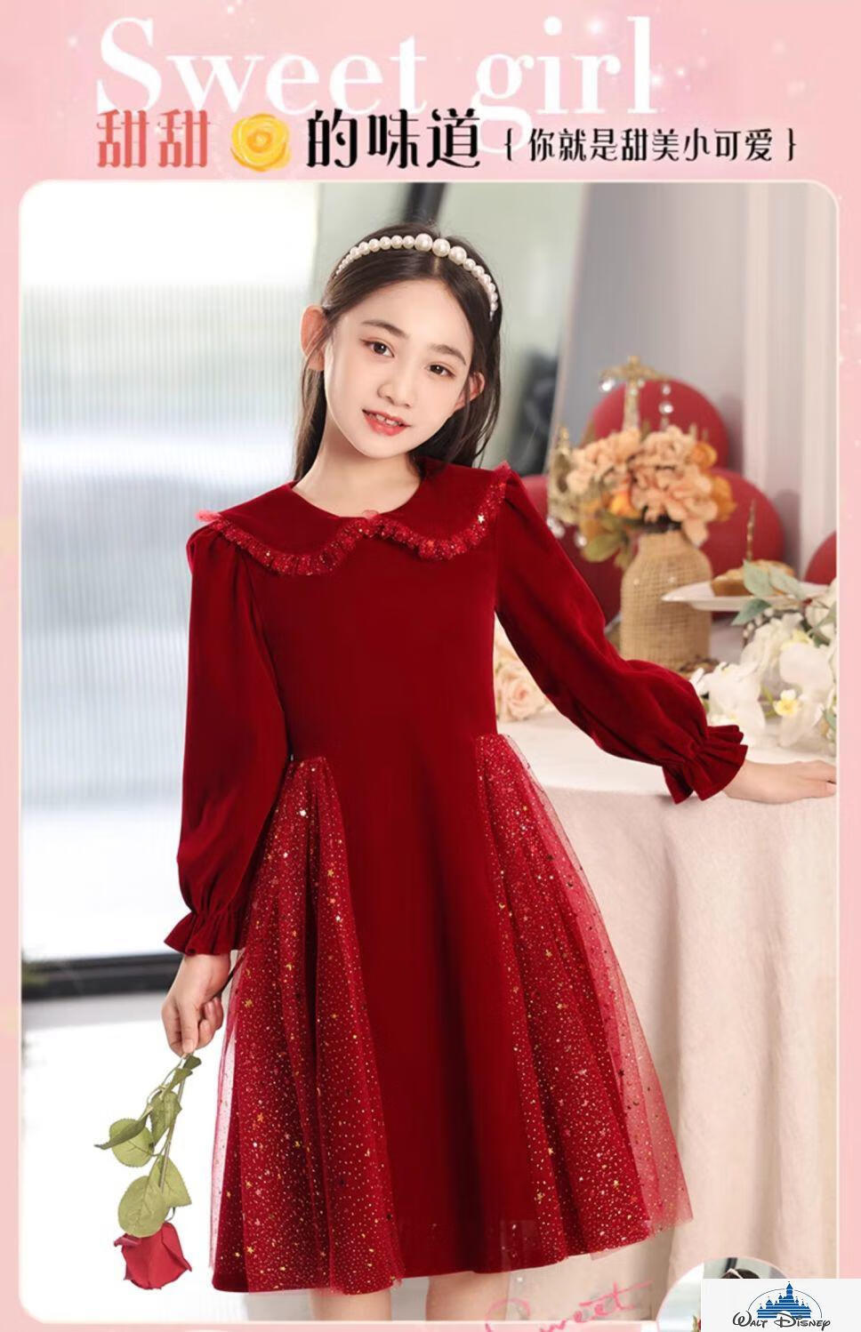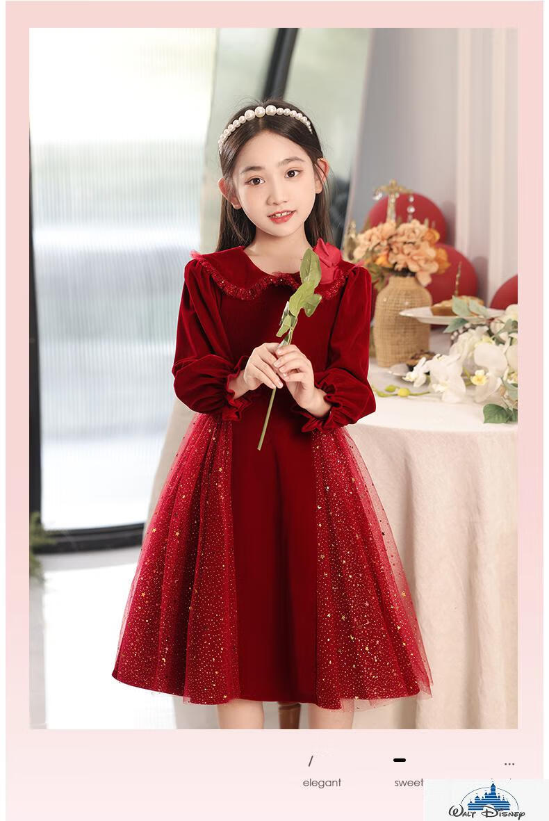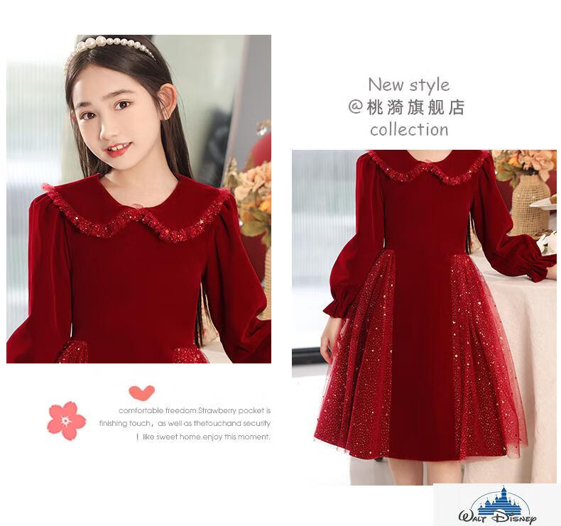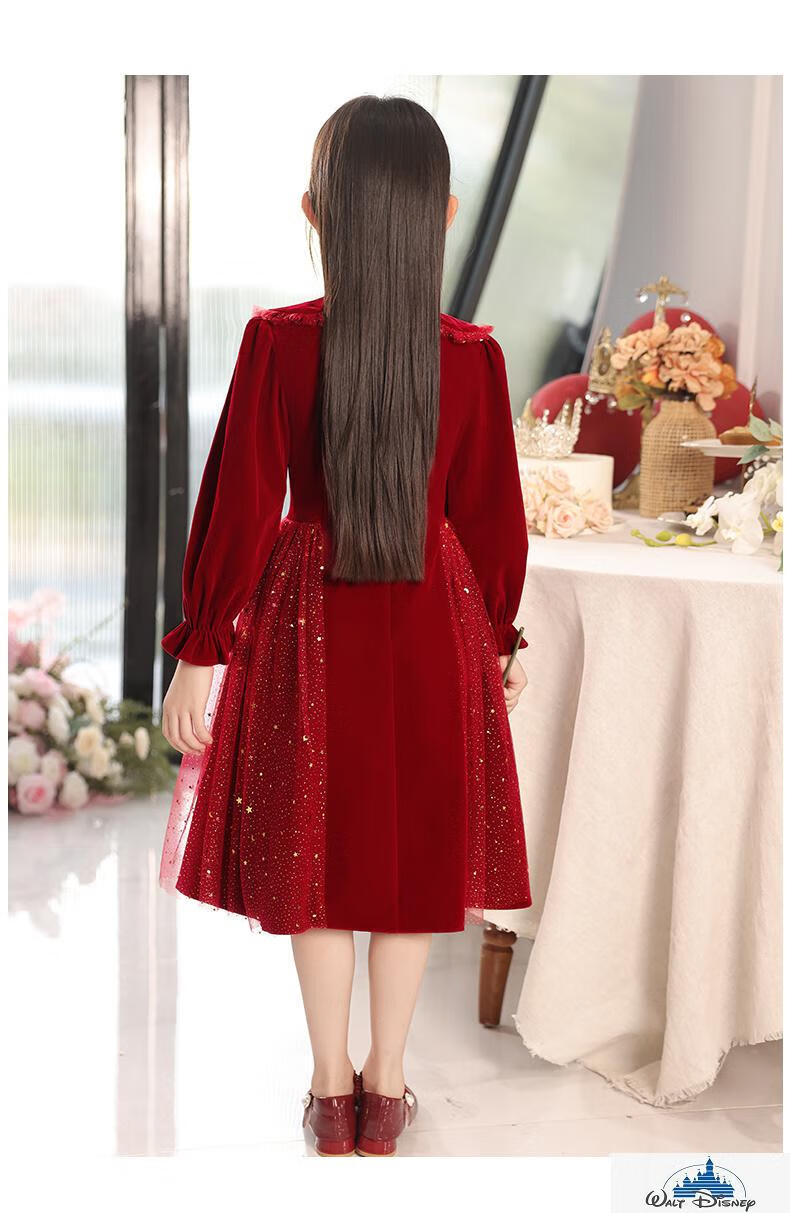 Disney (Disney) girls dress velvet children's skirt red princess dress host performance clothes autumn and winter long sleeves plus velvet red plus velvet 130