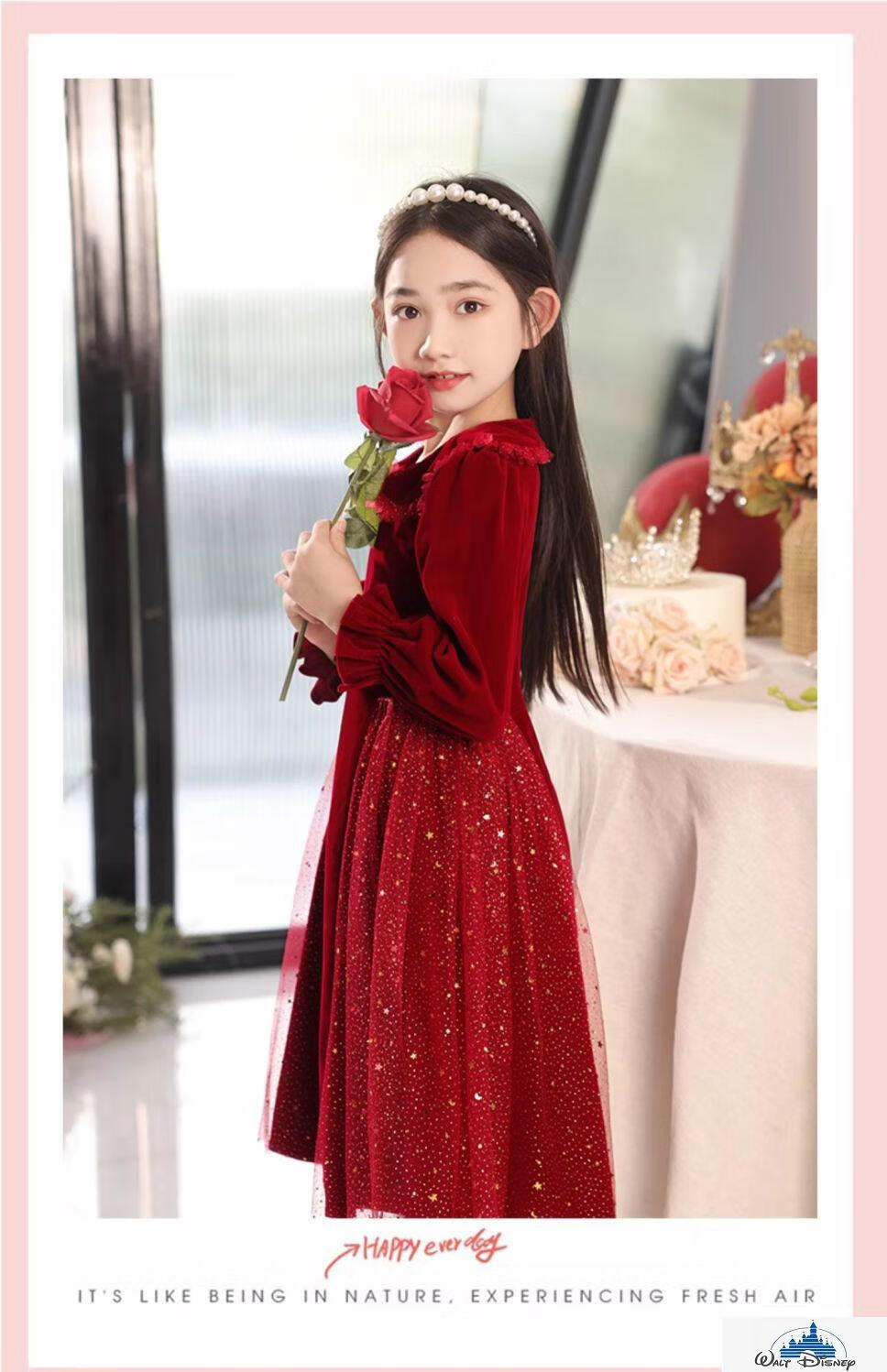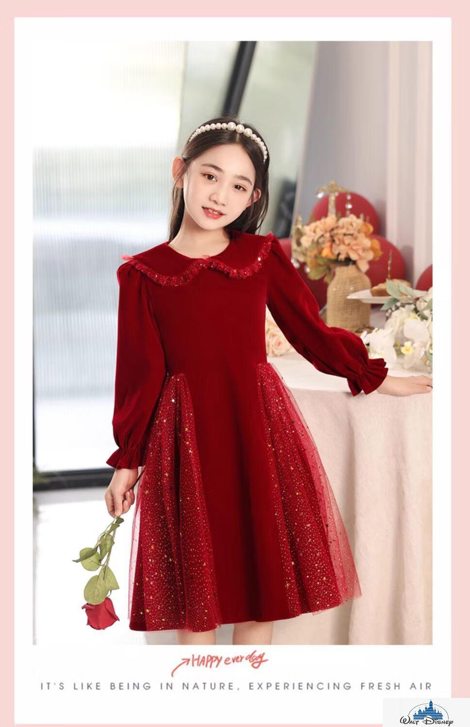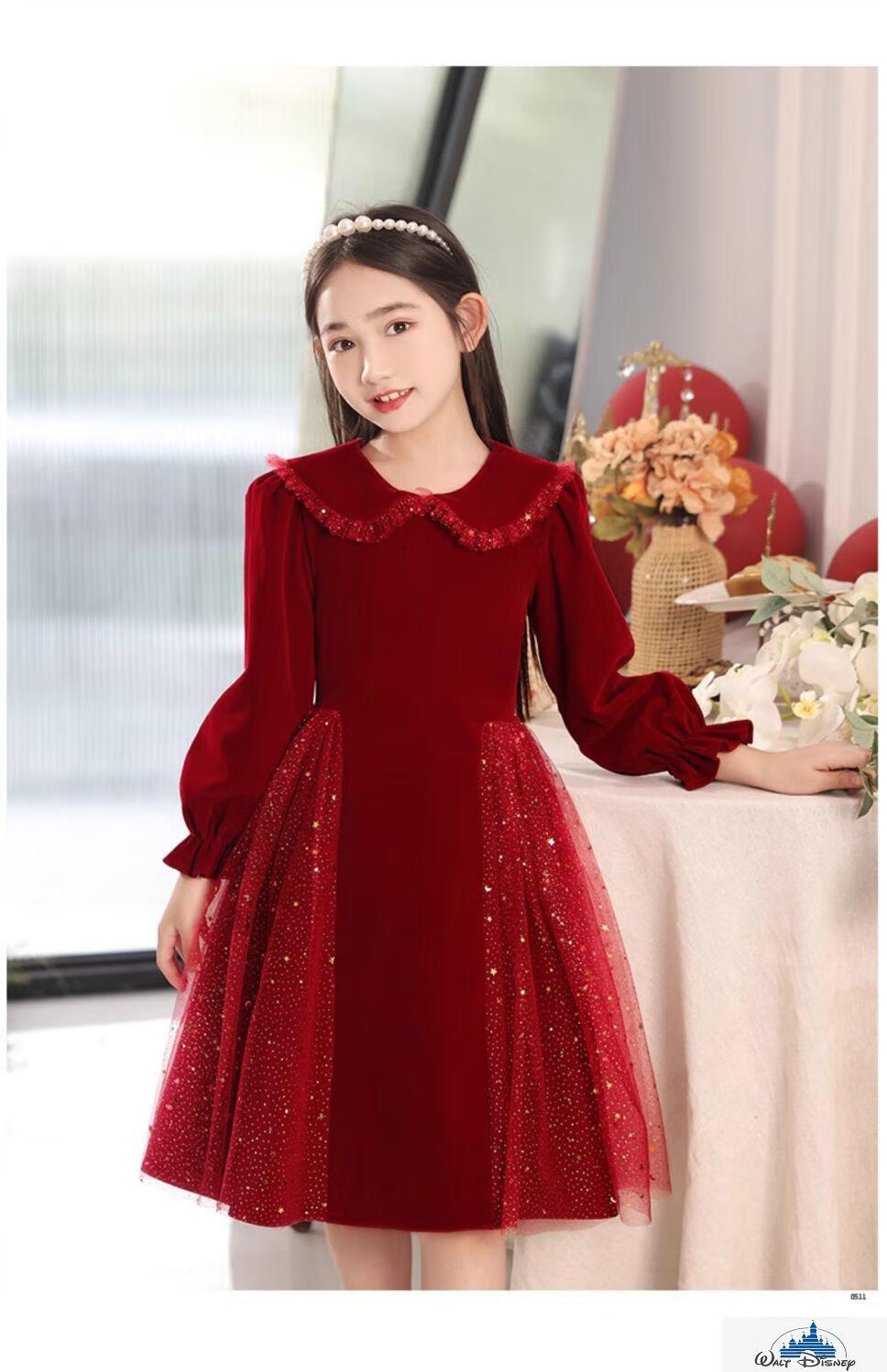 Disney (Disney) girls dress velvet children's skirt red princess dress host performance clothes autumn and winter long sleeves plus velvet red plus velvet 130